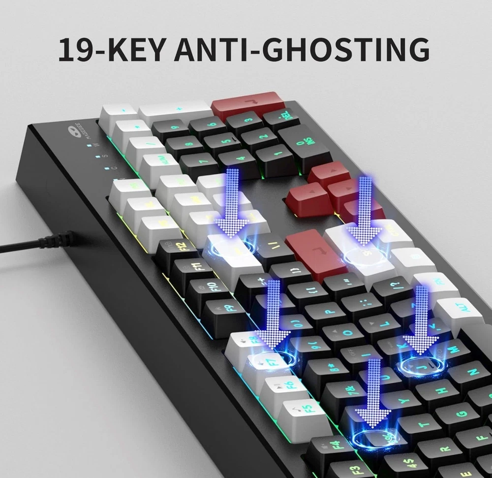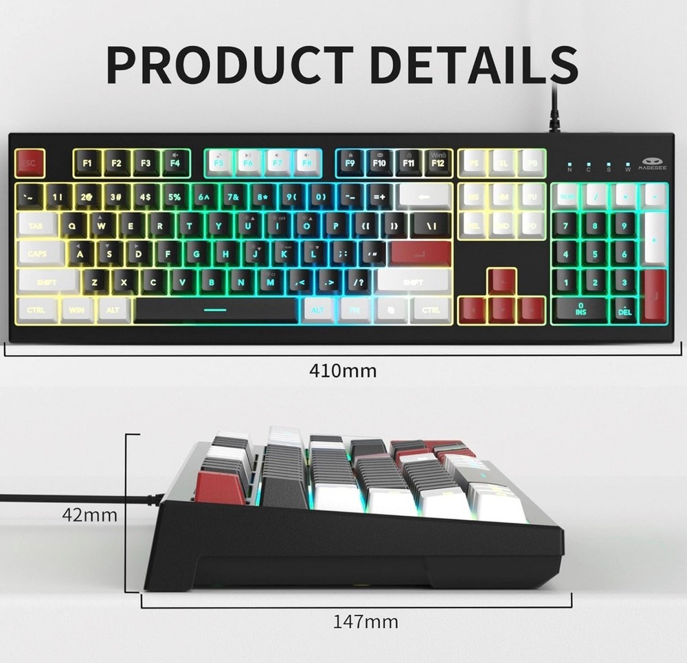 About this item 【RGB Lighting Keyboard and Mouse Combo】MageGee blue white keyboard with cool RGB lighting. Double Injection Keycap provide crystal clear uniform backlight and ergonomic curves, more advanced technology, clearer fonts and better light transmission.The bottom of the keyboard is designed with a foldable bracket, choose the height you need! 【Ergonomically Designed Gaming Work Keyboard】Carefully designed ergonomic high and low keys, suitable for long hours of hand tapping and typing, comfortable finger movement, smooth input without lag. By FN+F1-F12 combination. Quickly switch between multimedia playback, volume adjustment and other functions Convenient and fast! 【Comfortable Typing Experience and Full 104 Keys Anti-ghosting】MageGee blue white keyboard, that responds fast with no lag, this gaming keyboard and mouse combo will offer you wonderful tactile feedback on each keypress. The stepped layout can also provide you with an ergonomic angle for typing. Advanced anti-ghosting technology allows all 98 keys to work simultaneously to provide a fast typing response. 【19 KEYS ANTI-GHOSTING & 12 MULTIMEDIA SHORTCUTS:】19-key rollover allows you to press multiple keys simultaneously without issues. Multimedia combination keys ( Fn + F1-F12 ) achieve convenient operations, quickly access the music, email, website and other frequently used programs. You can also switch between the W A S D keys and the arrow keys by pressing FN + W keys to enhance the gaming experience. 【Strong Compatibility and After-Sales System】The product supports Win2000, Win XP, Win ME, Vista, Win7, Win8, Win10, Android, Linux, Mac and other operating systems. this device is plug and play, directly plug into the computer's USB port, you can use it. Product Description PLUG AND PLAY & WIDE COMPATIBILITY Just plug it into your computer USB port, and no need to install any drivers or software. The wired gaming mouse works well with Windows 10, Windows 8, Windows 7, Windows XP, WinME, Vista, Linux, suitable for PC, laptop, computer, notebook, etc. Double-Shot Keycaps with Transparent Character Design Double-Shot Keycaps with Transparent Character not only improve the transparency and wear resistance of characters,but also provide a better visual experience for players who like RGB backlighting. Funny RGB Backlight K2 keyboard adopts RGB backlight design,Players can freely customize multiple color effects, including monochrome, breathing light, wave light and other modes. These modes not only make the keyboard easier to use in dark environments, but also enhance the gaming experience and personalized needs Product information Package Dimensions 17.68 x 7.09 x 1.93 inches Item Weight 2.07 pounds Manufacturer MAGEGEE ASIN B0DQPVYMXK Date First Available December 17, 2024