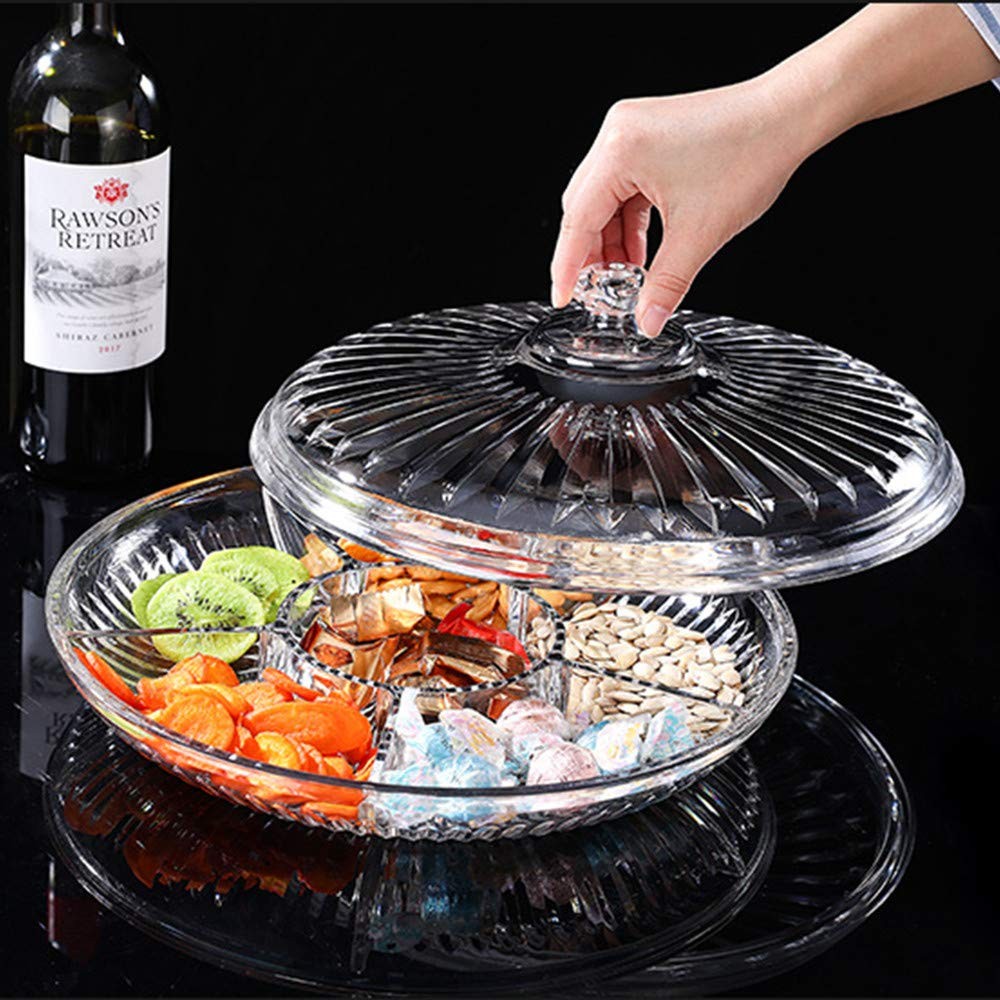 ✅Material : Made of High Quality Acrylic,Can directly contact the food,Durable,Easy to clean,Not Glass but looks like glass. ✅Material : Made of High Quality Acrylic,Can directly contact the food,Durable,Easy to clean,Not Glass but looks like glass. ✅Feature : Exquisite appearance, stylish and generous,Transparent texture, Good centerpiece for coffee table or dining table when guests come. Variety of snacks can be served in one. ✅Usage : Suitable for put candies, nuts,fruits,dried fruit,sunflower seeds, peanuts,snack and more.Suit for place on the tea table when you watch TV and movie. ✅Size : Diameter:12.5inch/32cm;Height:5.5inch/14cm ✅Package Included : 1 x Acrylic Service Tray with Lid (No food included!)