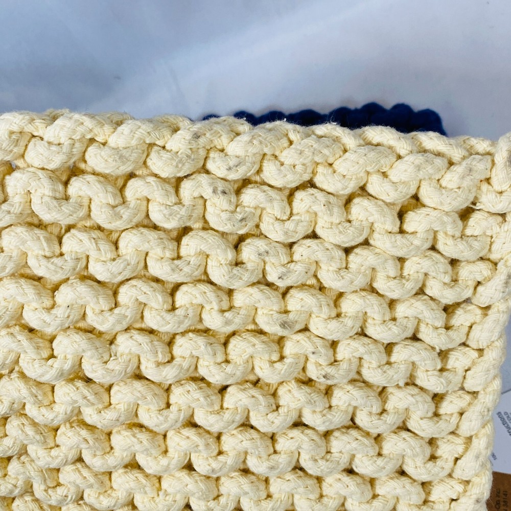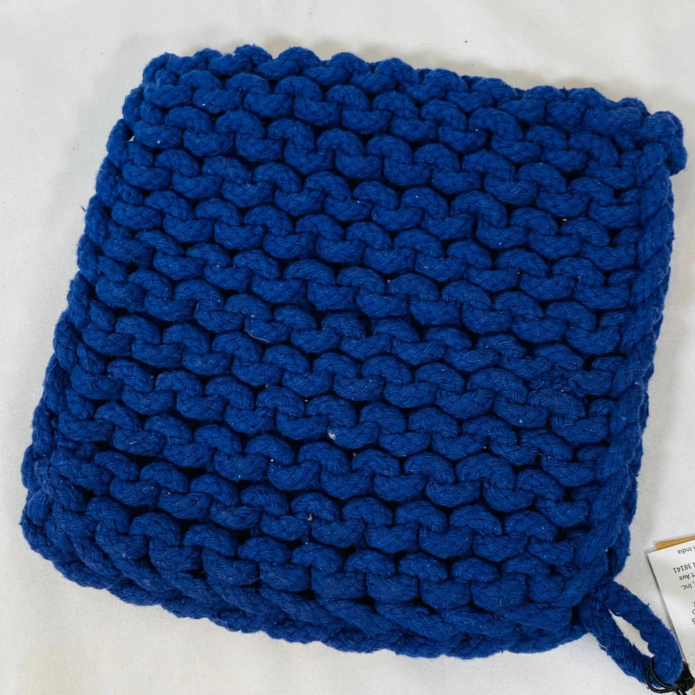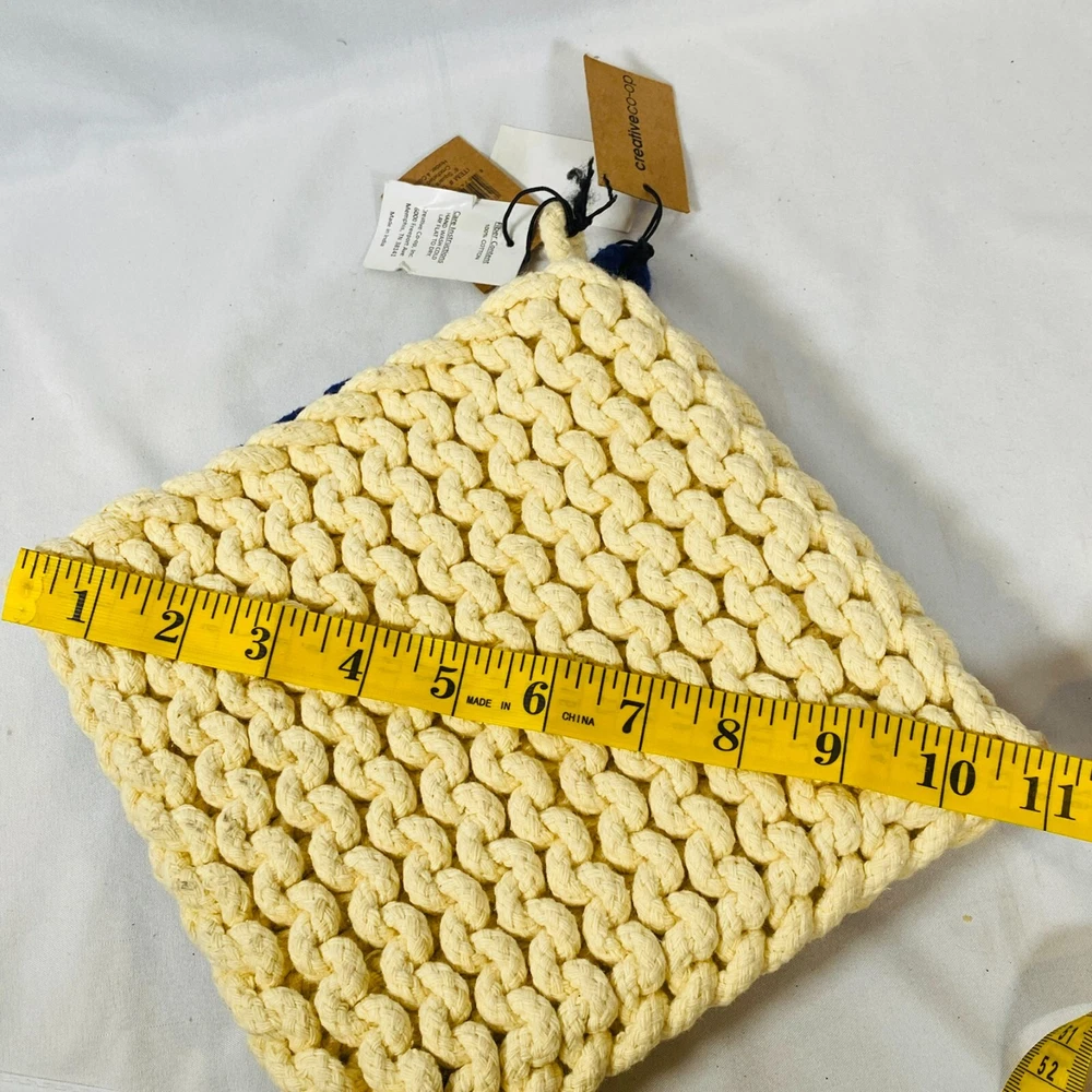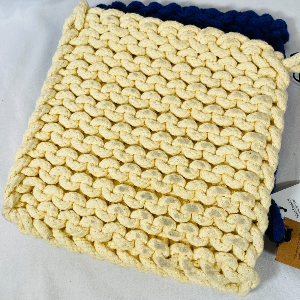 Set of 2 Creative Co-Op 8" Square Cotton Thick Crocheted Pot Holders. Includes 1 Cream/Beige + 1 Navy Blue Trivet-Style Potholders, made out of 100% Cotton. New with tags, but they were stored together so the cream one has what appears to be blue dye transfer from the other one. As they still have the tags attached, I haven't attempted to clean them, so it may wash out easily, not sure, sold as is. Either way, they are lovely thick potholders that will serve you well! Please see all pictures for exact cosmetic condition and other details, as they are part of the description as well, and ask any questions before purchasing. We are a husband and wife team with a growing family, and greatly appreciate your support of our small business. Please browse our eBay store for a variety of other kitchen equipment. We hope you enjoy this set!