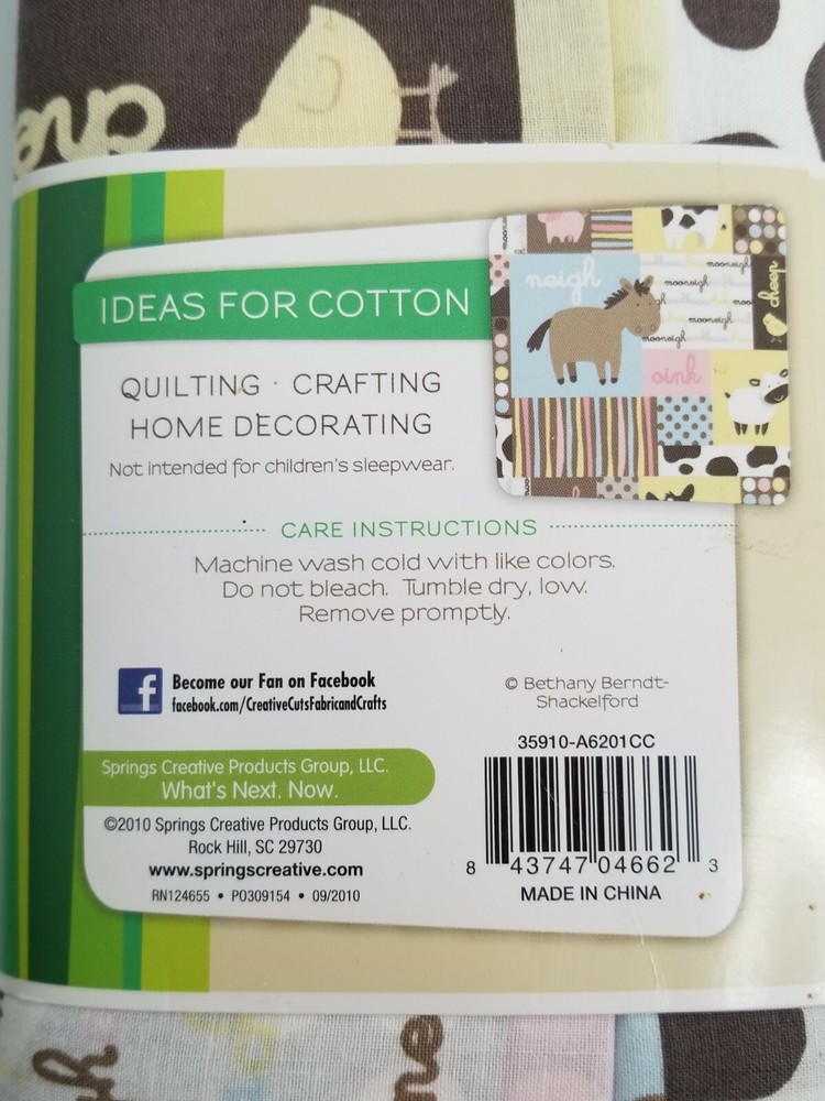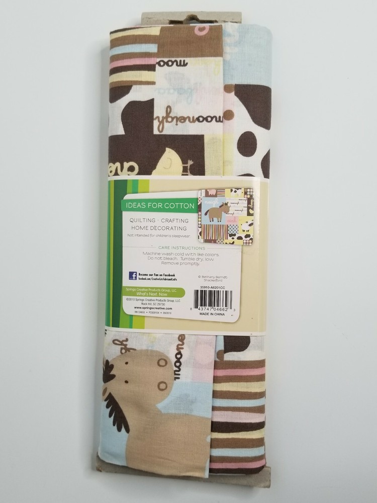 Creative Cuts 100% Cotton Prints 2 yards 72in x 44in Farm Barnyard Animals: Cow, Pig, Chick and their sounds. Too Cute! New in Package Shipping USPS is the service used for shipping. We ship to all 50 states and APO addresses International Buyers Import duties, taxes, and charges (typically collected upon delivery or pickup) are the buyer's responsibility and are not included in the item price or shipping charges. Please check with your country's customs office prior to bidding/buying to determine what these additional cost will be. Terms If you have any questions or need information, please feel free to email us via the link above. Please don't forget to check out all my auctions. Good Luck!