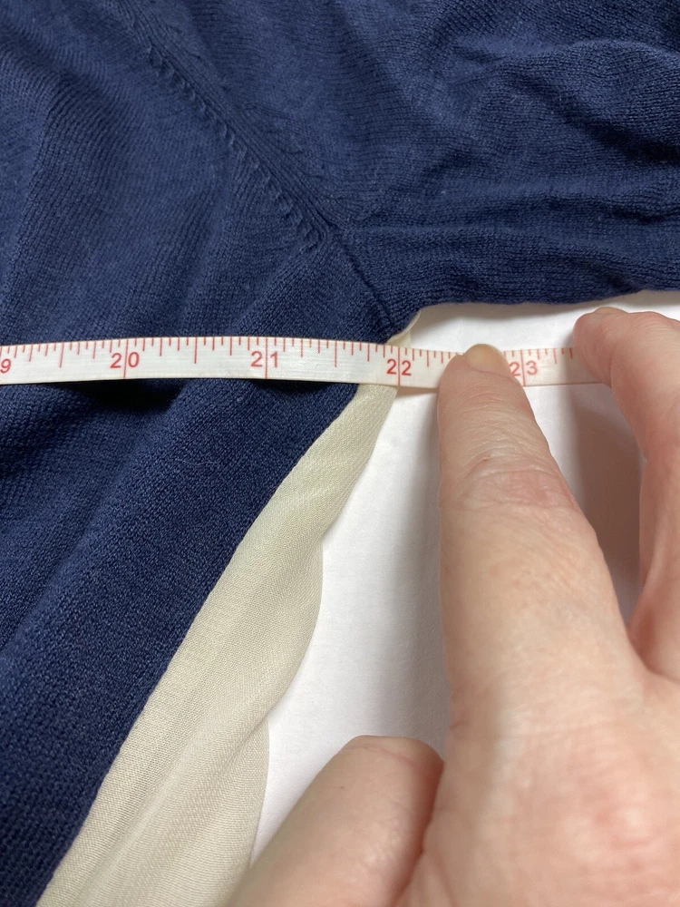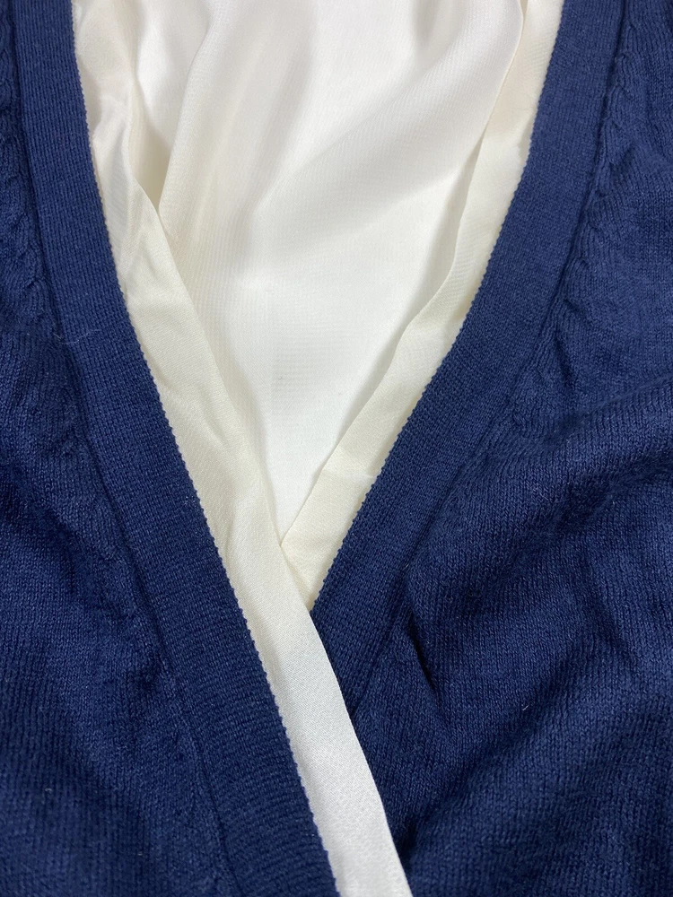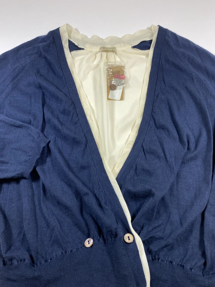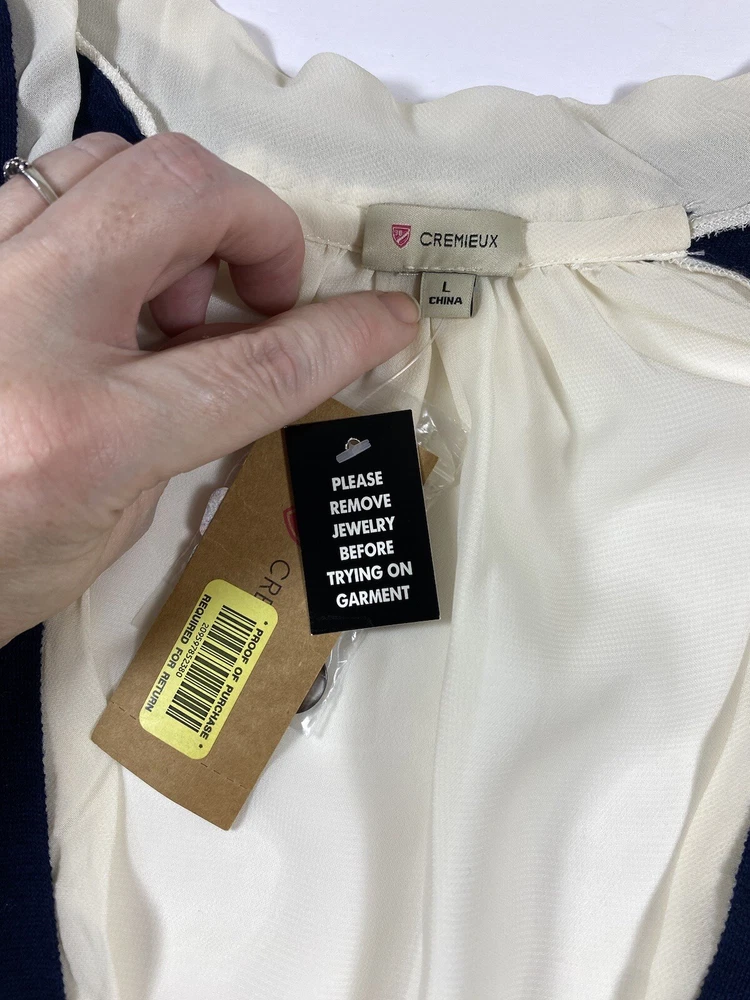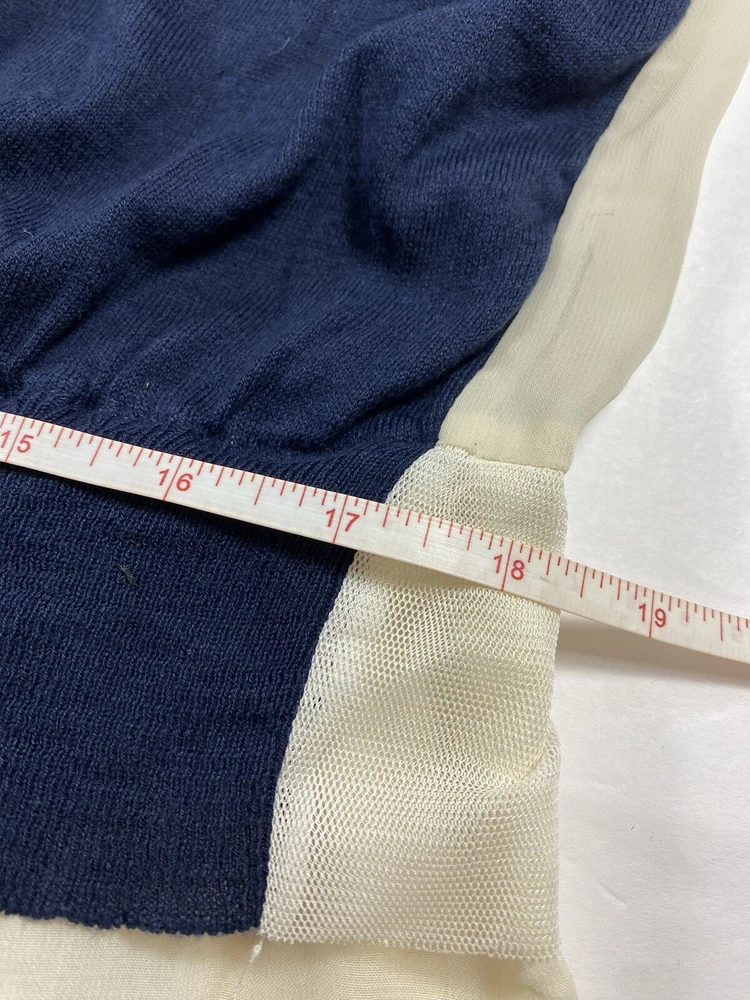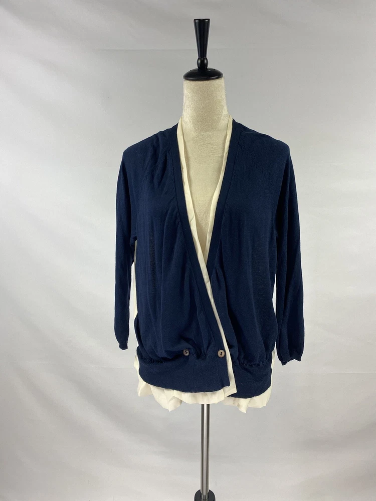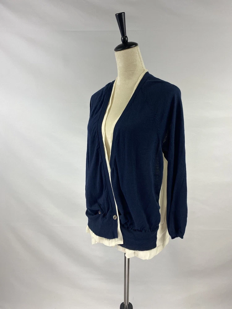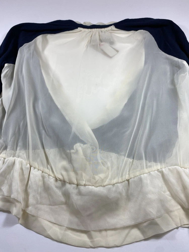 NWT Cremieux mixed media cardigan sweater in navy knit & cream chiffon V-neck, long sleeve, buttons at waist, sheer back with ruffle hem Fabric Content - Knit: 100% cotton, Chiffon: 100% polyester Care Instructions - Hand wash, flat dry See photos for condition - this is brand new with tags still attached, no flaws Size Large - See photos for measurements