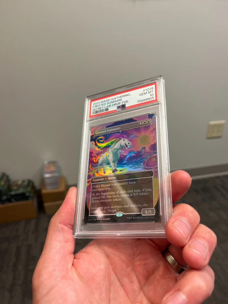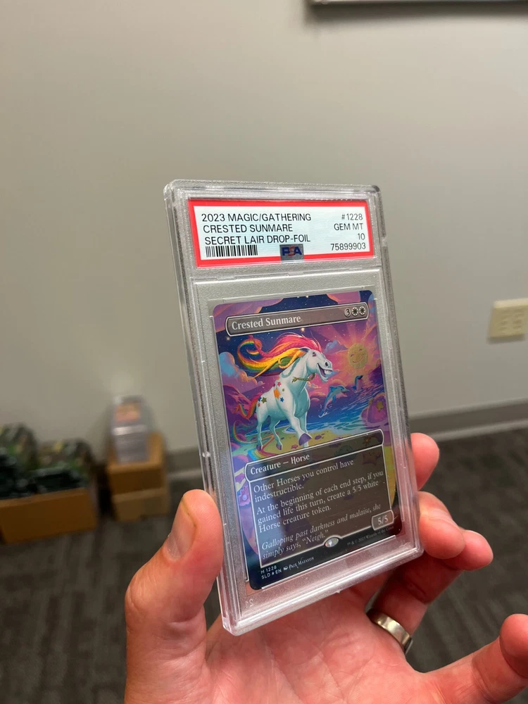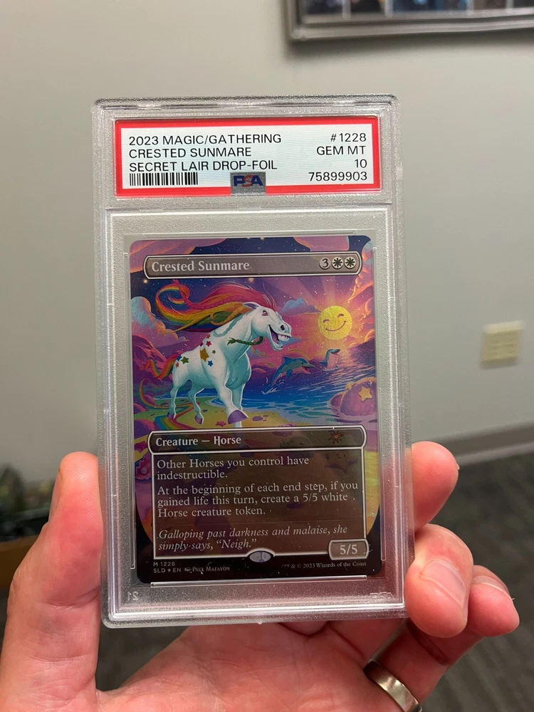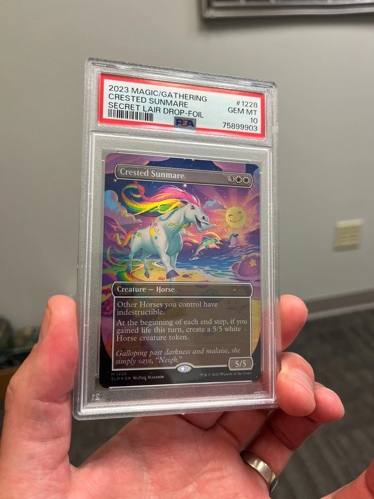 The product is a 2023 Crested Sunmare card from the Magic: The Gathering Secret Lair Drop series. This particular card features a borderless design and is a foil version, adding a special shine to the artwork. Collectors and players of Magic: The Gathering may be interested in adding this unique and visually appealing card to their collection or deck.