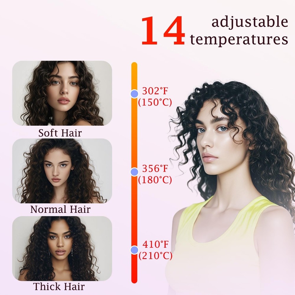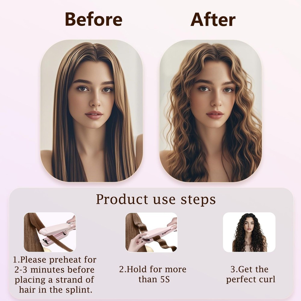 Crimper Curling Iron, 2 Barrel Hair Waver Anti-Scald, 5/8 Inch Rapid Heating Curler, 16 MM Wave Iron, Temp Adjustable Wand for Mid-Length and Long Hair Product Details Product Benefits: Protects hair and saves time with rapid heating Brand: Lam(MS)pen Hair Type: All Power Source: Corded Electric Heater Surface Material: Ceramic Product Dimensions : 13.78 x 2.36 x 2.36 inches; 1.12 Pounds Date First Available : March 17, 2025 Manufacturer : Lam(MS)pen Best Sellers Rank: #227,890 in Beauty & Personal Care (See Top 100 in Beauty & Personal Care) #54 in Hair Waving Irons #54 in Hair Waving Irons Customer Reviews: 4.2 4.2 out of 5 stars 14 ratings Ceramic Hair Iron:The surface of the hair crimper is ceramic coated, which will add shine and moisture to the hair. Minimizing your hair damage problems. Even heat distribution helps smooth frizz. Makes hair look healthier Anti-scald Design: The top of the wave curling iron has an anti-scald design that protects your fingers from being burned during curling. The 360-degree swivel cord allows you to operate the hair curler from any angle. You can lock the hair waver to save the space when storing Adjustable Temperatures:14 adjustable temperatur for all hair types. 212F/338F is suitable for fine and soft hair, 374 F/410F for normal hair and 446 F for thick hair. Tap the power button to add the temperature Easy to Use: This crimper hair iron will help you curl your hair effortlessly. Even inexperienced people can create beautiful waves with this curling iron. Just place the hair on the splint, press and hold, repeat it and you will get stunning daily waves with just one clamp Fast Heating: The french wave curling iron is used PTC heater with fast heat up, saving your waiting time.