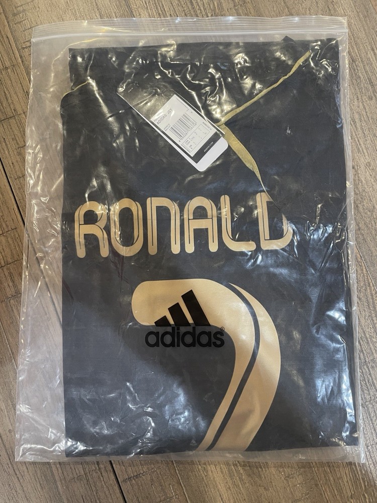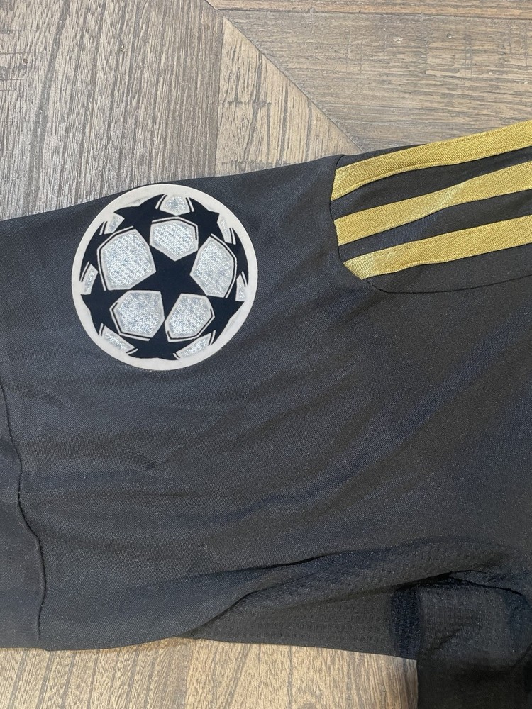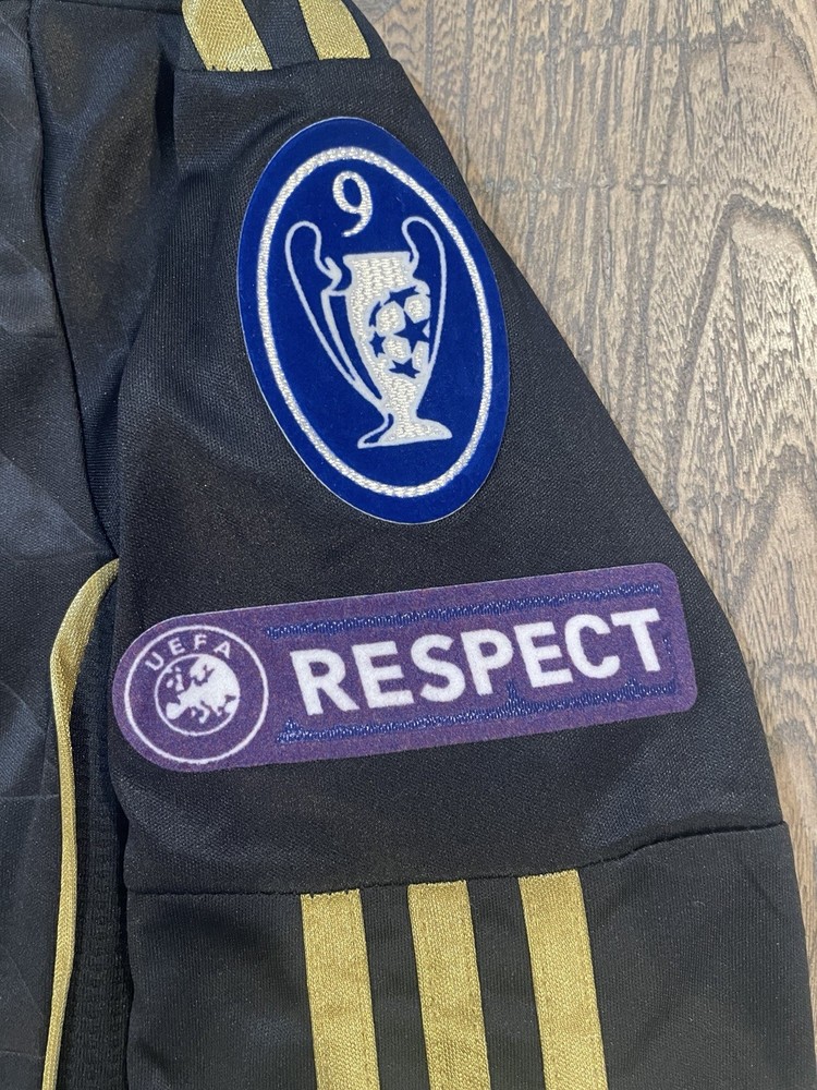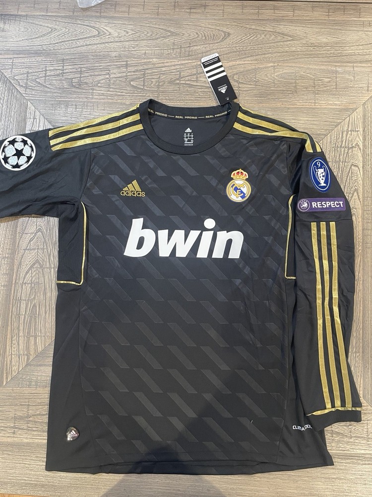 The product is a Cristiano Ronaldo Real Madrid 2011/2012 Away Long Sleeve Jersey in size L. Made by adidas, it features the iconic black and gold colors associated with Real Madrid. The jersey is designed for men and is specific to Cristiano Ronaldo, a legendary soccer player who helped lead Real Madrid to Champions League victory during that season. It is a collectible item for fans of both Cristiano Ronaldo and Real Madrid, making it a valuable piece of sports memorabilia for enthusiasts of international club soccer.