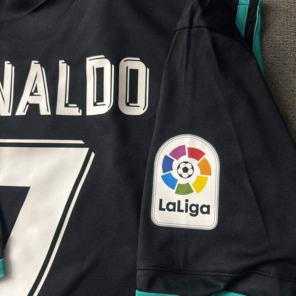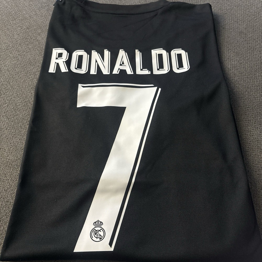 The product is a Cristiano Ronaldo Real Madrid Away Jersey for the 2017/2018 season, designed by Adidas in a black color. This medium-sized kit is specifically tailored for men and represents Real Madrid, a prominent international soccer club. Made in Vietnam, this jersey is a must-have for Cristiano Ronaldo fans looking to support their favorite team in style.
