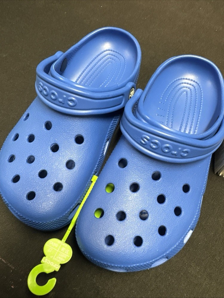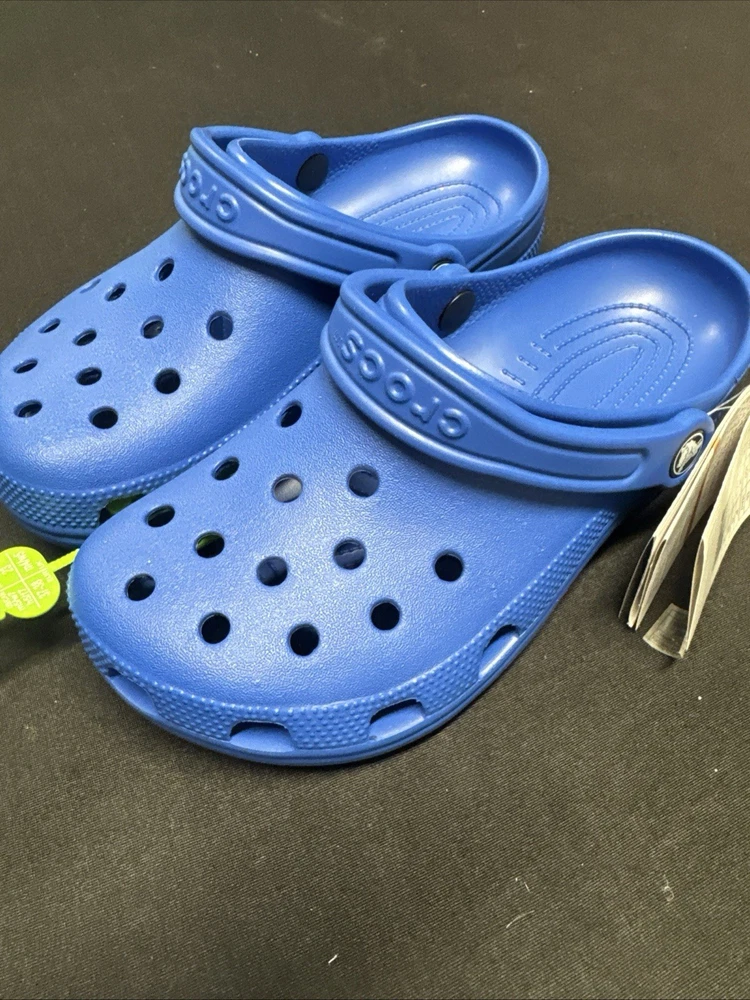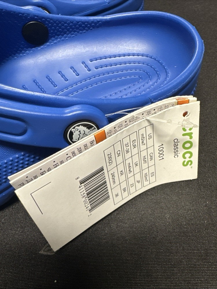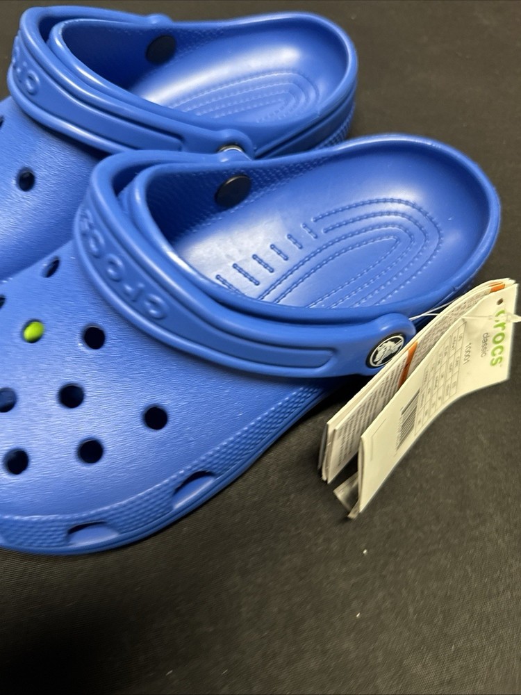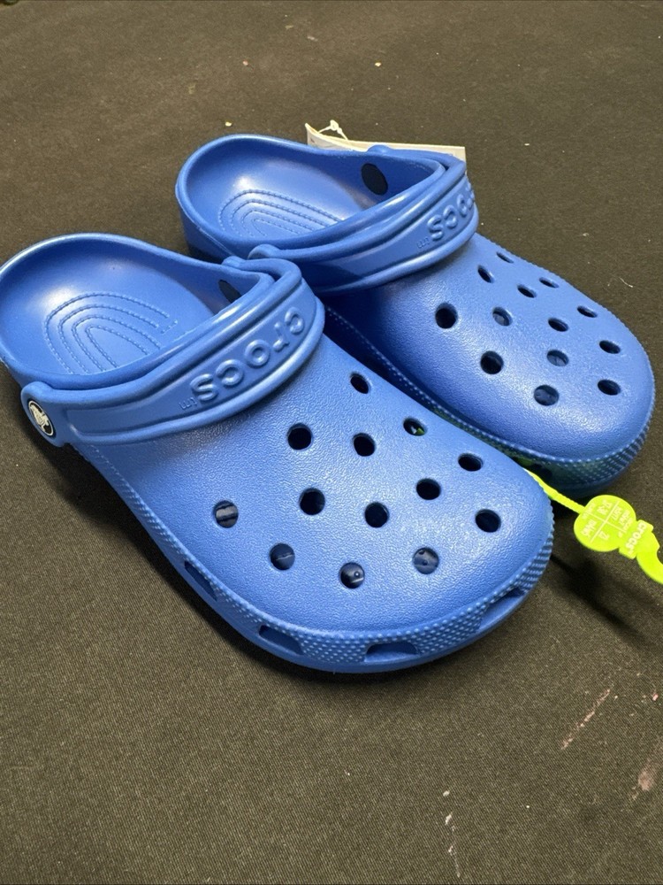 The product is a pair of Crocs sandals in size 5 for men, featuring a slip-on style in a vibrant blue color. Made with rubber as the upper material, these Crocs are designed for fast shipping with tags included for easy identification. Perfect for those looking for a comfortable and stylish sandal option.