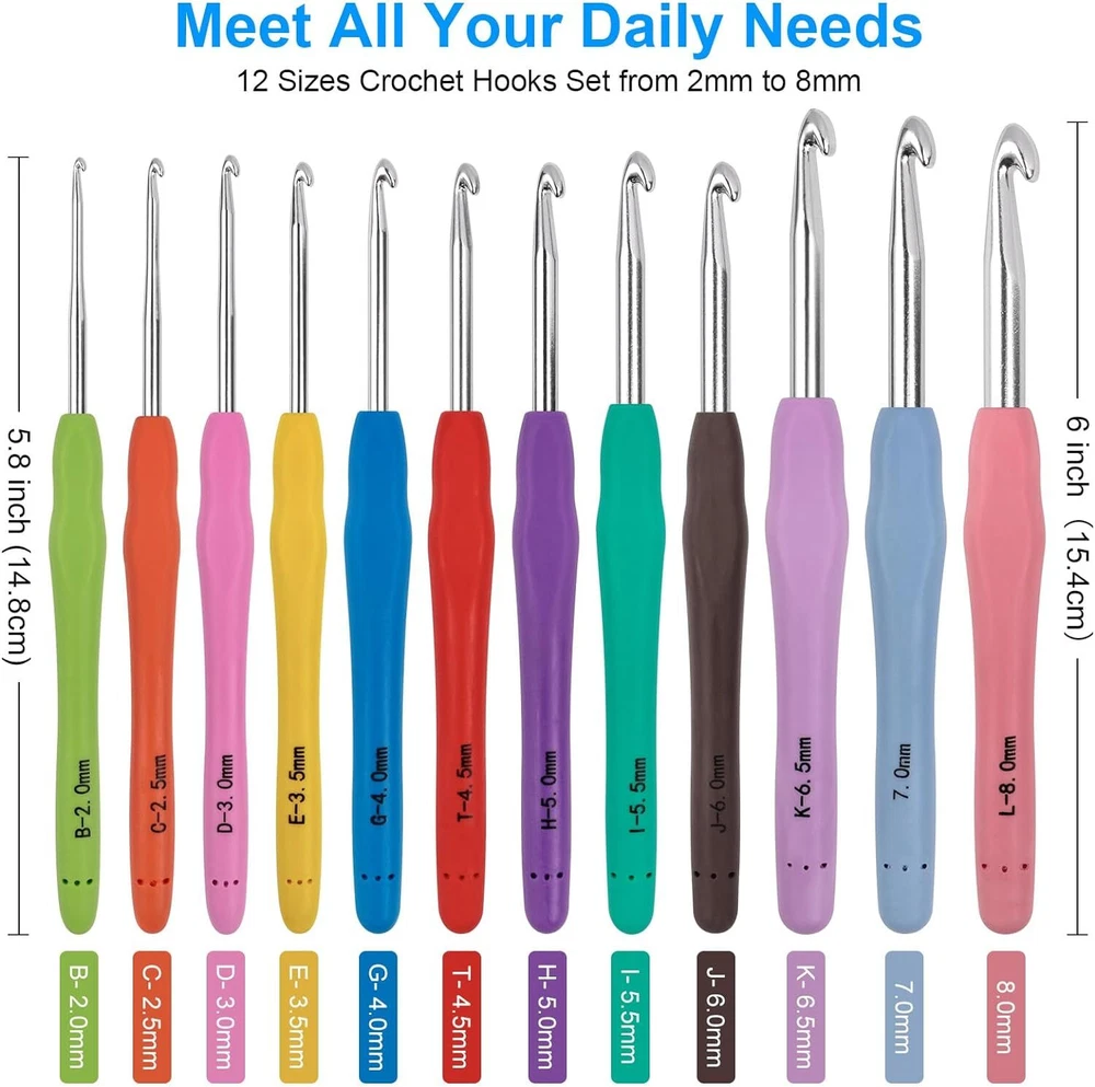 [Versatile Crochet Set] This comprehensive crochet kit includes everything you need for your crocheting projects: 12 Crochet Hooks (2mm to 8mm) for all your crafting needs 25 Colorful Stitch Markers (random colors) 9 Darning Needles 1 Pair of Scissors (random color) 1 Row Counter 1 Crochet Ring Cutter (random color) 1 Measuring Tape 1 Blue Crochet Hook Case The ultimate kit for beginners, experienced crocheters, and anyone in need of high-quality crochet supplies! [Premium Quality Materials] Durable Aluminum Hooks: Crafted for long-lasting use. Ergonomic Silicone Handles: Soft and comfortable, these grips reduce hand fatigue during extended sessions. Sturdy Construction: The deeply embedded aluminum hook ensures it won’t loosen or fall out, offering better durability compared to plastic hooks. [Comfortable & Ergonomic Design] Say goodbye to discomfort and hand cramps! The ergonomic silicone grips provide a firm, comfortable hold, making these hooks perfect for beginners and those with arthritic hands. Enjoy longer crocheting sessions without strain. [Smooth and Longer Hooks for Efficiency] Snag-Free Crocheting: The polished hooks glide effortlessly through yarn without snagging or splitting fibers. Extra Space: Longer hooks provide more room for multiple loops, ensuring faster, smoother progress on your projects. Ideal for both intricate patterns and simple designs! [Double-Sided Size Markings] Never guess the size again! Each hook features both printed and engraved size markings , ensuring the size remains visible and doesn’t fade over time. [Compact & Portable] Store your crochet tools in the included blue case , designed for easy organization and portability. Lightweight and compact, it’s perfect for taking your crochet projects on the go, whether you’re traveling or crafting outdoors. [Perfect Gift for Crocheters] This crochet starter kit is a thoughtful gift for beginners and seasoned crocheters alike. Celebrate birthdays, anniversaries, or holidays by giving a kit that inspires creativity and relaxation. Perfect for friends and family who love crafting! Product Description Mecheer Crochet Hook Set with Case The ultimate crochet kit for beginners and experts alike. Whether you’re looking for ergonomic hooks, smooth operation, or a portable design, this kit has it all! Product Features Smooth, Durable Hooks: High-quality materials ensure snag-free, efficient crocheting. Soft Ergonomic Handles: Reduce fatigue for a more comfortable crafting experience. Double-Sided Size Markings: Easy identification, with engraved marks that never fade. Portable Storage Case: Organize and carry your tools wherever you go. Package Contents 12 Crochet Hooks: 2.0mm x1 2.5mm x1 3.0mm x1 3.5mm x1 4.0mm x1 4.5mm x1 5.0mm x1 5.5mm x1 6.0mm x1 6.5mm x1 7.0mm x1 8.0mm x1 Accessories: 25 Stitch Markers (random colors) 9 Darning Needles 1 Crochet Ring Cutter (random color) 1 Pair of Scissors (random color) 1 Row Counter 1 Measuring Tape 1 Blue Crochet Hook Case Transform your crochet experience with the Mecheer Crochet Hook Set —a must-have for anyone passionate about crafting!