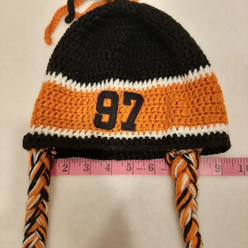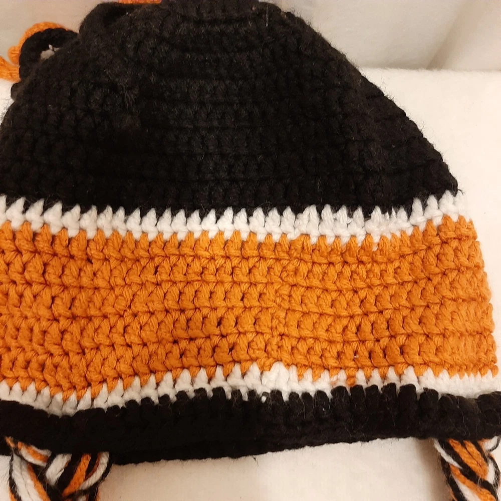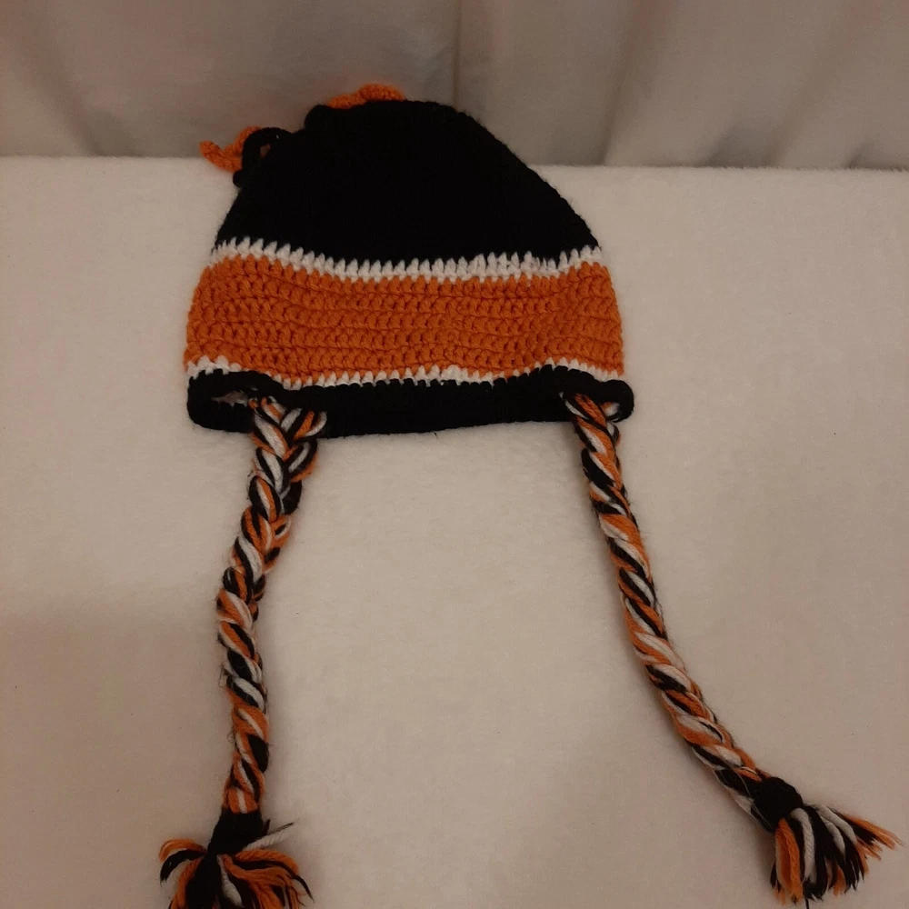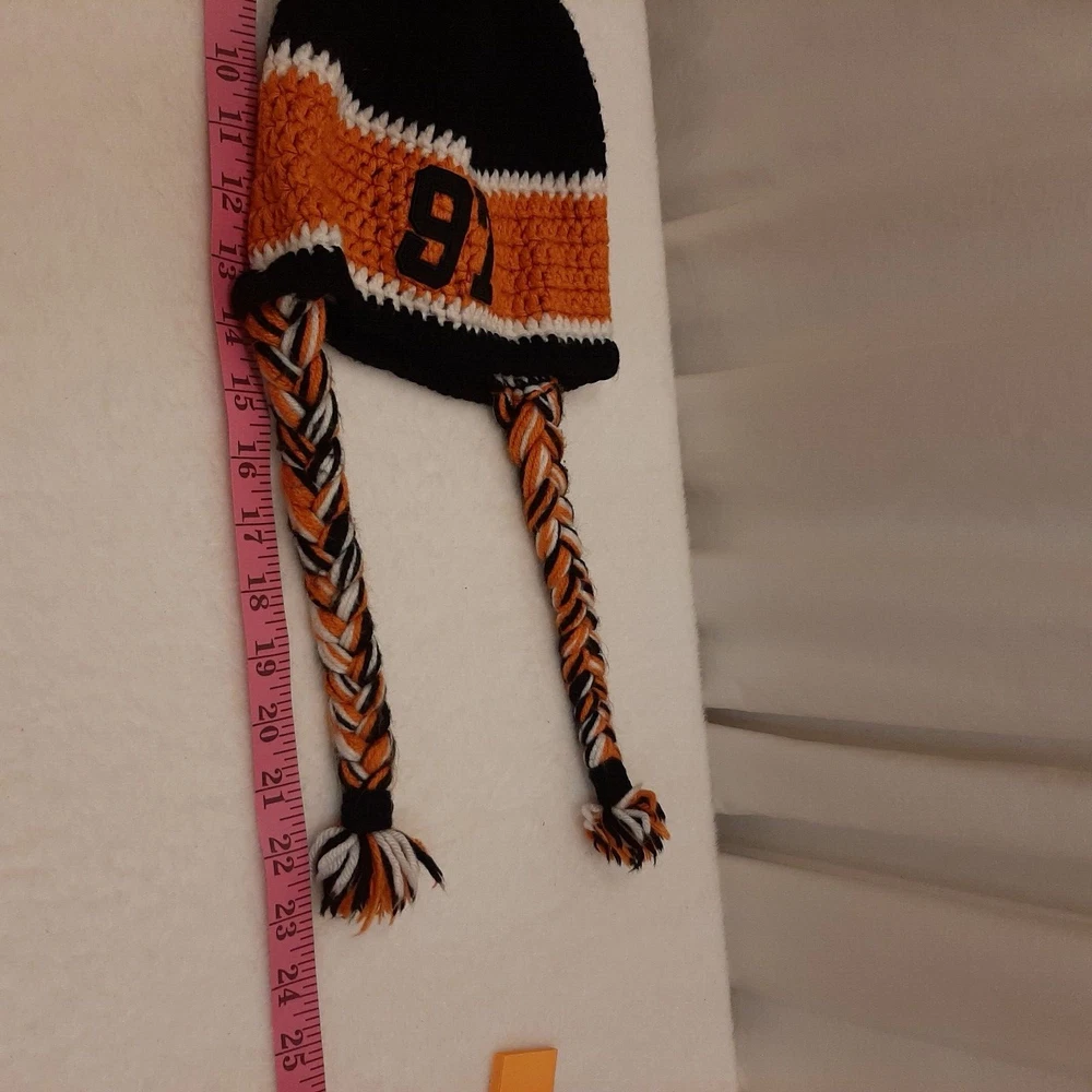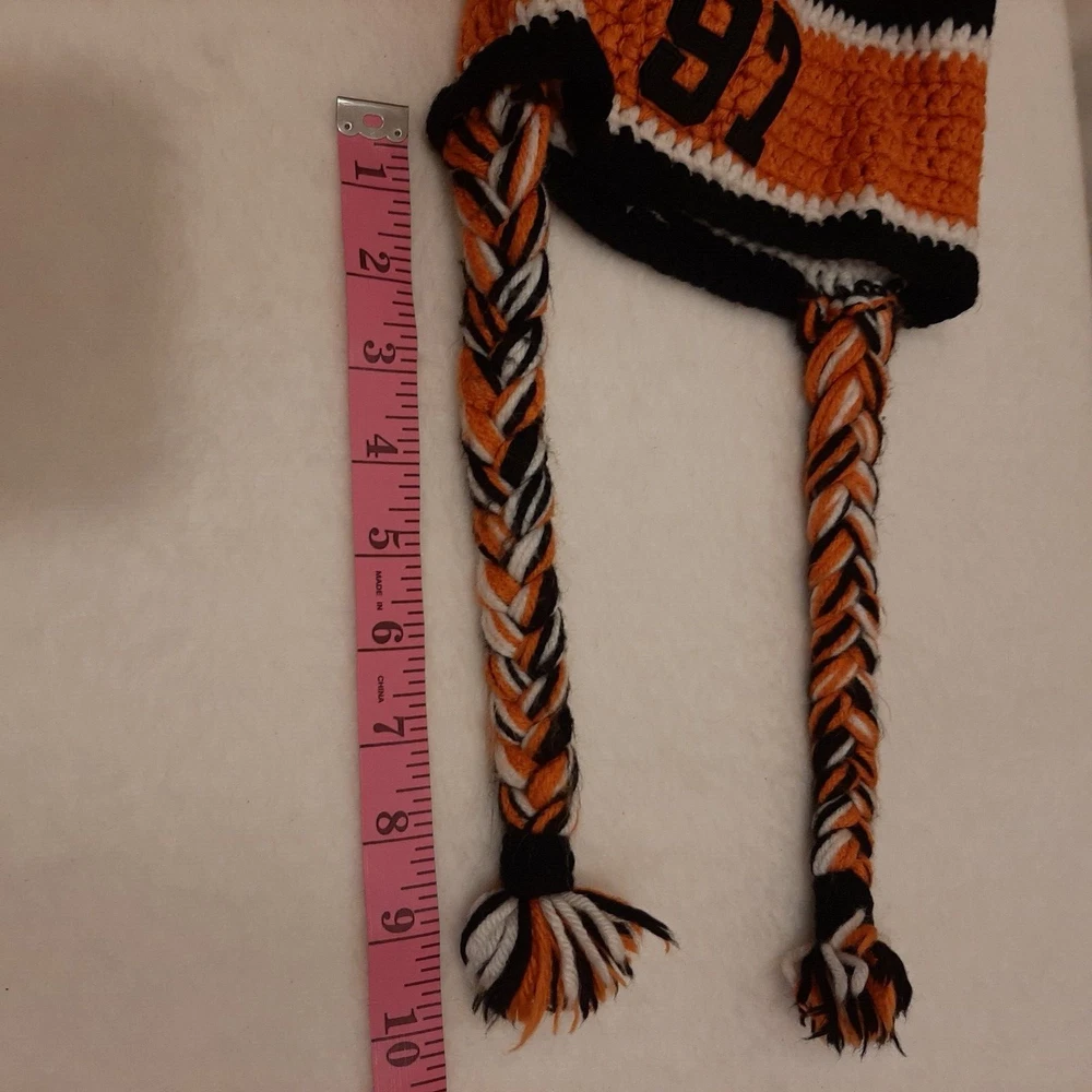 Teen/Adult Crochet Knit Bangel Color Orange Black White With Braids #97 Decal In good pre-owned condition may show signs of wear from use/handling/storage/display. Please view all pics for condition/details/flaws/issues. SOLD AS IS There is marks/spots/dirt/debris/Fuzz/ware to material please see photos 2-12, please see all photos for condition/issues/details. III