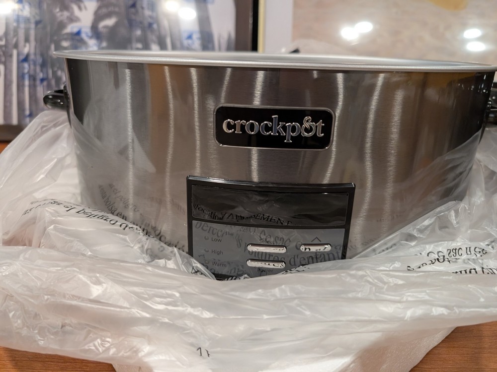 The Crock-Pot Large 8-Quart Programmable Slow Cooker in Black stainless is an electric oval-shaped slow cooker with a maximum timer setting of 20 hours. It features a programmable hand control, LCD display, digital timer, keep warm function, and stay-cool handles. The stainless steel cooker includes a pot, lid, and base, with dishwasher-safe components. It operates at 1500 watts with 110 volts and has three settings/programs for versatile cooking options.