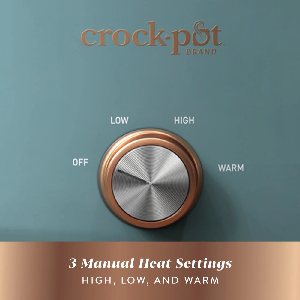 Product details meals, like soups, stews, chili, and more. The sophisticated Reflections Green color makes the slow cooker as stylish as it is functional, and adds a touch of modern elegance to your kitchen. Choose from 3 heat settings—High, Low, and Warm—for cooking flexibility and control with whatever you’re making. The 7-quart capacity feeds 9+ people and is perfect for making family meals. Use the manual Warm setting to keep food warm while you are serving, or for heating up leftovers. The removable stoneware is oven-safe up to 400 degrees F, so you can put it in the oven to add a delicious finishing crisp to your favorite meals. When cooking is done, both the lid and stoneware can be placed in the dishwasher for easy cleanup. For moments, memories, and meals worth sharing, make it with the Crock-Pot brand! Crock-Pot Manual 7-Quart Slow Cooker, Reflection 3 Manual Heat Settings: Choose from High, Low, and Warm, for cooking flexibility no matter what you're making 7-Quart Capacity: Feeds 9+ people and is perfectly sized for roasts and meals for entertaining a crowd Keep Warm Setting: The manual Warm setting allows you to keep your food at serving temperature when it's time to eat Oven-Safe Stoneware: Removable stoneware is oven-safe up to 400 degrees F Dishwasher-Safe: Stoneware and lid are both dishwasher-safe for easy cleaning Durable Finish: Fine sand texture in a modern Reflections Green color
