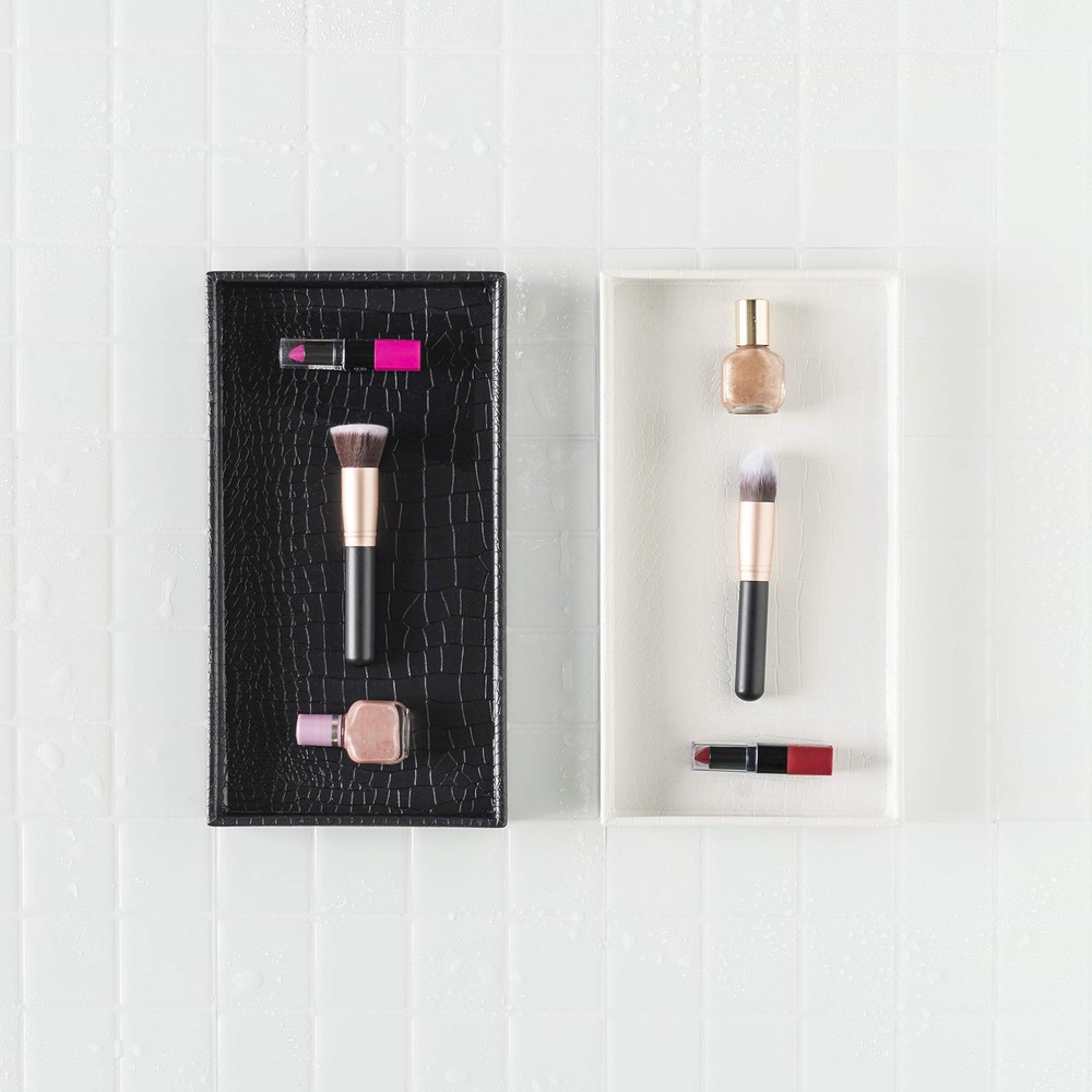 Home Basics Crocodile Plastic Vanity Tray For Jewelry, Make up, Perfume, Cosmetics, Bathroom or Dresser Organizer, (White) SAVES COUNTER SPACE: Tired of cluttering your sink space with random perfume bottles, jewelry, and makeup? This bathroom vanity tray helps you neatly store your beauty essentials without taking up much room on your counter. STURDY AND DURABLE: Made from sturdy plastic, this decorative bathroom tray features tall side walls to prevent items from falling off while carrying. DOUBLES AS A SERVING TRAY: Not just for the bathroom, this versatile tray can also be used as a serving tray for passing around small appetizers and desserts at your next party. FAUX CROCODILE DESIGN: This vanity tray boasts a chic and stylish embossed faux crocodile design, adding a touch of luxury to your home. MULTI-PURPOSE USE: Perfect for organizing cosmetics, jewelry, and toiletries on your dresser or vanity, while also ideal for serving snacks and drinks during gatherings.