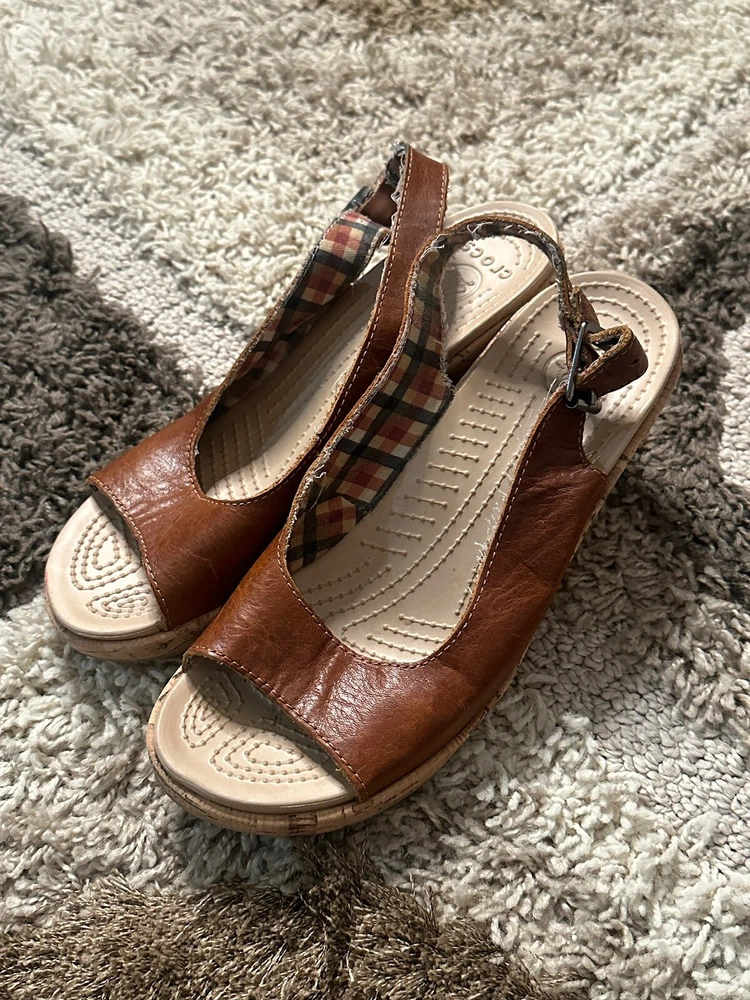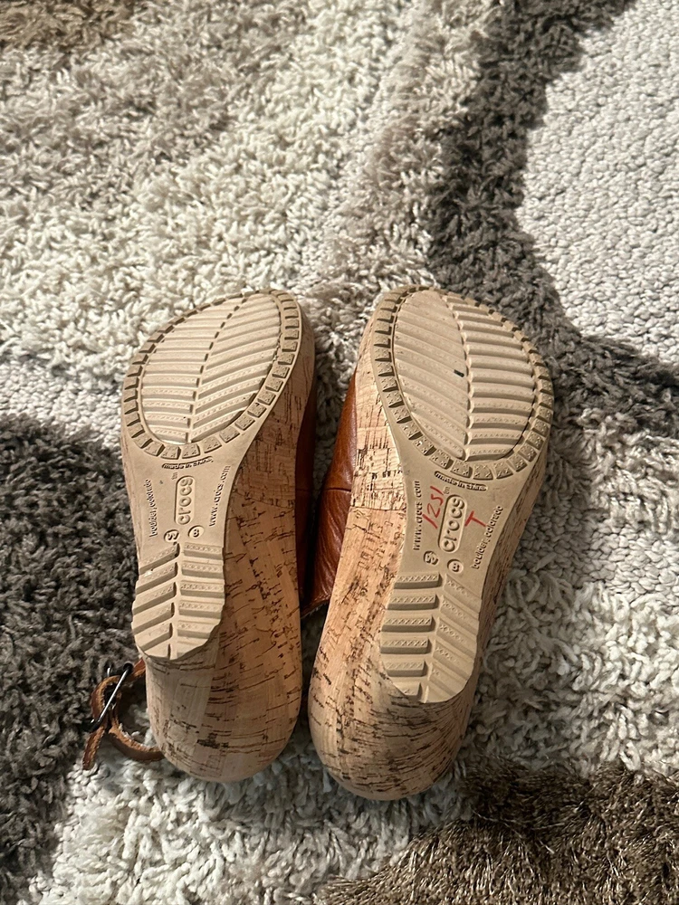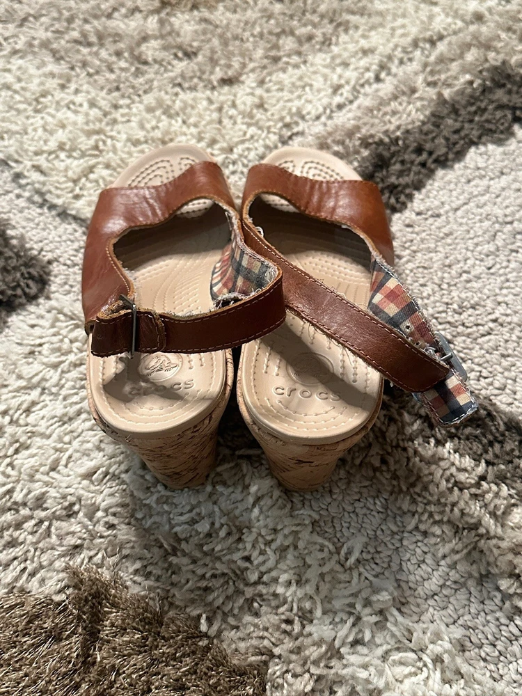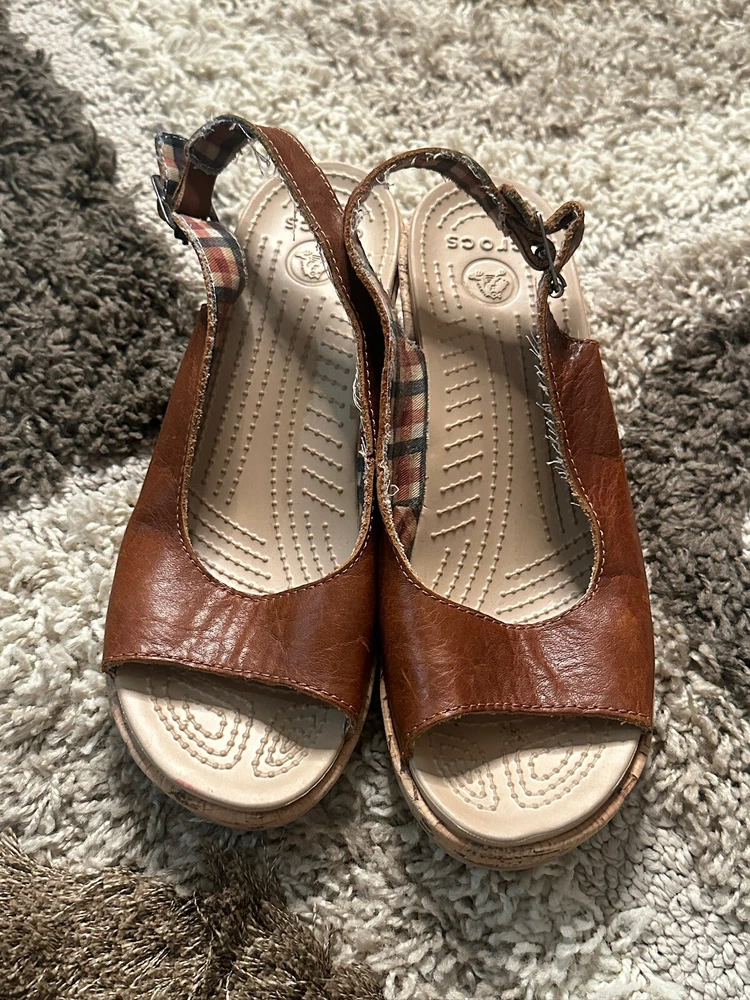 Elevate your style with these beautiful brick red Crocs A-Leigh slingback sandals. The adjustable strap and buckle closure provide a comfortable and secure fit, while the cushioned insole and cork outsole offer a comfortable and stable ride. These sandals are perfect for any casual occasion and will surely become a staple in your wardrobe. The upper material is made of high-quality leather and the lining material is also leather. The wedge heel style adds an extra boost of confidence to your look and the platform height is .75 inches. The shoe width is standard and the product line is Crocs A-Leigh.