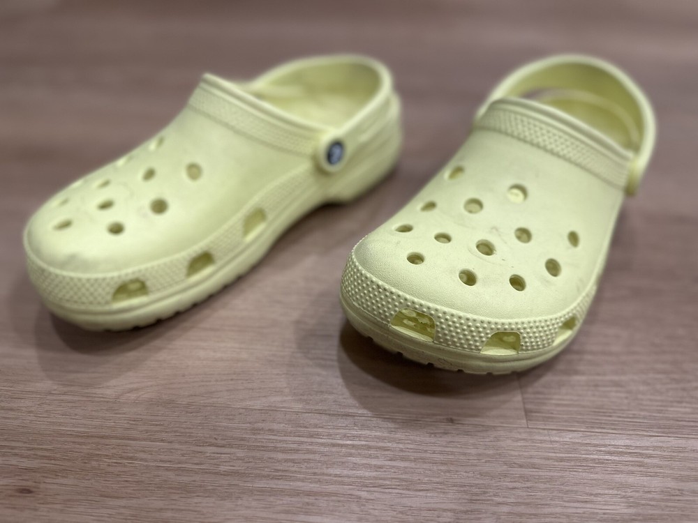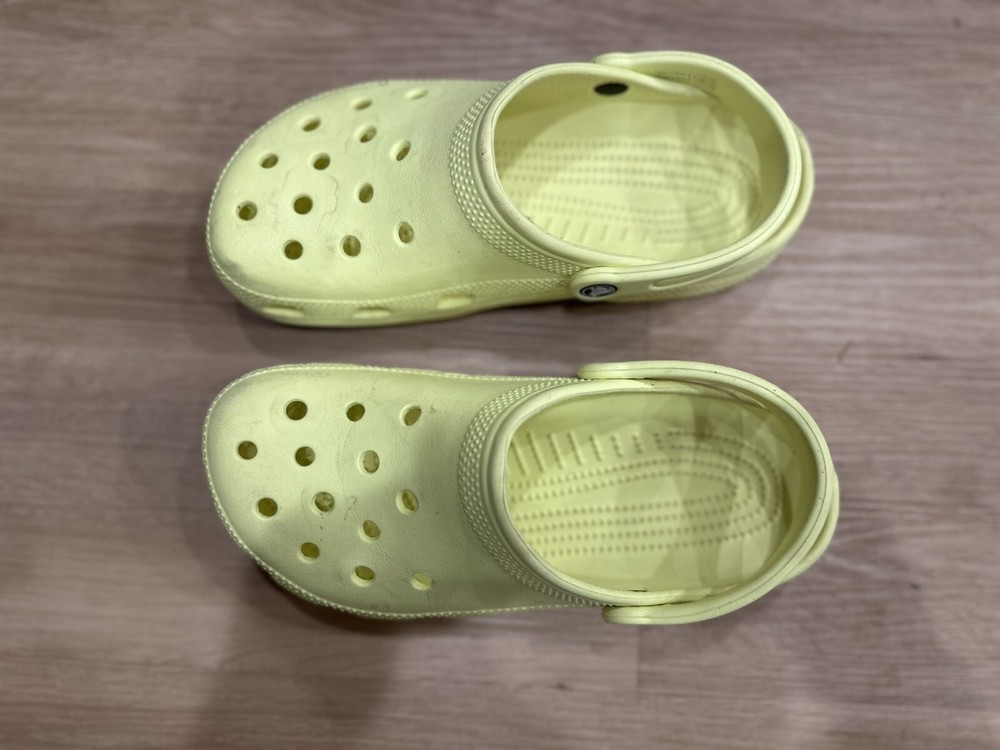 Embrace everyday comfort with the Crocs Classic Clogs in a vibrant sunflower yellow. These iconic clogs are designed for women who appreciate a blend of practicality and style. The lightweight construction, coupled with a durable rubber upper and toe cap, ensures long-lasting wear and ease of maintenance. Perfect for a range of casual settings, including beach outings, walks, or simply strolling through school, these clogs offer a snug fit in a size 9 (W9/M7) with a standard shoe width. The low top shaft and flat heel underscore the shoe's understated design, making them an ideal companion for those who value comfort and breathability in their footwear.