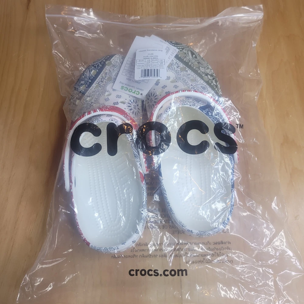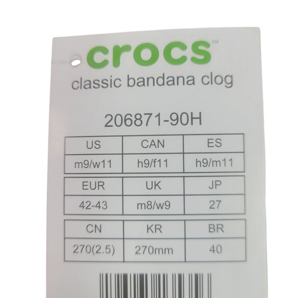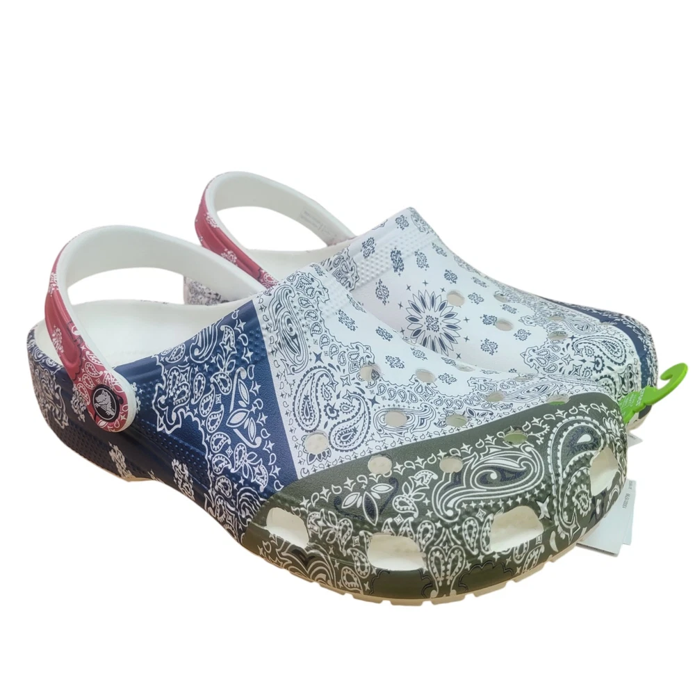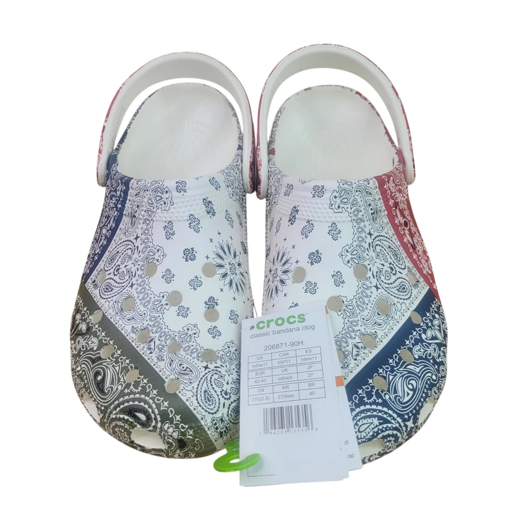 Crocs Bandana Clog Paisley Multicolor Men's Slip On Sandals US M9/W11 The Crocs Classic Bandana slide sandal in paisley pattern is a stylish and comfortable slip-on option for men with a US size of 9 (women's size 11). Featuring a white color with a classic bandana design, these sandals have a synthetic upper material and a slip-on closure for easy wear. The sandals are from the brand Crocs and are suitable for casual occasions during all seasons. Perfect for those who prefer a unique and eye-catching style in their footwear.