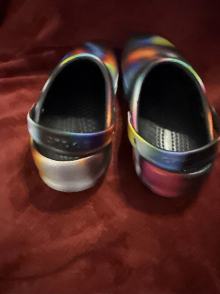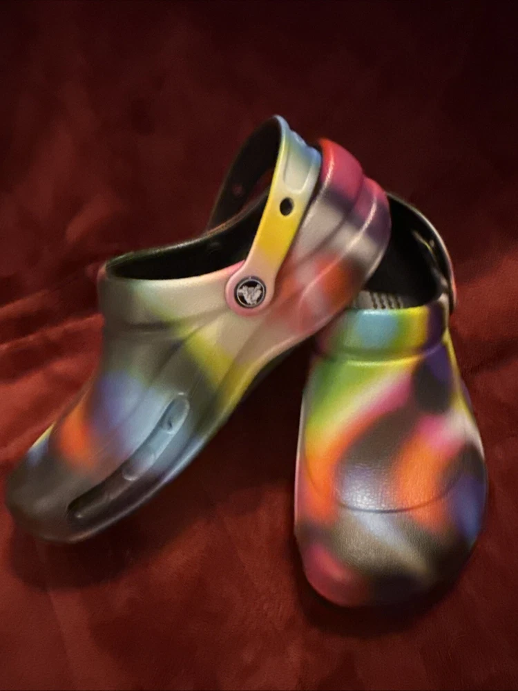 The product is a pair of Crocs Bistro Clogs designed for unisex adults, with a slip-on style and featuring the Croc's Lock slip-resistant tread. These colorful clogs are in a multicolor design, suitable for both men and women with a US shoe size of 10 for women and 8 for men. The shoes are made of synthetic material and are ideal for casual wear, specifically created to provide comfort and safety in work environments like kitchens or restaurants.