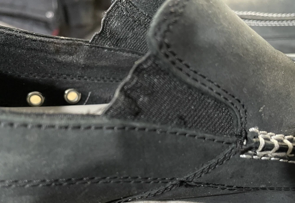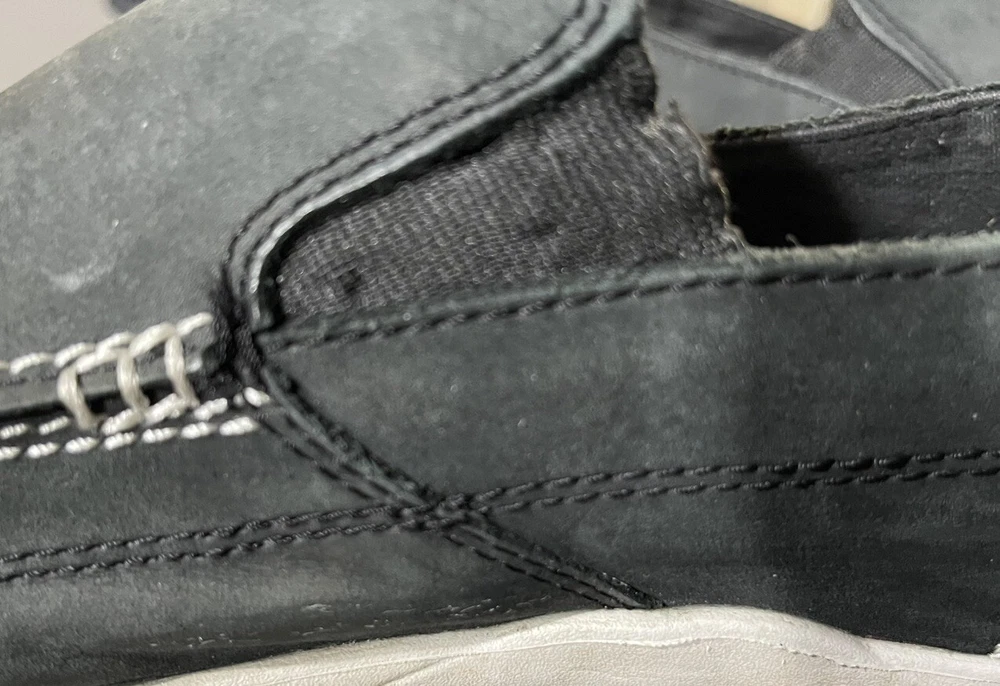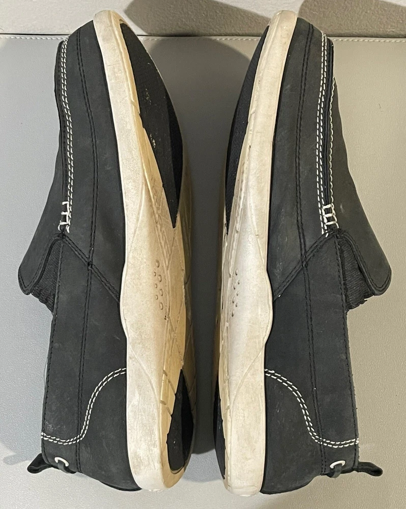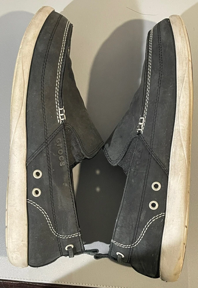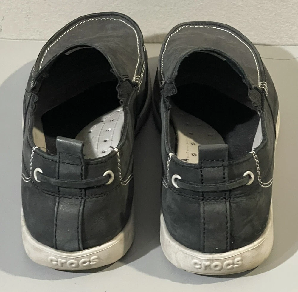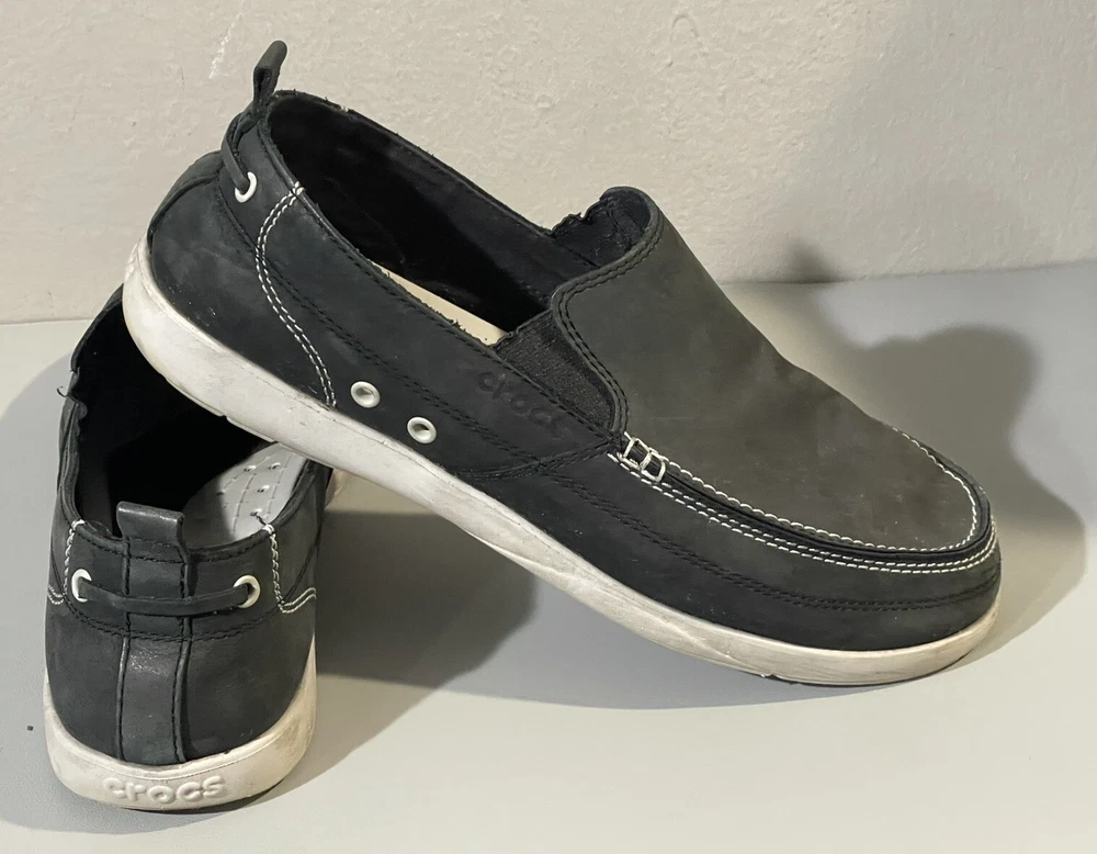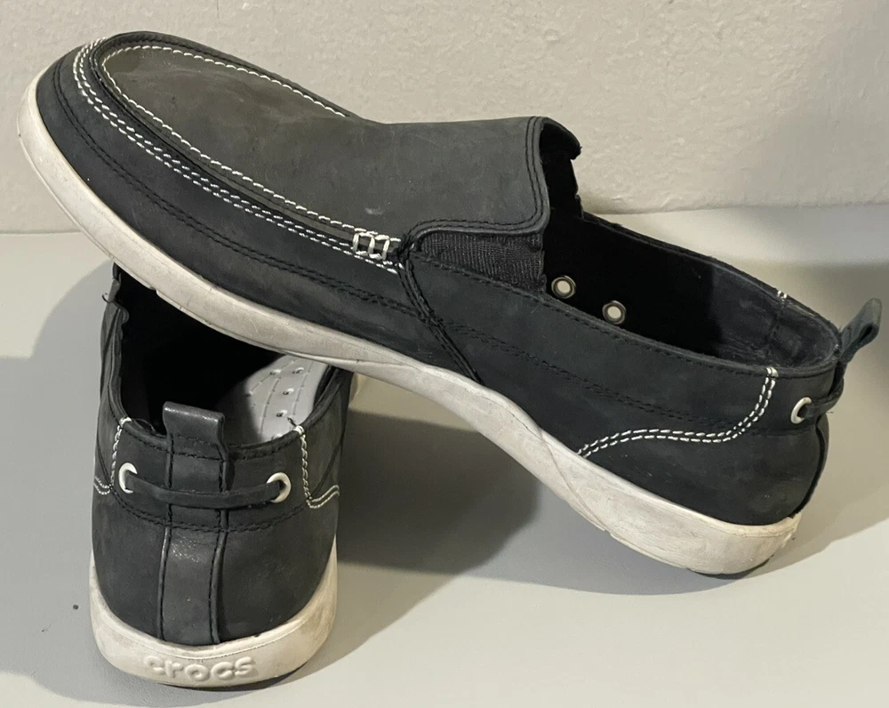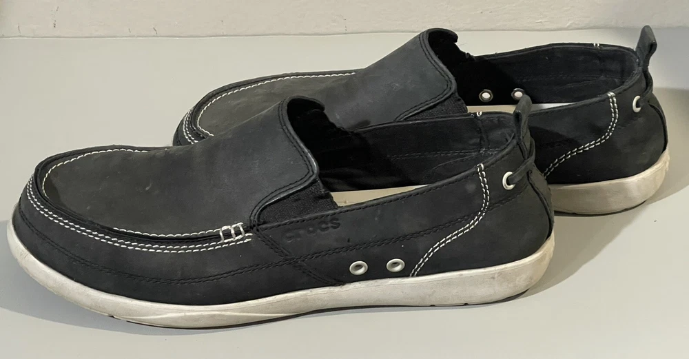 With sign of imperfection pls refer to pictures. SOLD AS IS. These Crocs Harborline Black Loafer Shoes are designed for men in size 12. They feature a slip-on style with round toe shape and are made of Nubuck leather with a rubber outsole. The shoes are lightweight, cushioned, and breathable, making them suitable for travel, casual outings, or workwear.
