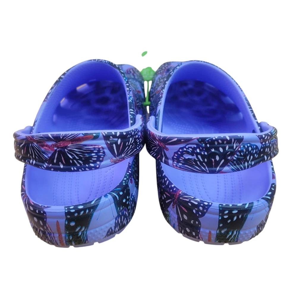 Crocs Classic Butterfly Clog Womens 9 Mens 7 Moon Jelly / Multi Color The Crocs Classic Butterfly Clog in Women's size 9 and Men's size 7 is a slip-on style shoe in the Moon Jelly/Multi color. Made with Croslite material, these clogs feature a classic design with a butterfly pattern, offering both comfort and style. Perfect for casual wear, these Crocs are a versatile choice for women looking for a fun and colorful addition to their shoe collection.