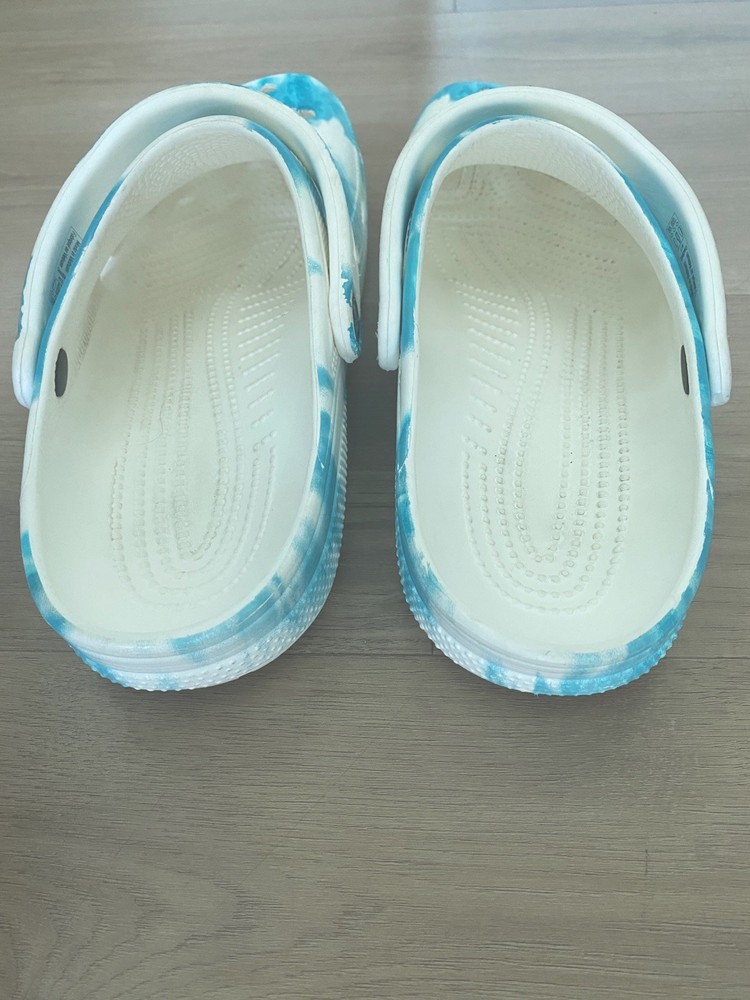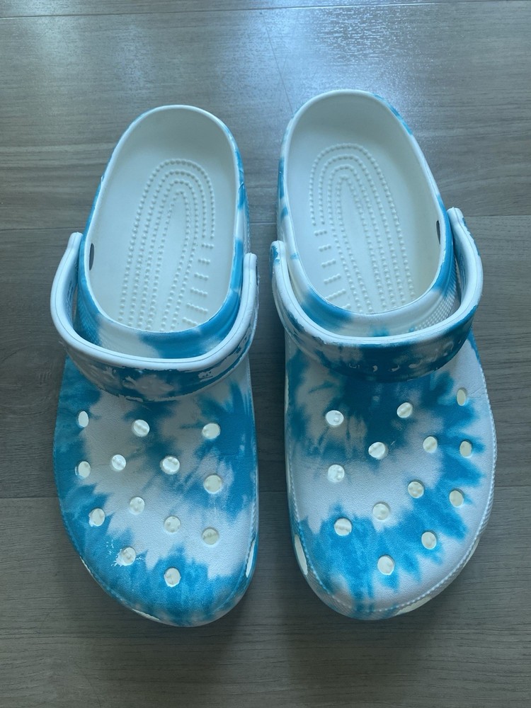 The Crocs Classic Tie Dye Clog in Multi Color Blue White is a slip-on sandal designed for both men 11 and women in size 13. On the go or just hangin’ out. Croslite™ foam construction will keep you comfortably supported as the tie-dye graphics boost your style. Grounded in comfort, spiked with personality. Incredibly light, flexible and fun to wear Designed to enhance breathability Easy to clean and quick to dry Pivoting heel straps for a more secure