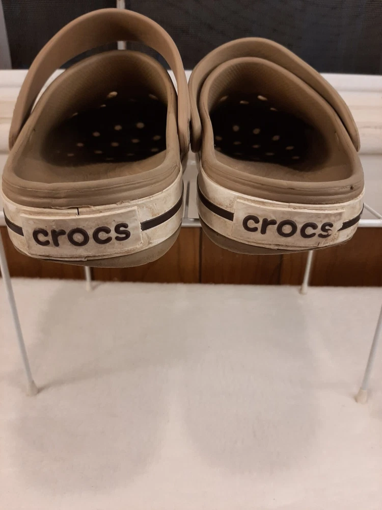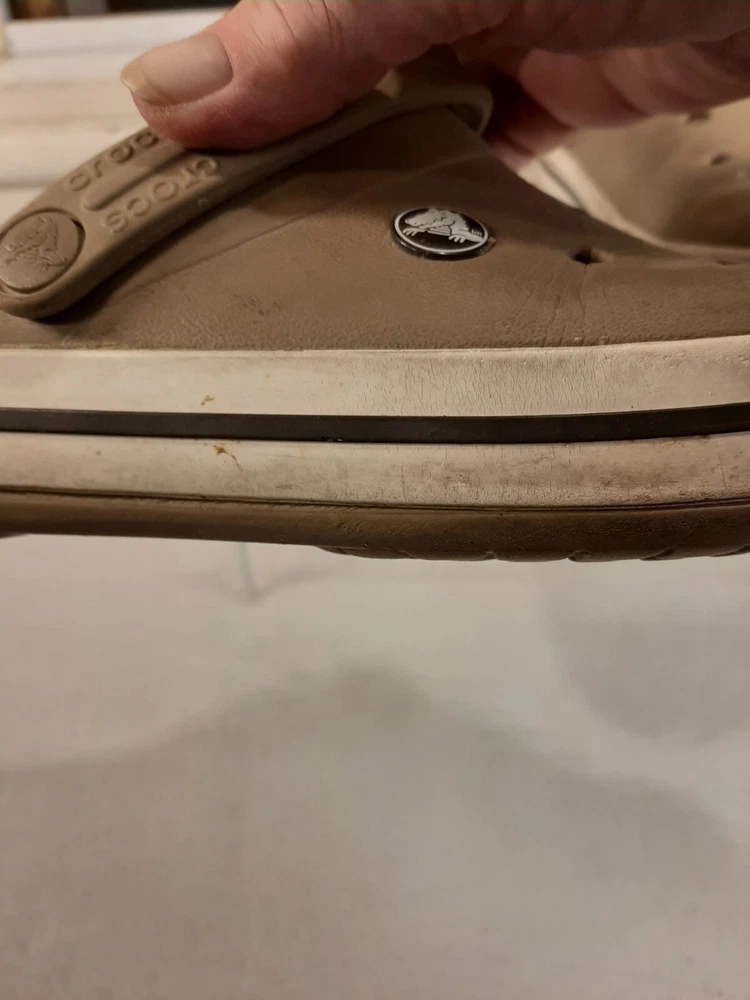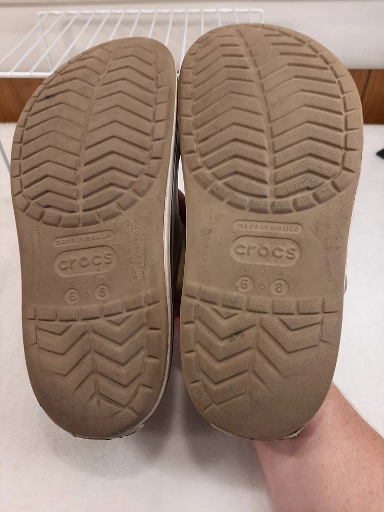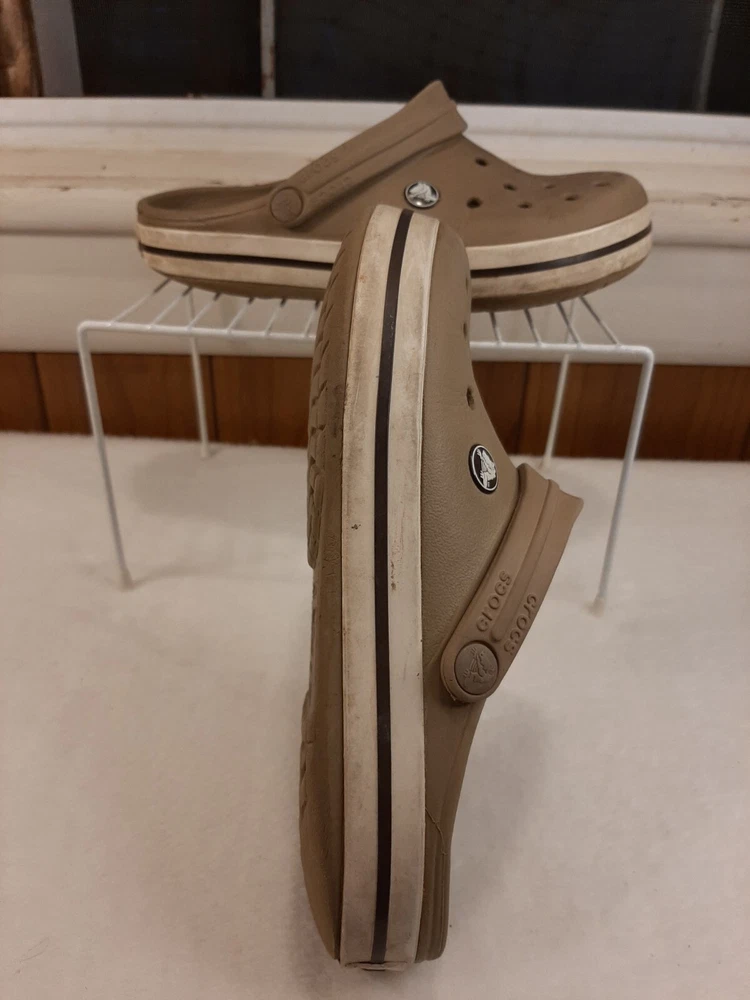 Crocs Classic Clog Tan Brown Size Men’s 6 Women’s 8 Shoes Slip On In good pre-owned condition may show signs of wear from use/handling/storage/display. Please view all pics for condition/details/flaws/issues. SOLD AS IS The white rubber trim has spots/dirt leaving cleaning to buyer. the bottoms have wear/drag on toe areas & heels & there is a small separation along the withe rubber trim please see photo 21 for this, please see all photos for details. There is/maybe marks/spots/dirt/debris please see photos 1-22, there is/maybe paint loss/sticker loss please see photos 1-22, there is lite discoloration please see photos 1-22, there are surface scratches to item please see photos 1-22, please see all photos for condition/issues/details.