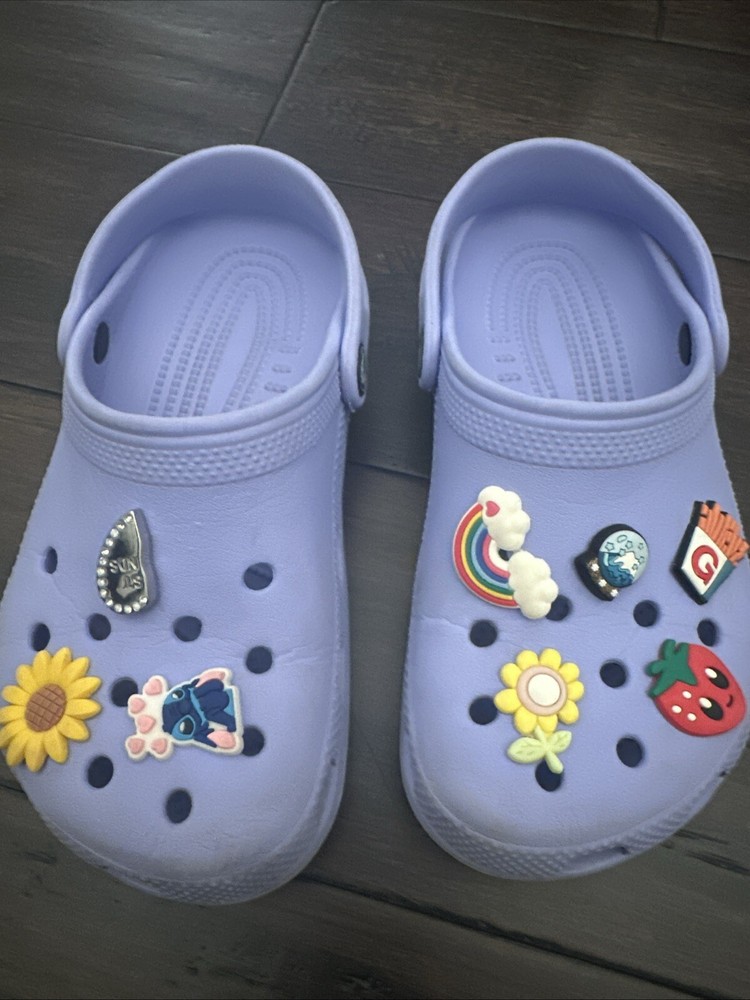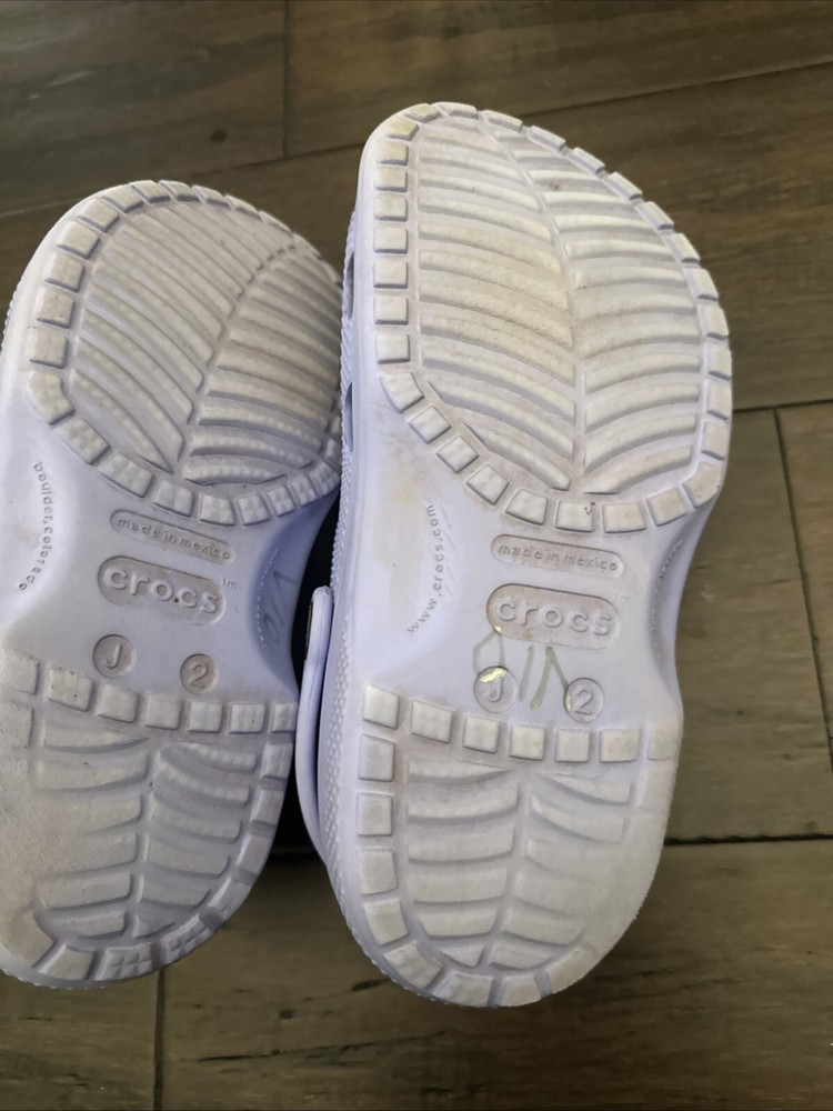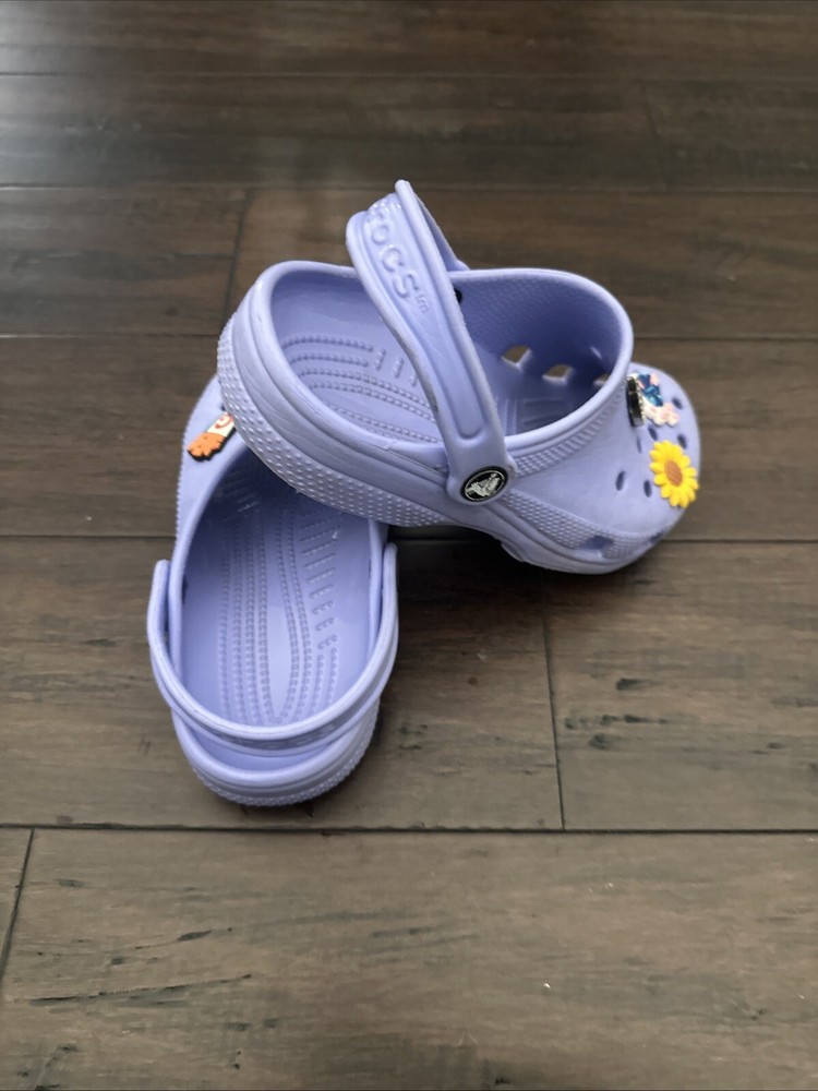 This is a pair of Crocs Classic Clog shoes in Mystic Purple, designed for Juniors size J2. They feature Slip-On style with lightweight, breathable, and comfortable qualities. The shoes come with pictures Charms making them a fun and stylish choice for young kids.