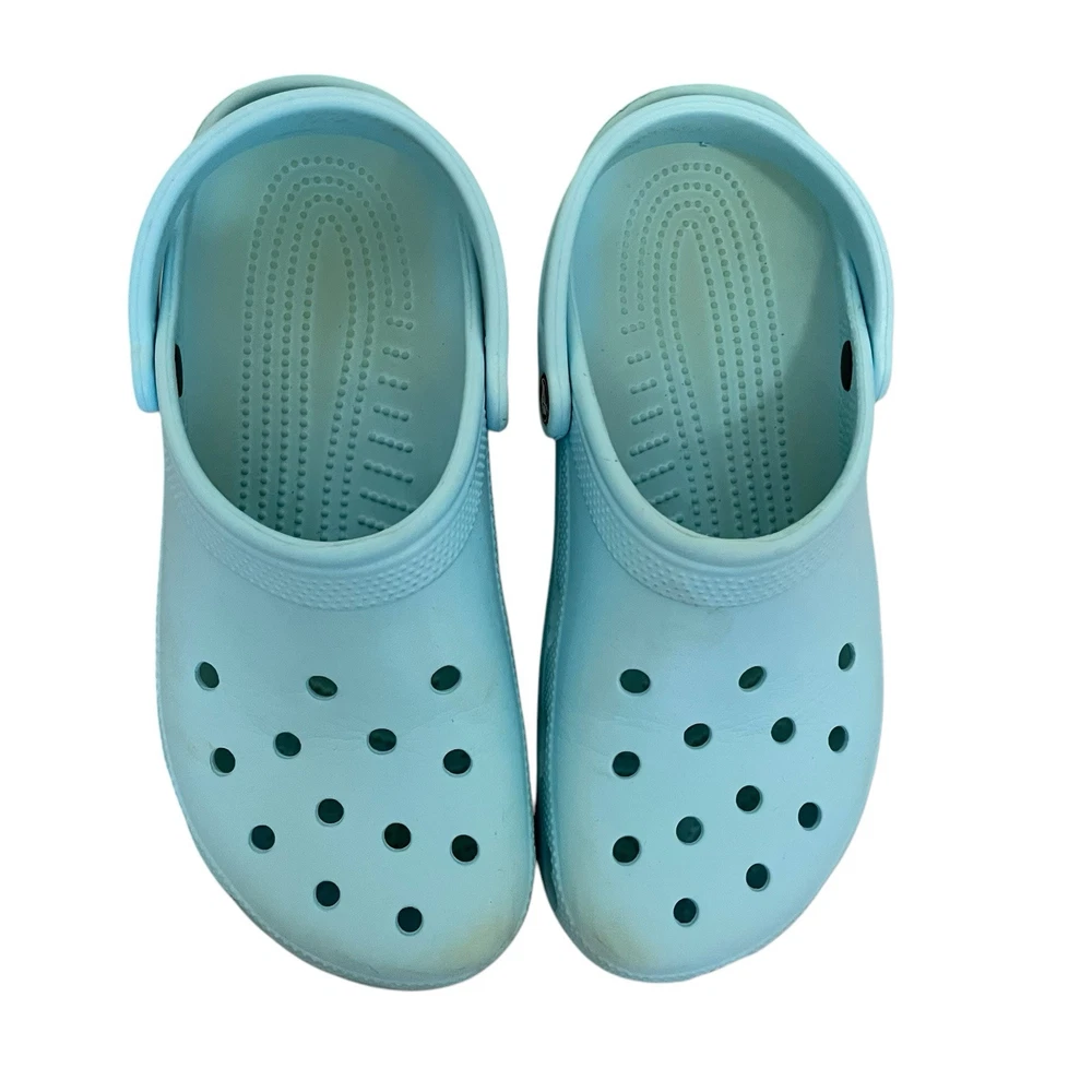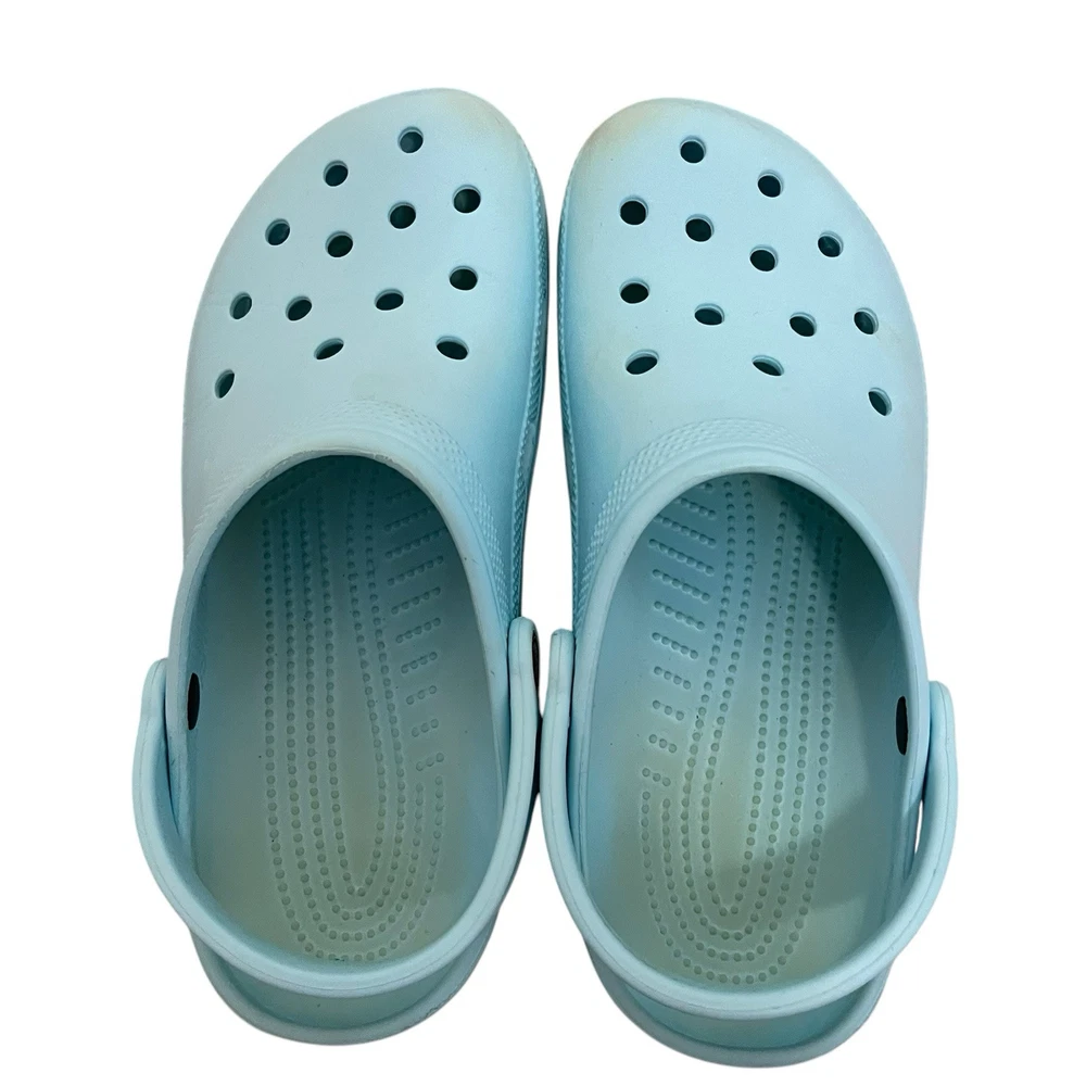 Elevate your summer footwear game with these sky light blue Crocs. These classic clogs are perfect for a casual look and provide comfort and breathability to your feet. The synthetic upper material is lightweight, making it easy to wear them all day long. The slip-on closure ensures easy wear, and the solid pattern gives it a chic look. These Crocs are perfect for both men and women, and the size 10 fits true to size. Get your hands on these clogs and add a pop of color to your summer wardrobe. In very good condition. Don’t have much actual wear, but there is some staining and scuffs as pictured. One strap has what looks to be a small burn. Please use zoom for exact condition. Plenty of wear left!