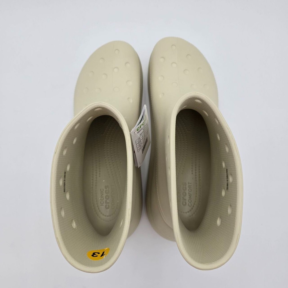 These Crocs Classic Crush Rain Ankle Boots in bone color are designed for men in size 13 with a round toe shape and pull-on closure. They are lightweight, waterproof, and slip-resistant, making them ideal for travel, activewear, casual outings, and workwear. The boots feature a cushioned insole, synthetic upper and lining, and a synthetic outsole. With a solid pattern, these ankle boots are suitable for outdoor themes like the garden or farm, providing comfort and style for various seasons.