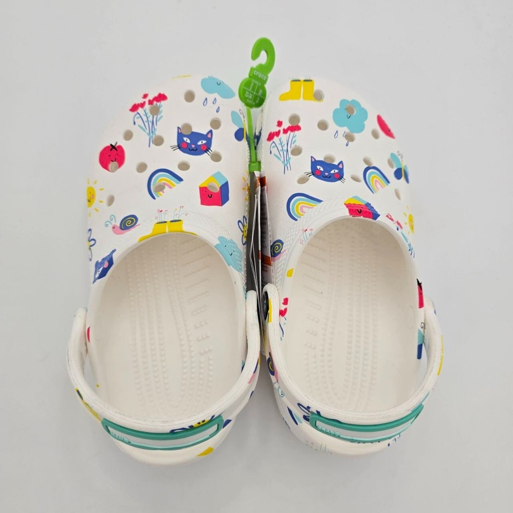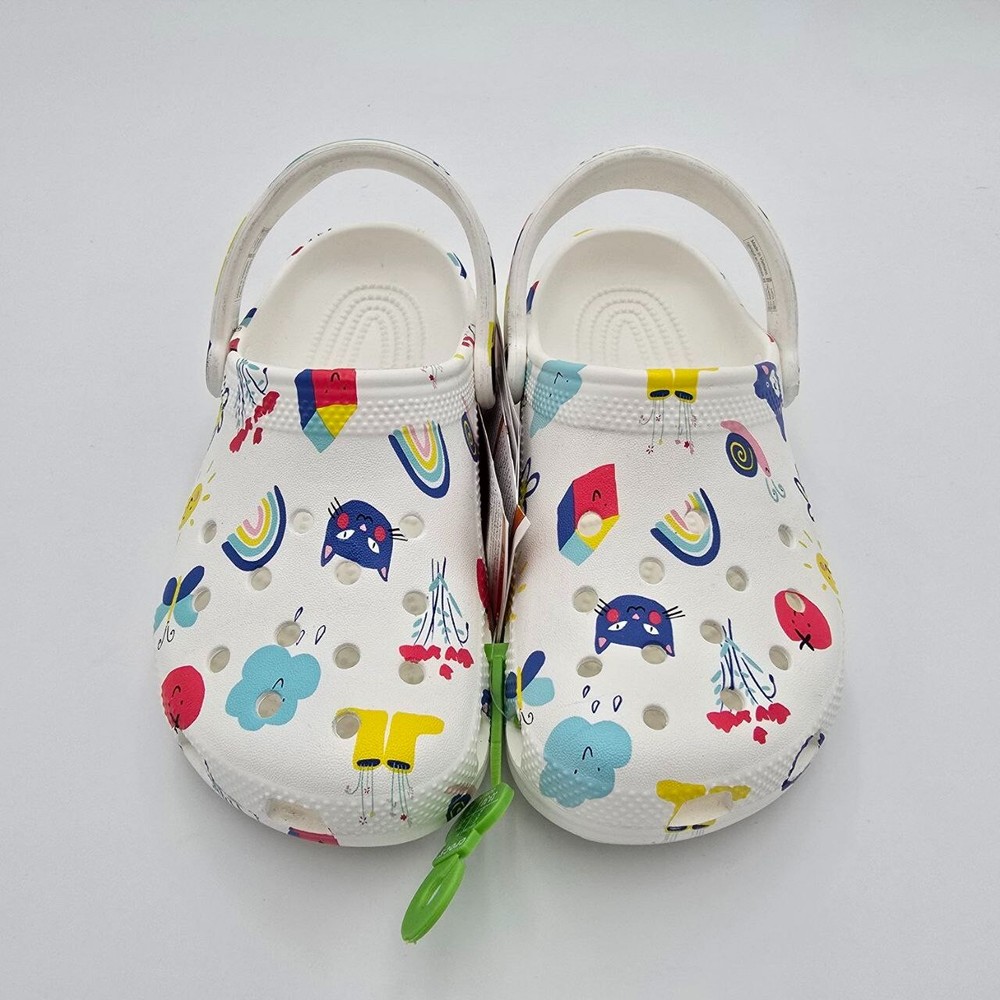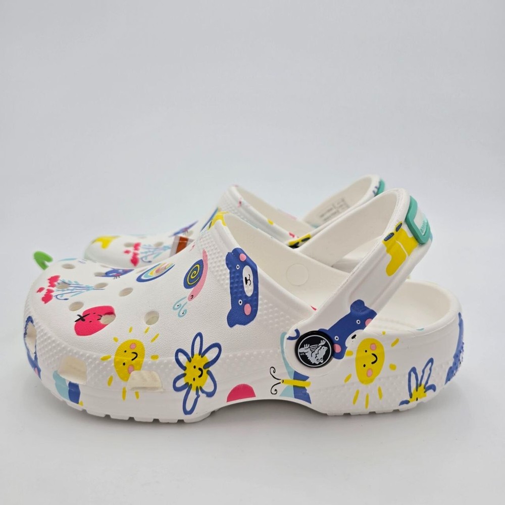 The Crocs Classic Doodle Print Clogs in Kid's Size 2 are white slip-on shoes designed for casual comfort. Featuring a round toe shape and flat heel style, these clogs are lightweight, waterproof, and cushioned for all-day wear. The colorful doodle print design adds a fun and playful touch, making them ideal for activities like walking, beach outings, or school. With a breathable synthetic upper and ankle strap for a secure fit, these Crocs are perfect for kids who enjoy expressing themselves with unique and vibrant footwear.