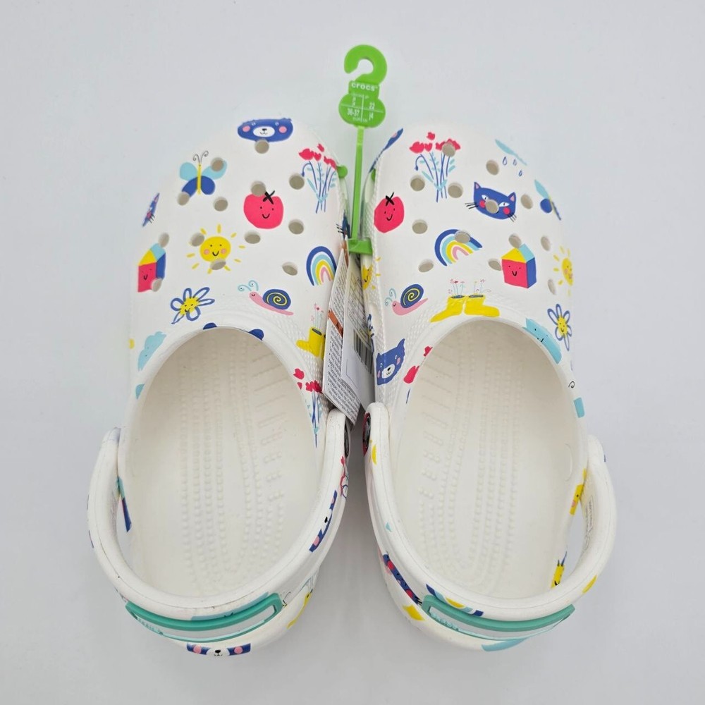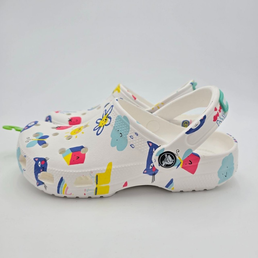 The Crocs Classic Doodle Print Clogs in Kid's Size 4 are white slip-on shoes designed for casual comfort. Featuring a round toe shape and flat heel style, these clogs are lightweight, waterproof, and cushioned for all-day wear. The colorful doodle print design adds a fun and playful touch, making them ideal for activities like walking, beach outings, or school. With a breathable synthetic upper and ankle strap for a secure fit, these Crocs are perfect for kids who enjoy expressing themselves with unique and vibrant footwear.