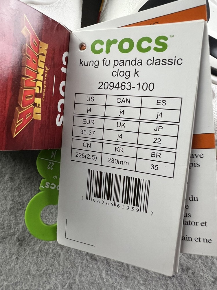 Department:Unisex KidsModel:Crocs Classic Kung Fu PandaVintage:NoHeel Height:Low (1-1.9 in)Product Line:crocsShoe Width:MTheme:Classic, Kung Fu PandaColor:WhiteCharacter Family:Kung Fu PandaBrand:CrocsType:SandalUS Shoe Size:J4Style:ClogUpper Material:CrosliteCountry/Region of Manufacture:Vietnam