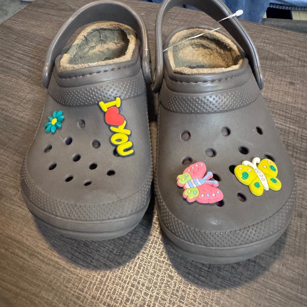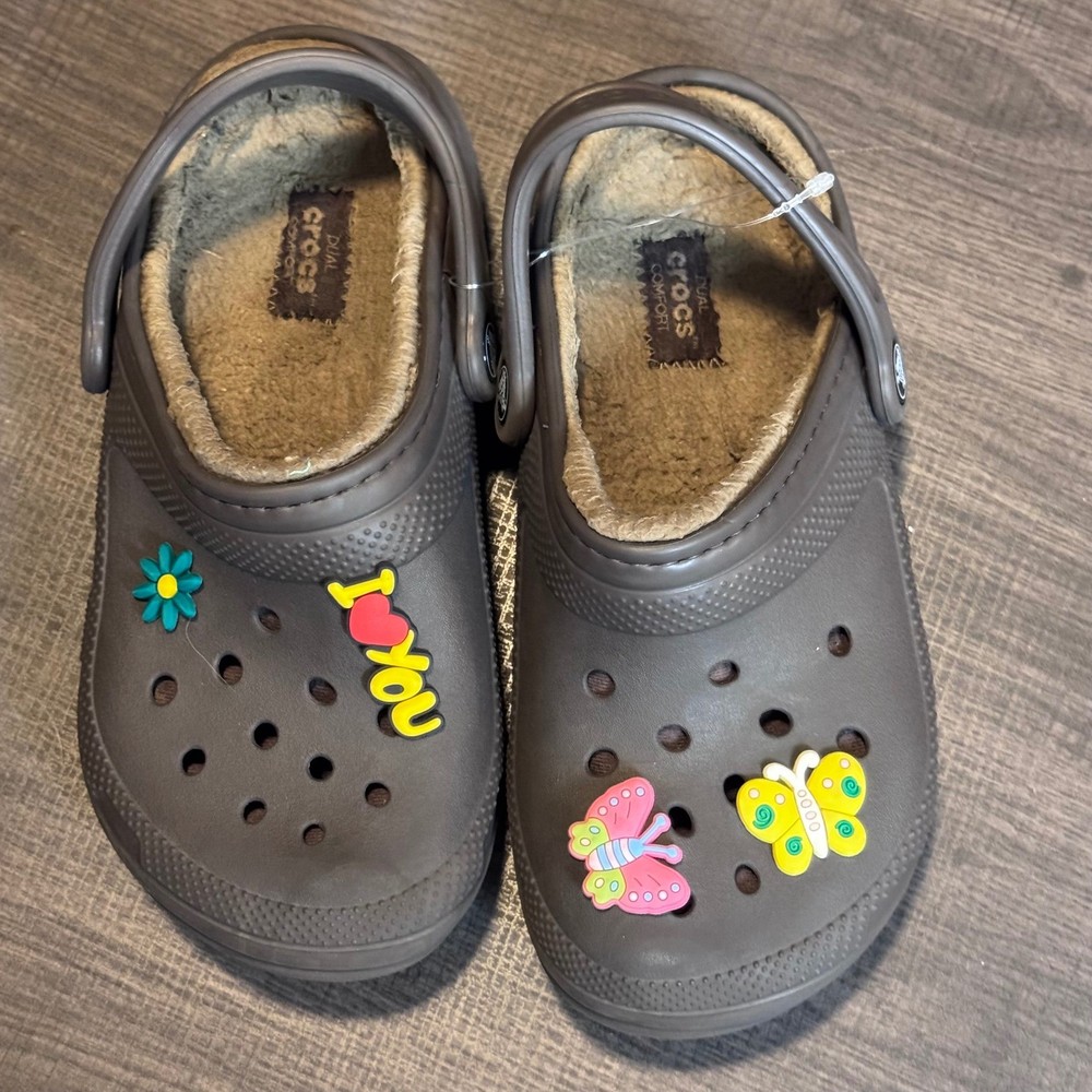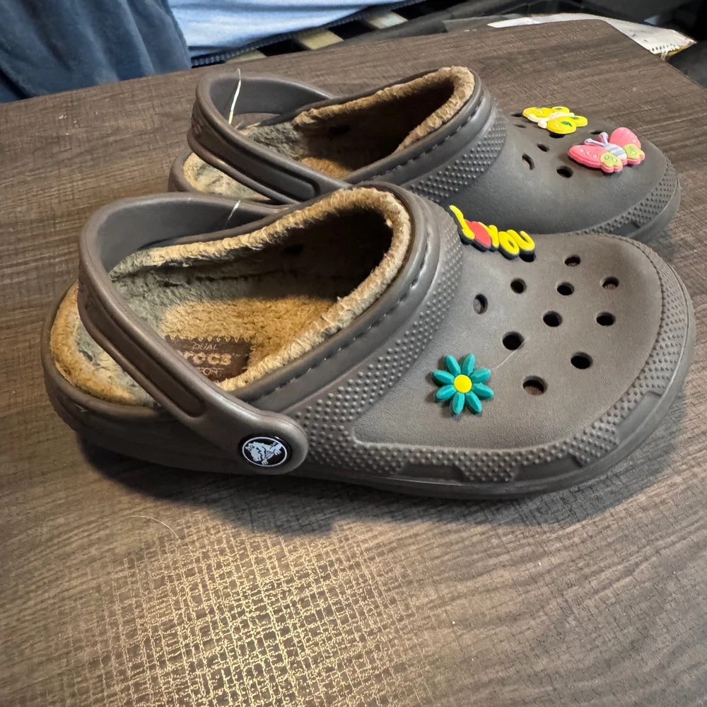 Style: Clog Department: Teens Upper Material: Synthetic Theme: Flower, Letters, Numbers & Words Type: Slipper Lining Material: Faux Fur Insole Material: Synthetic Pattern: Solid Heel Height: Flat (Under 1 in) Keywords: Crocs, Classic Clogs, Lined Clogs, Furry Clogs, Comfort Shoes, Kids Crocs, Toddler Crocs, Brown Crocs, Jibbitz, Girls Shoes, Boys Shoes, Slip On Shoes, Indoor Shoes, Outdoor Shoes