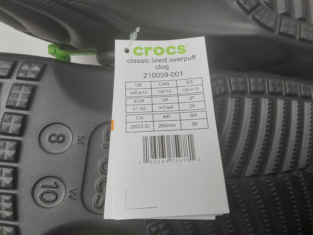 Lining Material: Synthetic Style: Clog Brand: Crocs Insole Material: Synthetic MPN: 210059-001 Occasion: Activewear, Casual, Travel, Workwear Customized: No Shoe Width: Standard Features: Comfort, Lightweight, Lined Season: Fall, Spring, Summer, Winter US Shoe Size: M8/W10 Color: Black EU Shoe Size: 41-42 Outsole Material: Synthetic Model: Crocs Classic Lined Overpuff Accents: Logo gtin13: 196265759781 Type: Casual Upper Material: Synthetic Vintage: No Closure: Slip On Department: Unisex Adults UK Shoe Size: M9/W10 UPC: 196265759781 Pattern: Solid Toe Shape: Round Toe