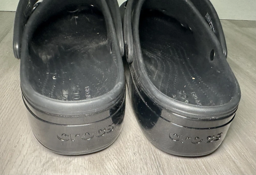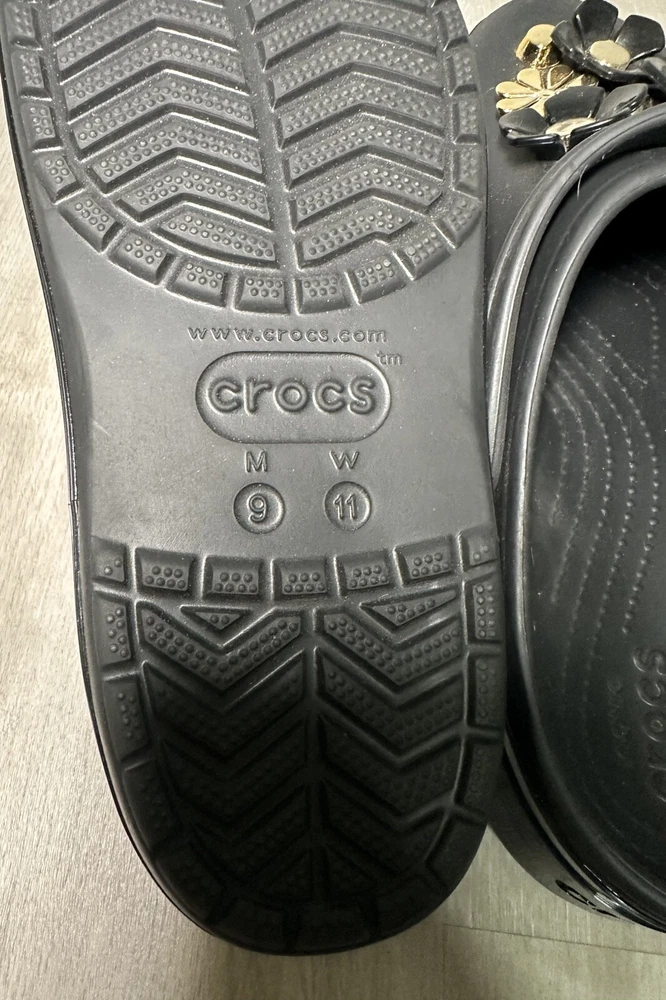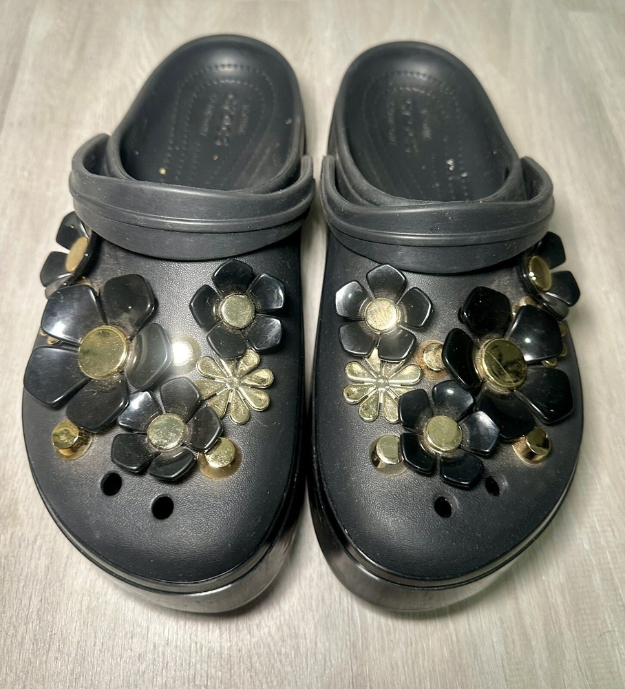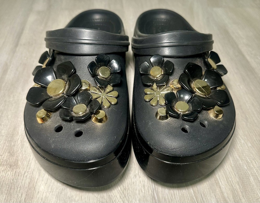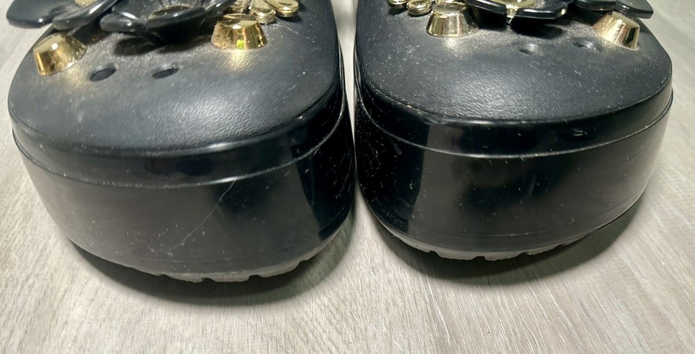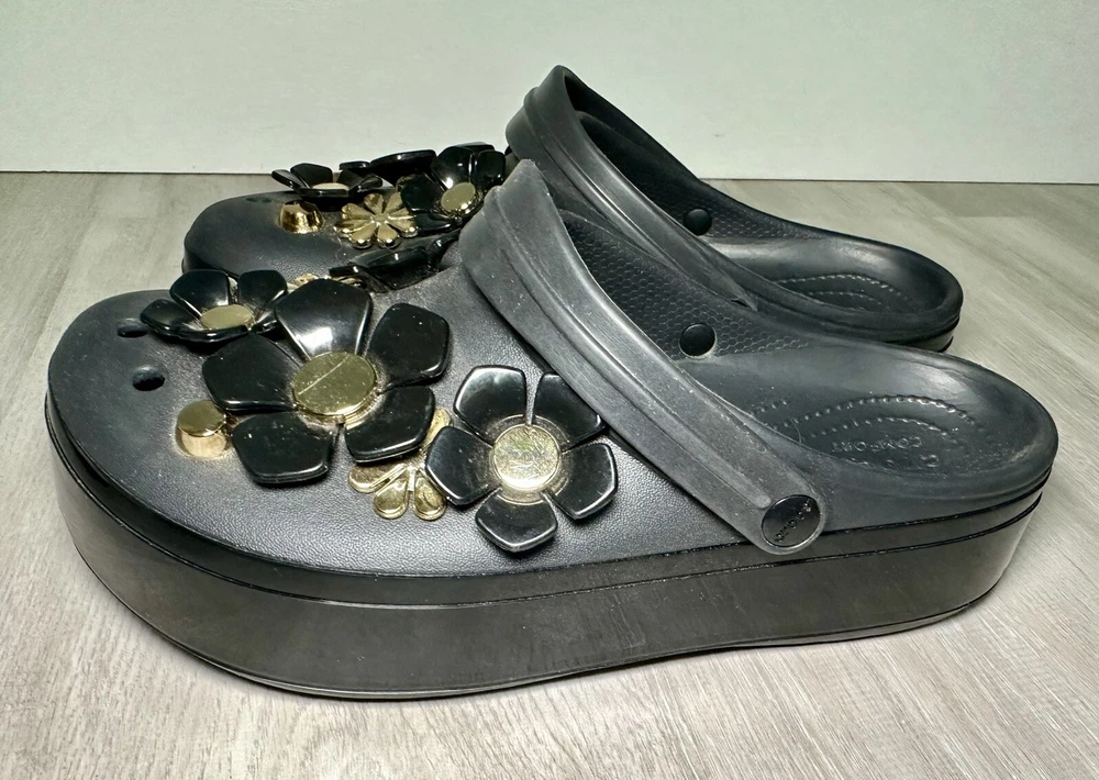 Crocs Classic Platform Clog Black & Gold with Flowers Size 11 Benefits Charity. Condition is Pre-owned. Shipped with Standard Shipping.