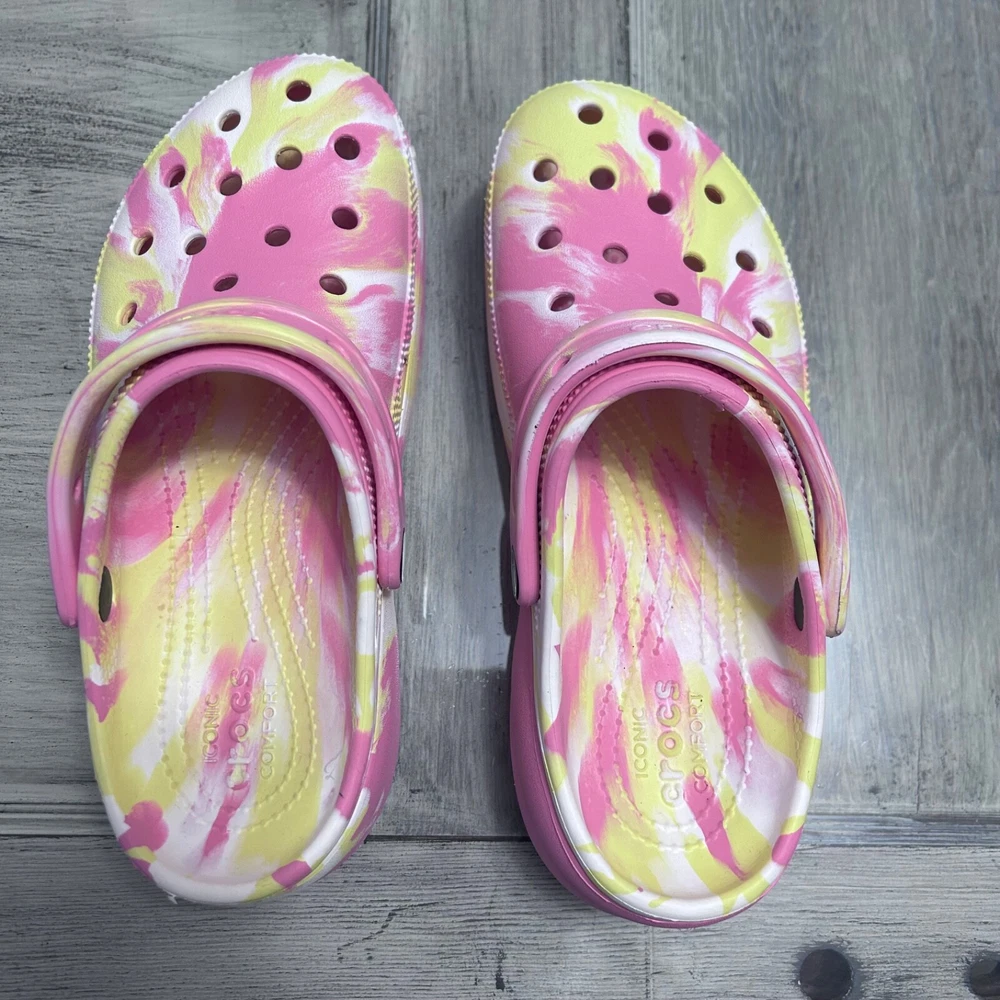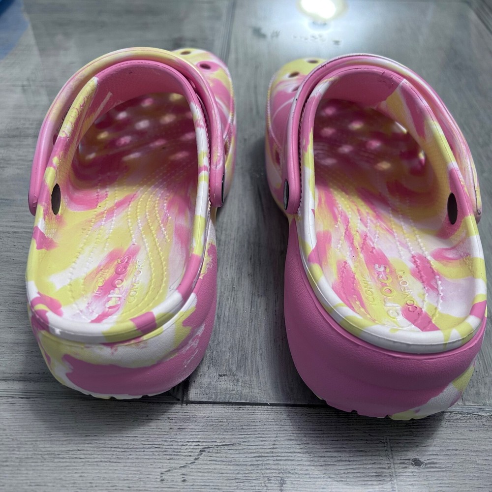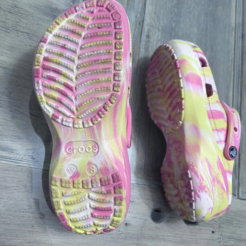 This item is a pair of Crocs Classic Platform Clog in a FUN marbled pink, yellow, and white multi-color design. They are size 8 for women and have a casual style. The upper material is rubber, and they feature the brand's classic clog silhouette with a platform sole. Perfect for adding a fun pop of color to your outfit while enjoying comfort and support. These women's clogs have been very gently used.