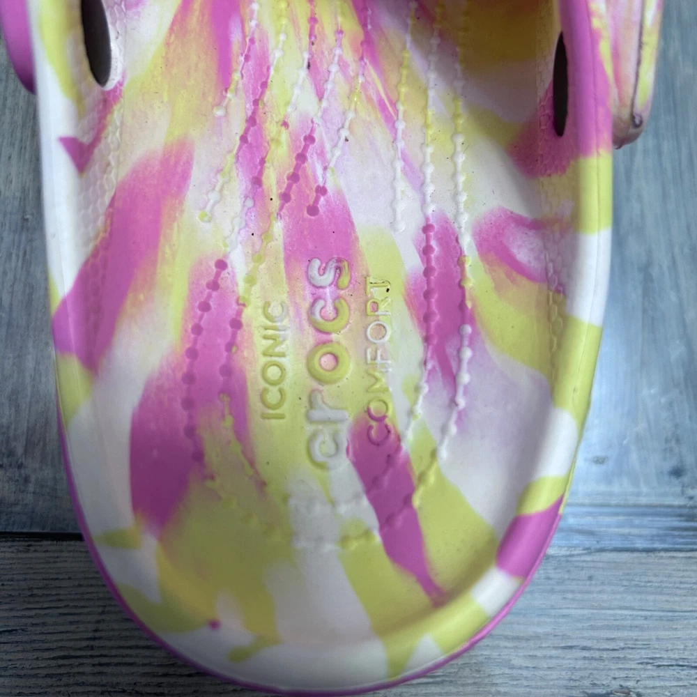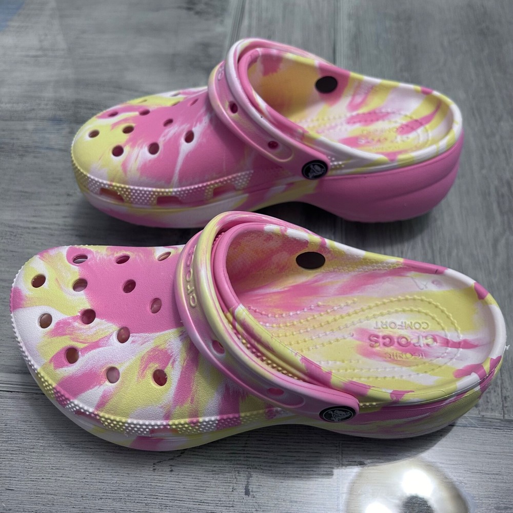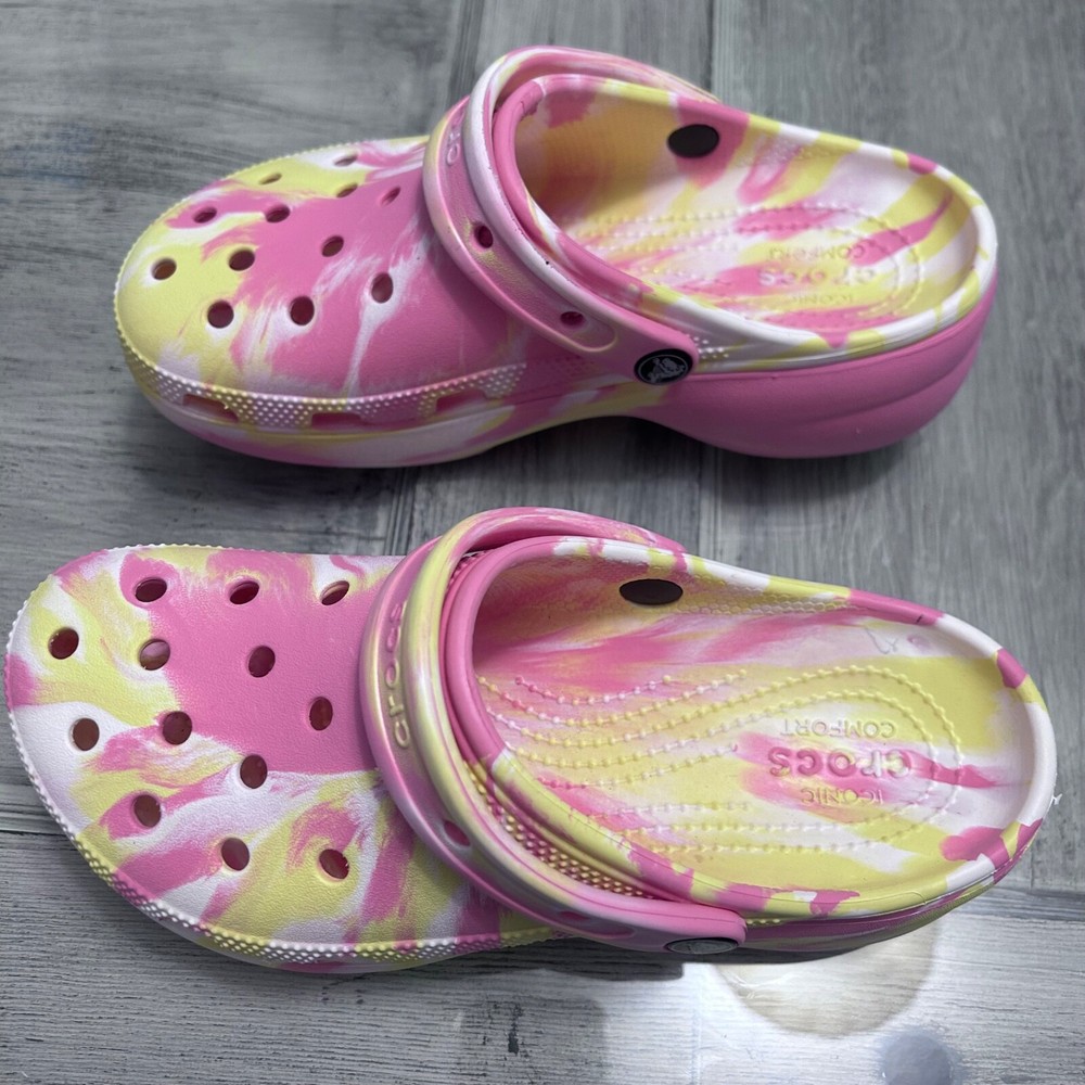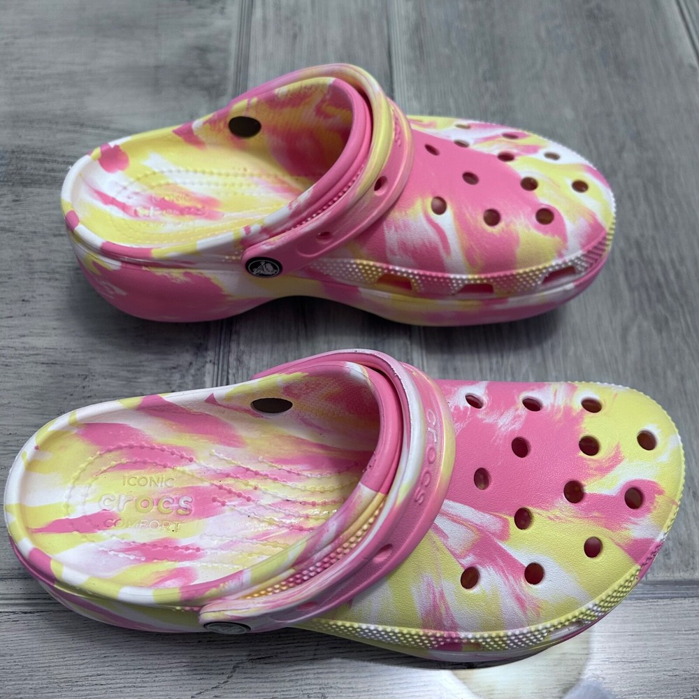 This item is a pair of Crocs Classic Platform Clog in a FUN marbled pink, yellow, and white multi-color design. They are size 8 for women and have a casual style. The upper material is rubber, and they feature the brand's classic clog silhouette with a platform sole. Perfect for adding a fun pop of color to your outfit while enjoying comfort and support. These women's clogs have been very gently used.