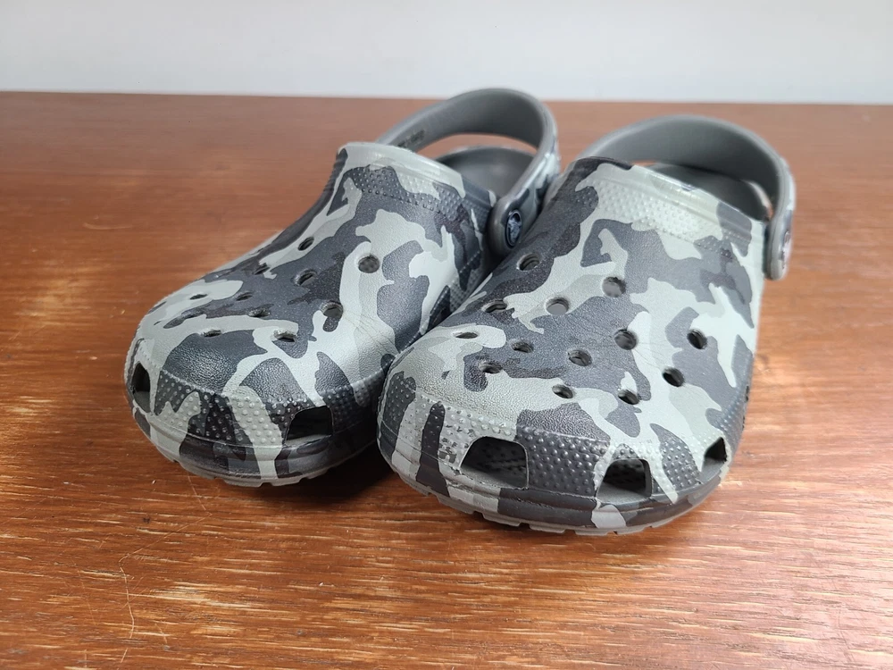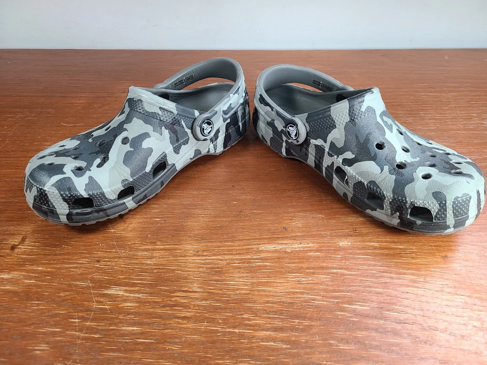 Crocs Classic Printed Camo Clogs Grey Camo 206454 Mens Size 4 Womens Size 6. Crocs are in preowned condition. See pictures for details. Please ask any questions before purchase. If there is any issue, please contact us first before leaving feedback. Thank you.