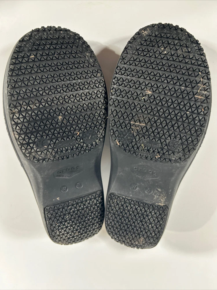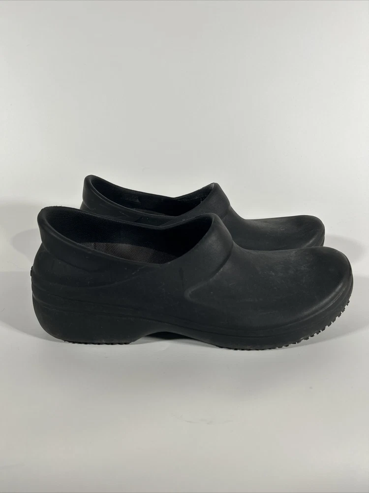 Elevate your style with these black Crocs clogs. These slip-on shoes have a closed toe with a low-top shoe shaft style, making them a perfect fit for casual occasions. The shoes have a flat heel style with a slip-resistant rubber outsole, making them ideal for walking during summer, fall, and spring. The shoes are a size 8 in the US and 6.5 in AU, with a standard shoe width and a synthetic lining material. The shoes feature the classic Crocs logo with a solid pattern. They are from the Crocs Neria Pro II model, which provides maximum comfort and slip resistance. The shoes are handmade with rubber as the upper and fabric as the insole material. These shoes are perfect for women who love clogs and want a comfortable pair that can be worn on any occasion. SKU8