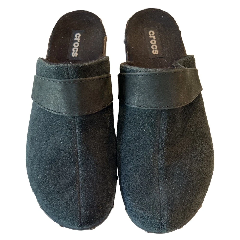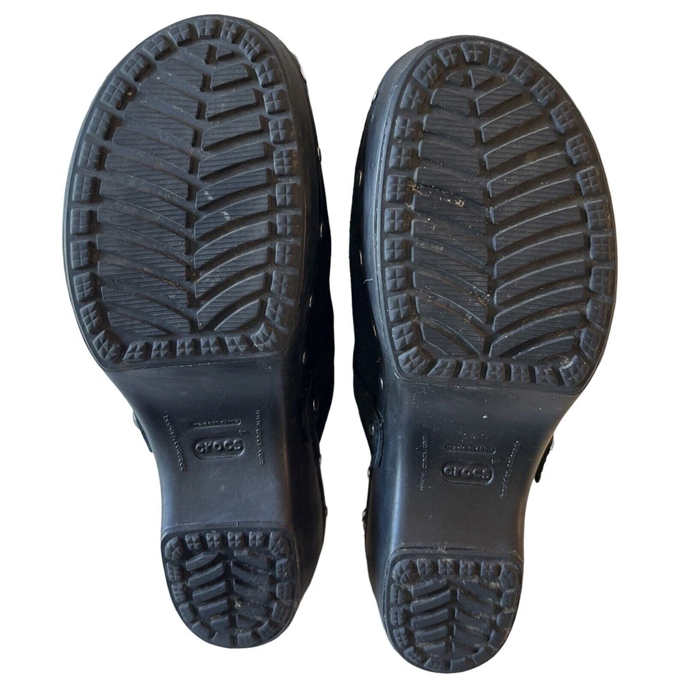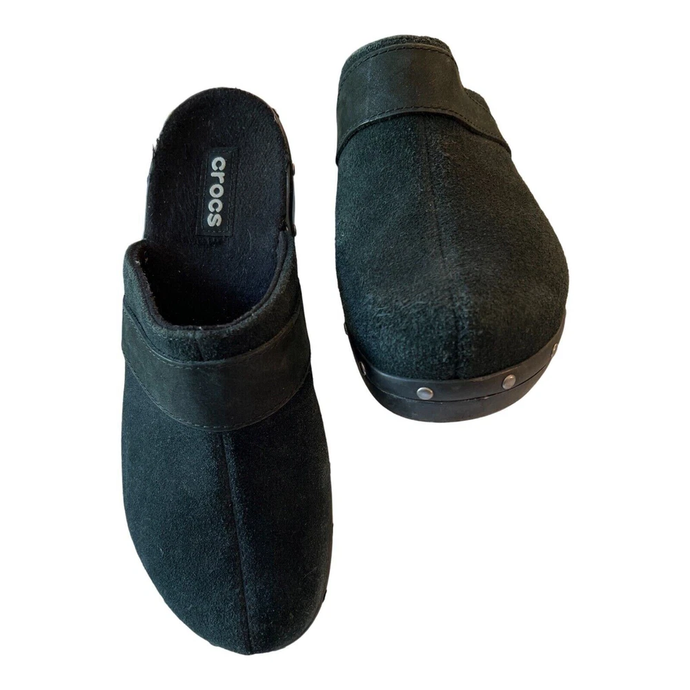 Crocs clogs black suede leather with silver rivets slip-on design shearline lined mid-height heel clogs standard shoe width ** all items stored in a smoke-free & pet free home