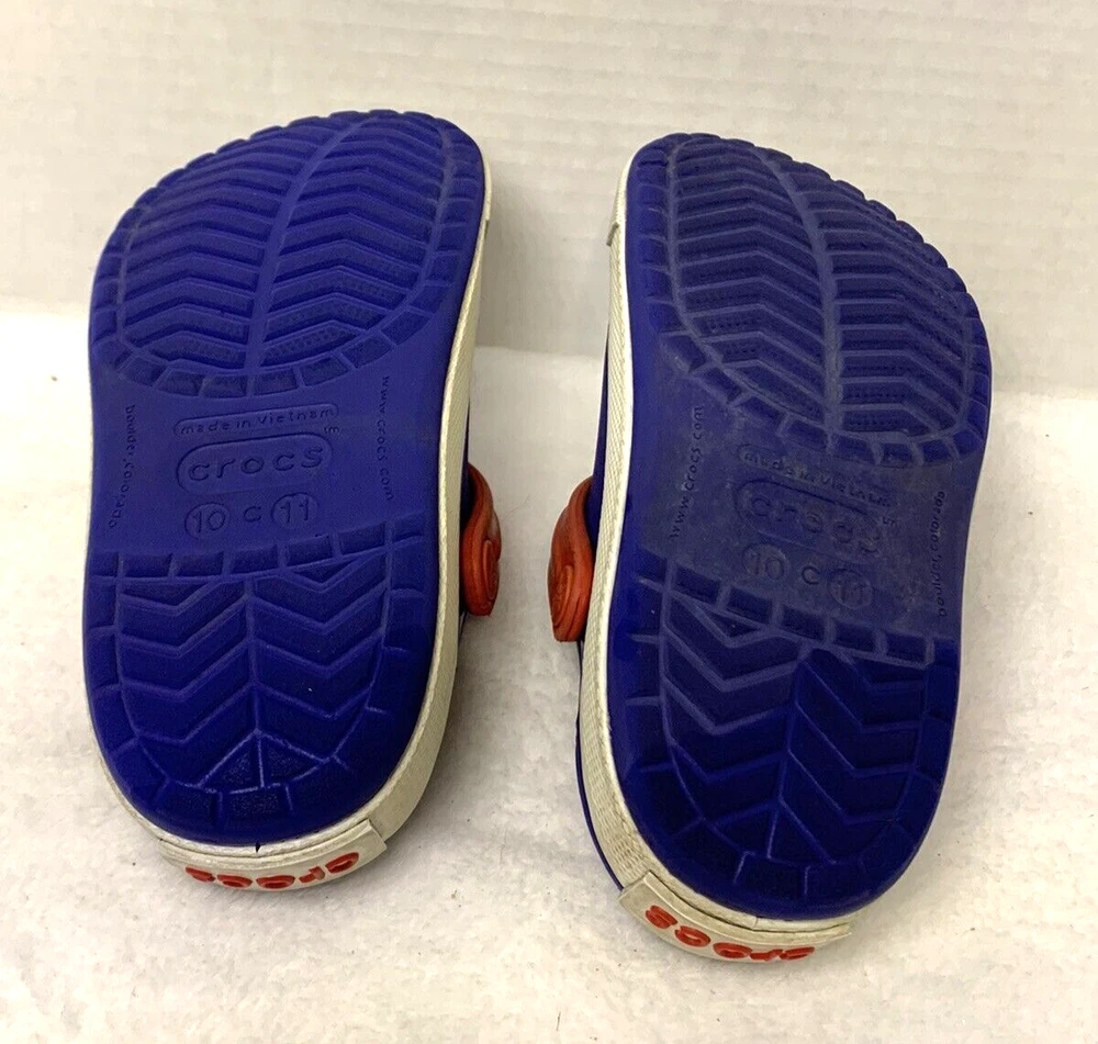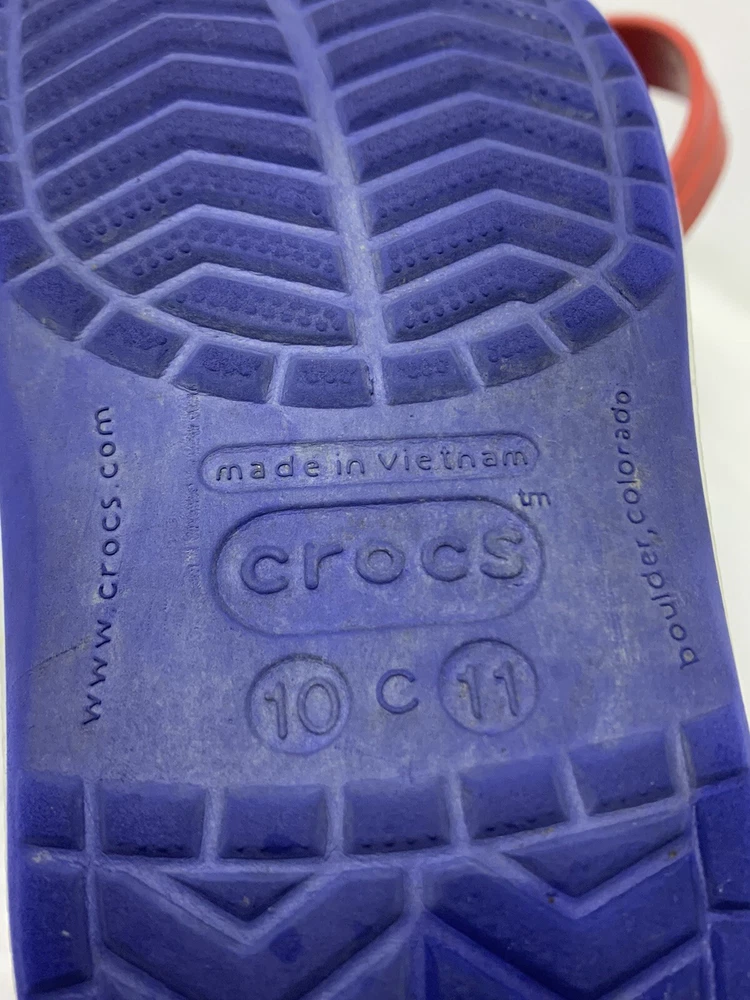 Slip into summer with these classic Crocs Crocband sandals in navy, red, and white. Perfect for little feet, these slip-on clogs feature a comfortable design that will keep your child's feet happy all day long. The unisex style is great for both boys and girls, while the slip-on closure makes it easy for independence. These Crocs are perfect for any occasion, whether it's a day out with friends or a casual family picnic. The slip-on design ensures that your child can easily put them on and take them off, while the comfort features make them ideal for all-day wear. Available in size C10/C11, these Crocs Crocband sandals are a must-have addition to your child's summer wardrobe.