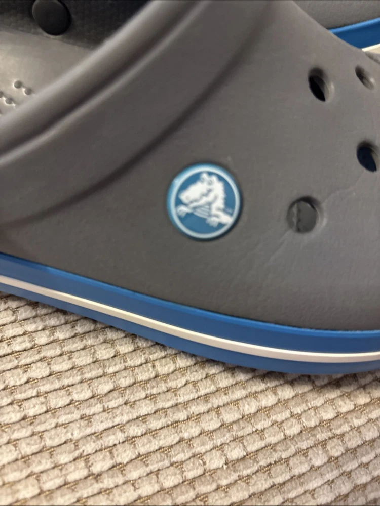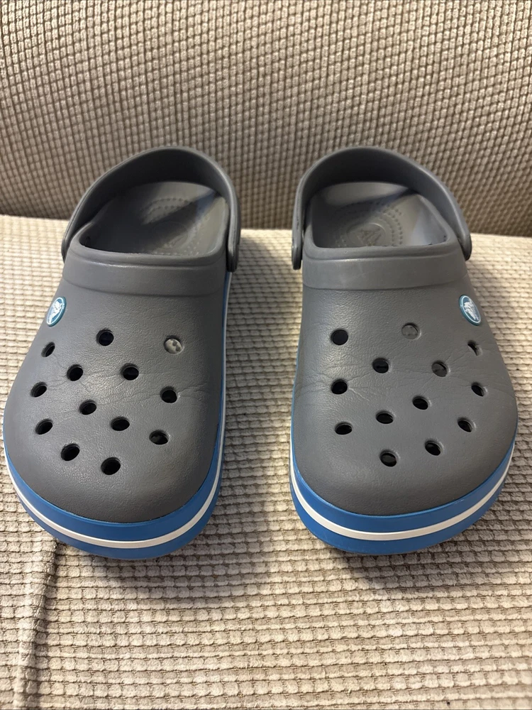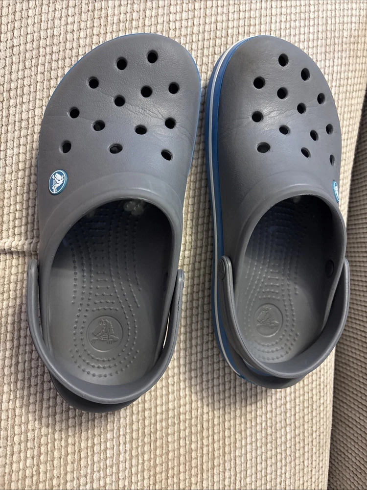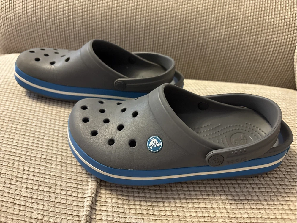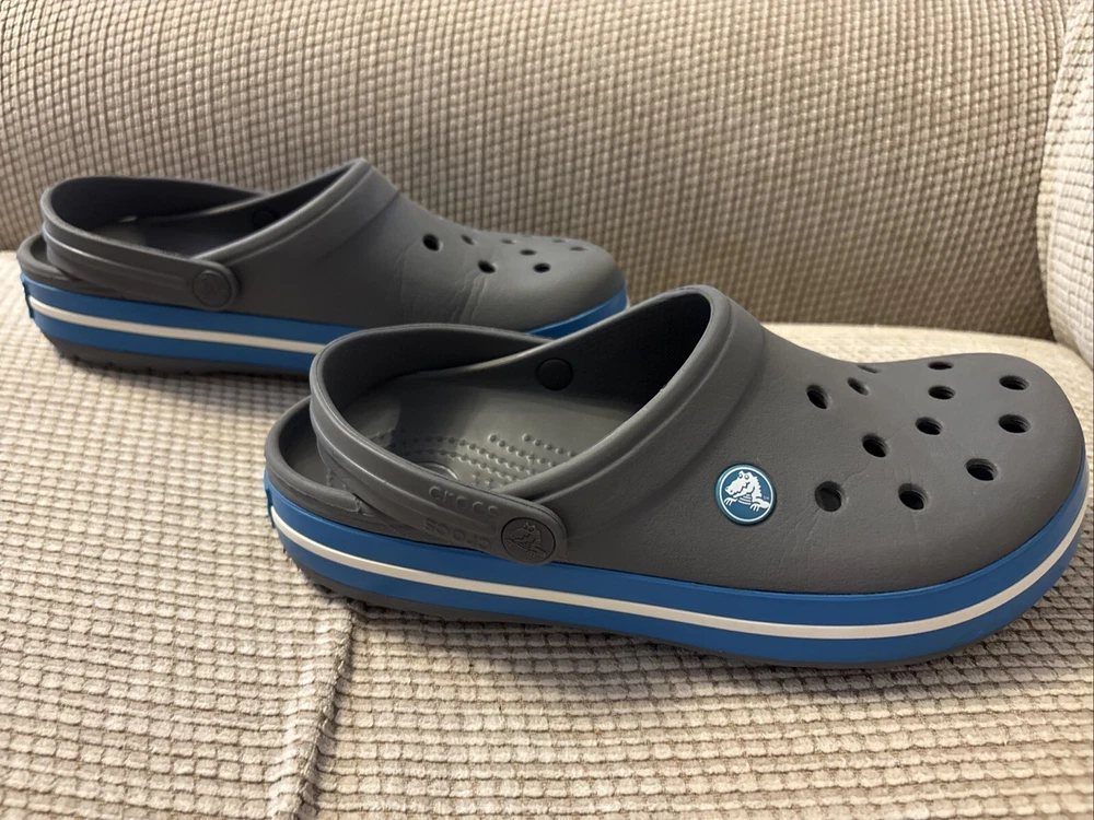 The Crocs Crocband II Clogs in gray and blue are designed for both men's size 6 and women's size 8. These slip-on clogs feature a solid pattern with a comfortable flat heel height, making them suitable for casual wear. The clogs are made of rubber material, with a synthetic lining and rubber insole for added comfort and breathability. The Crocband II style from the Crocs brand offers a standard width fit and is a versatile choice for everyday activities.