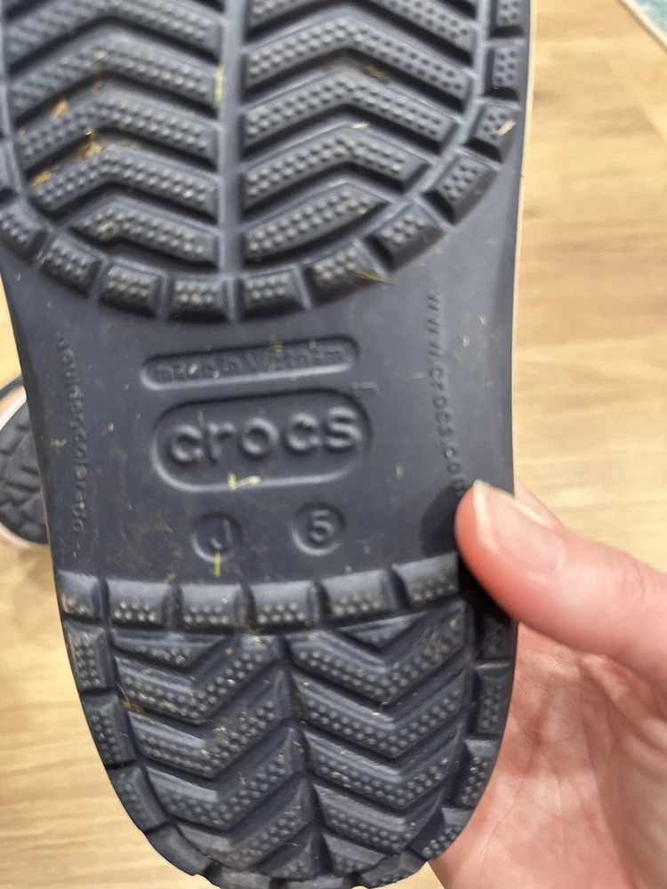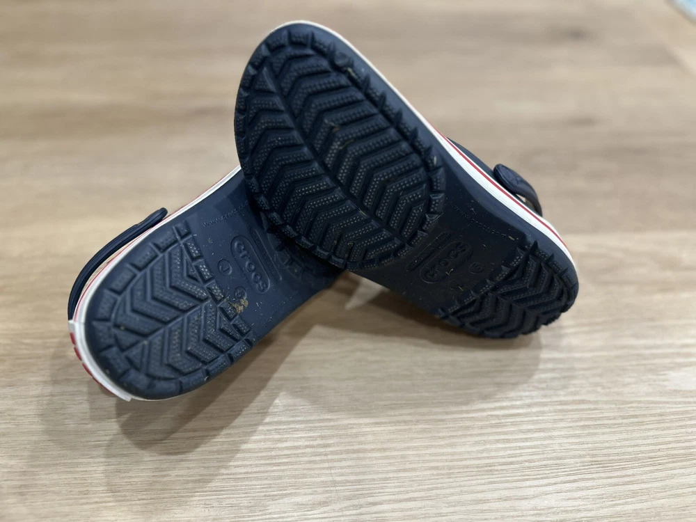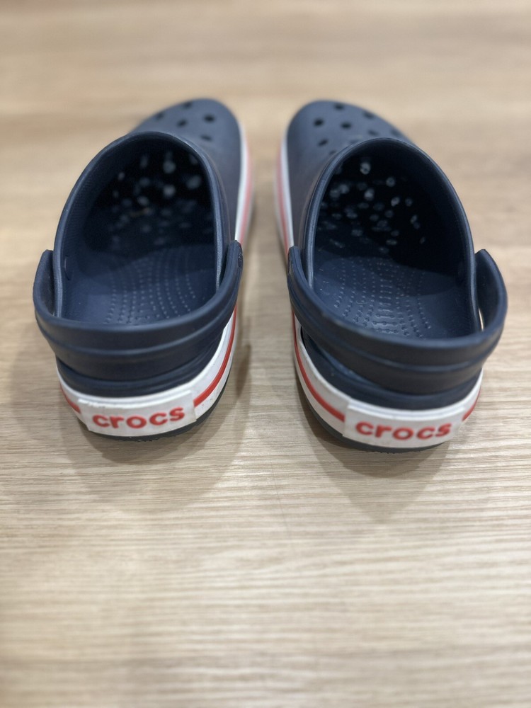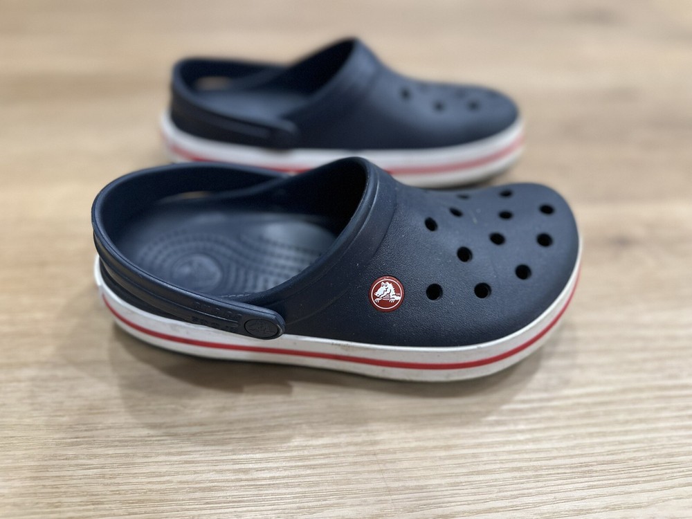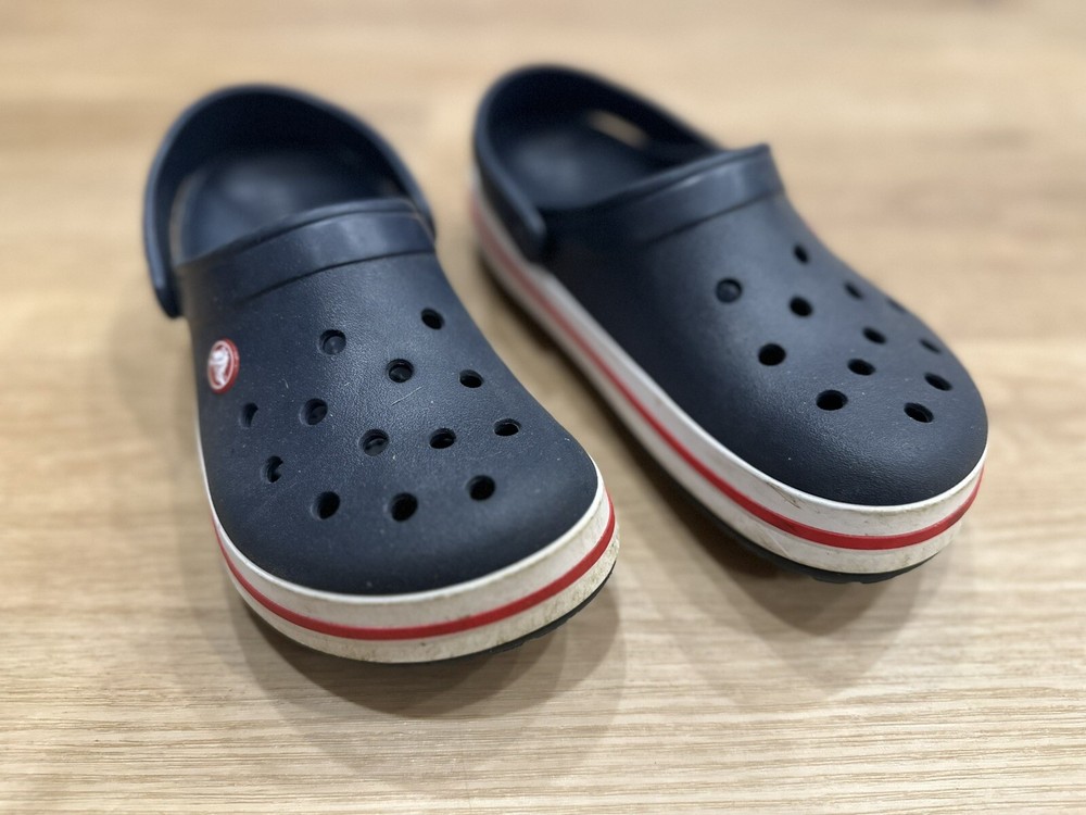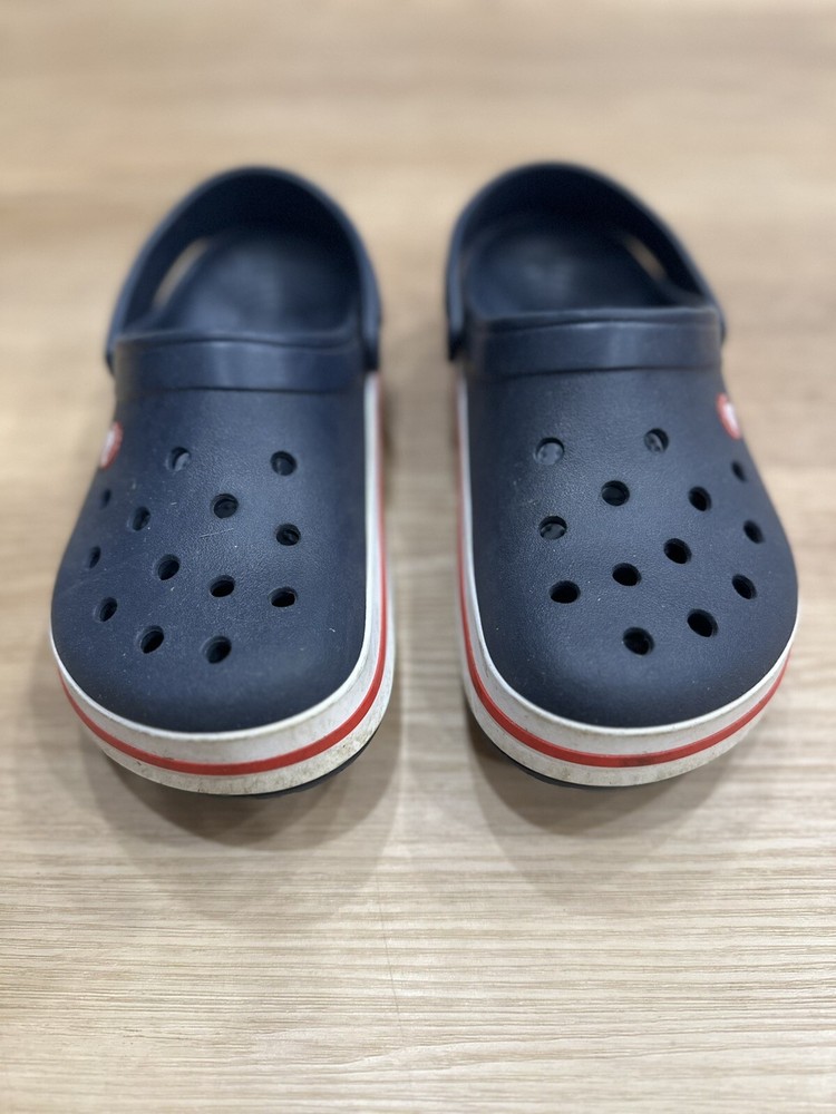The Crocs Crocband Slip On Clog in Navy Pepper is a unisex kids' sandal with a closed toe and slip-on closure. It is made with a rubber upper, lining, and outsole, making it lightweight and comfortable for walking, beach trips, and school activities. The ankle strap feature adds to the comfort and support of the sandal, while the logo accents give it a stylish touch. This sandal is suitable for travel and casual occasions during the summer, fall, and spring seasons. It is a standard-width sandal with a low-top shoe shaft style and is part of the Crocs Crocband product line.