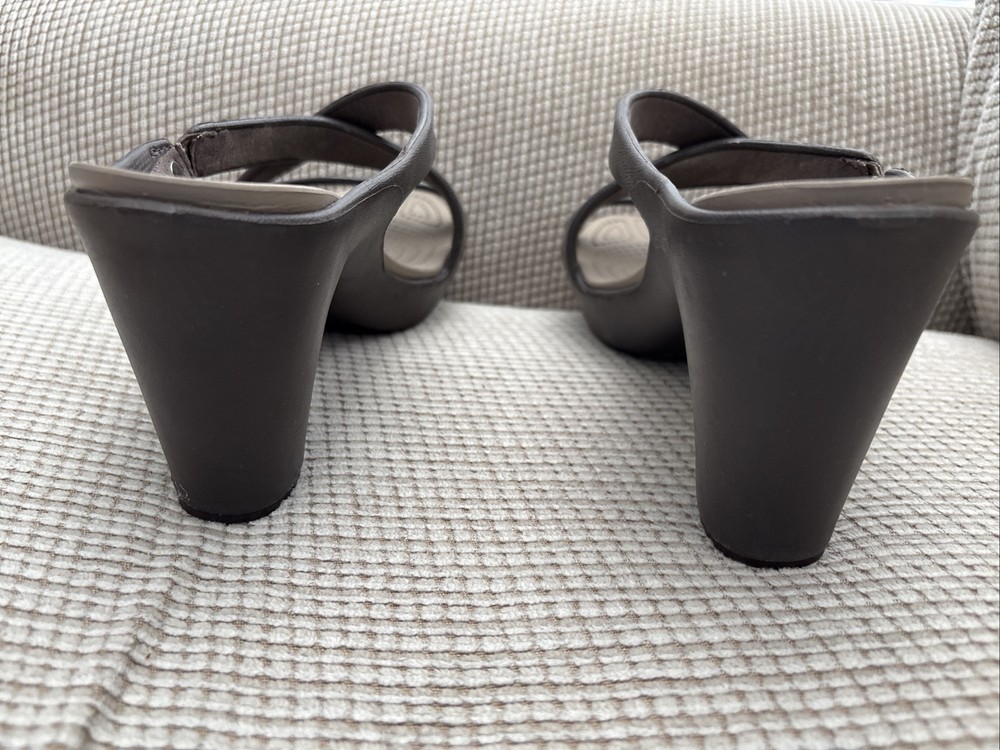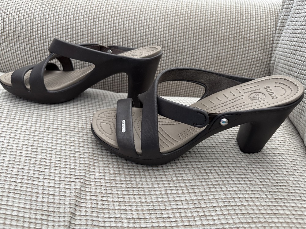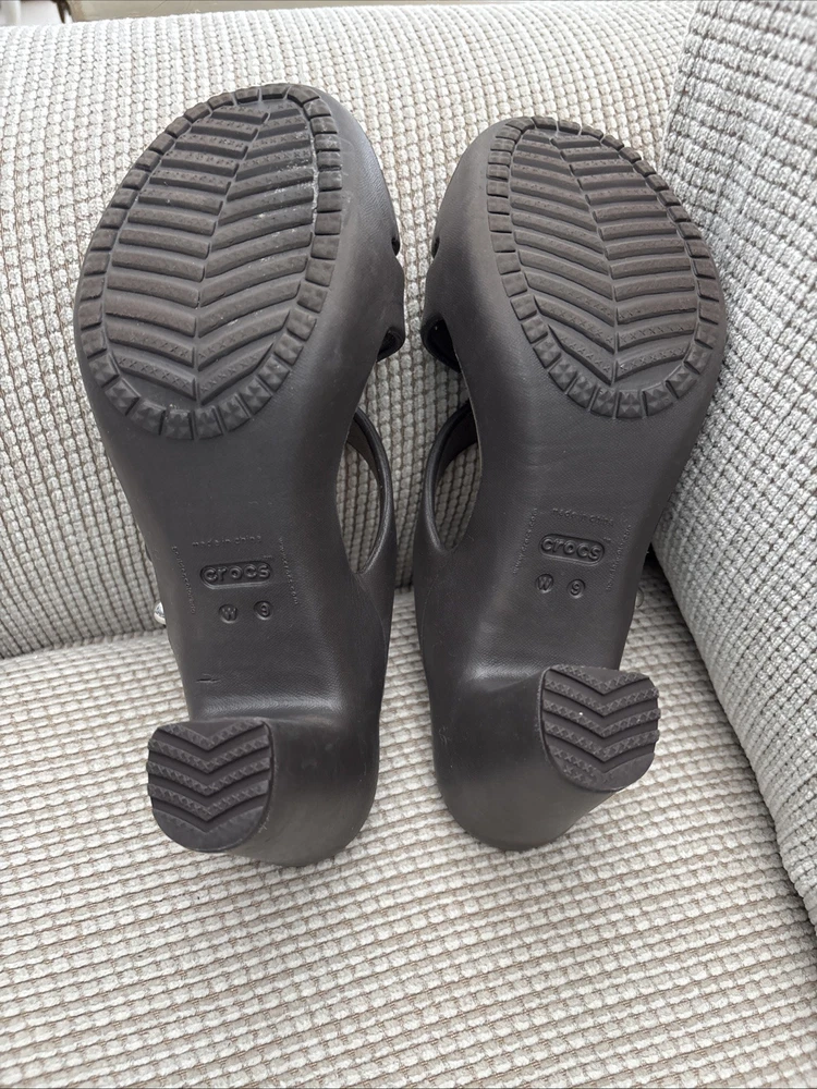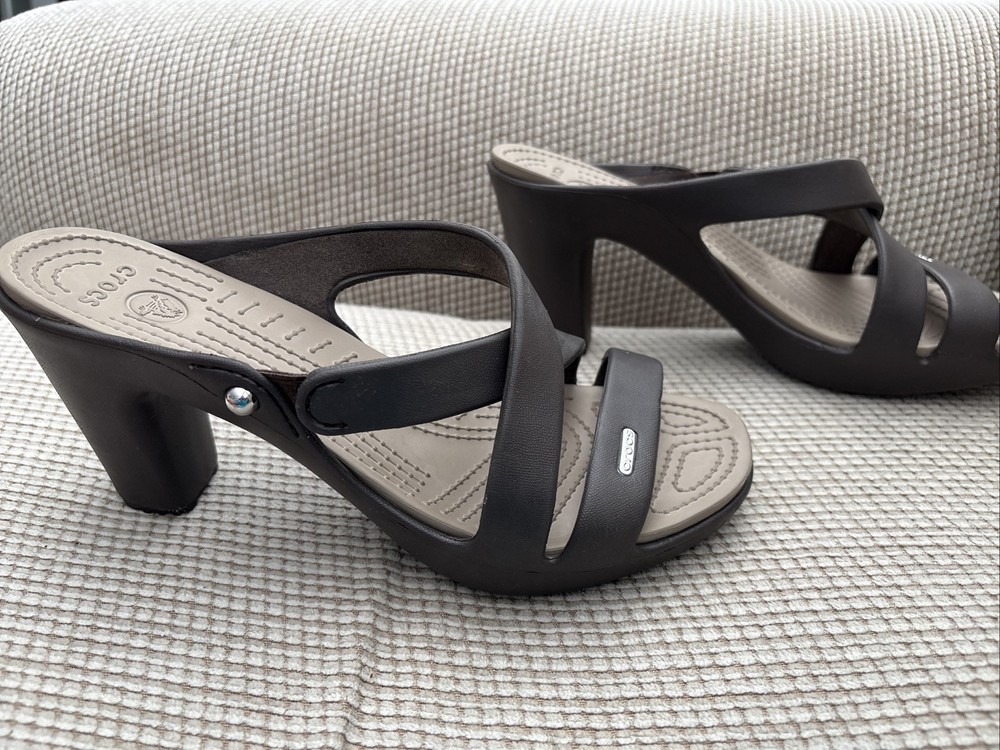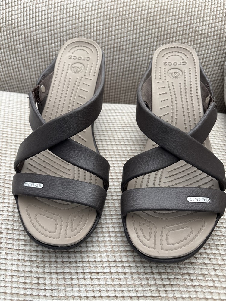 Worn once - The Crocs Cyprus IV Heels Sandals in Brown are designed for women in size 9. These slip-on sandals feature a strappy design with a block heel style, providing a comfortable and stylish option for various occasions like travel, parties, or casual outings. Made with synthetic materials and a rubber outsole, these sandals are suitable for all seasons and offer the perfect blend of fashion and comfort from the well-known brand, Crocs.