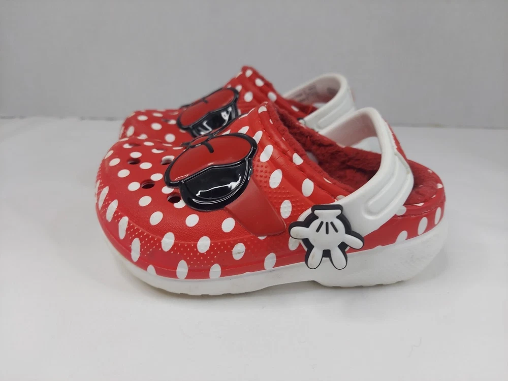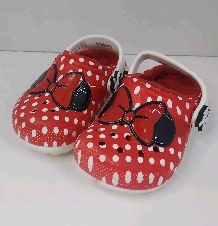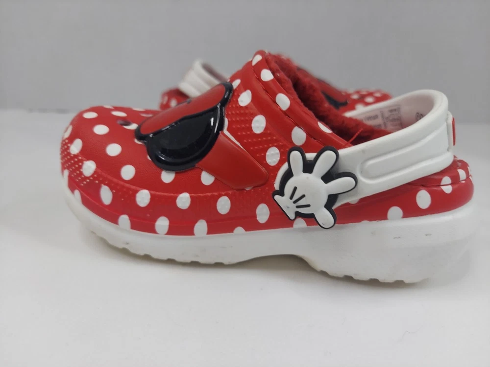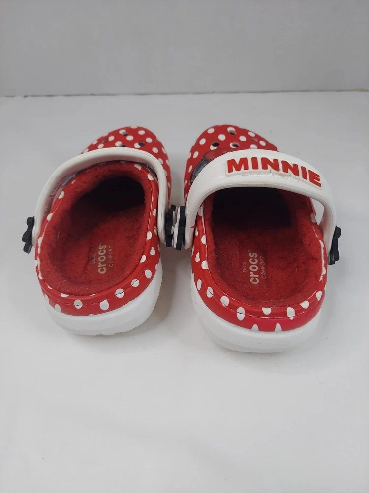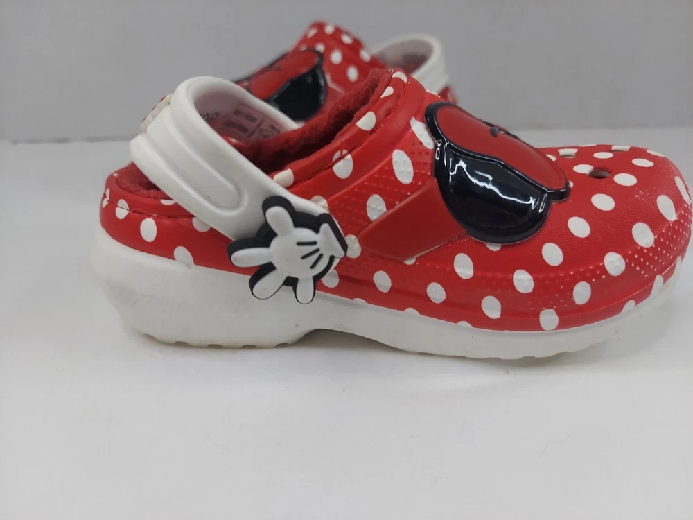 Crocs Shoes Girls 6 Toddler Classic Clogs Minnie Mouse Lined Faux Fur Polka-dot Girls size C6, faux fur lined, Red with white polka-dots Crocs with Minnies Iconic ears and bow on the top. Smoke-free pet friendly Please see the pictures.