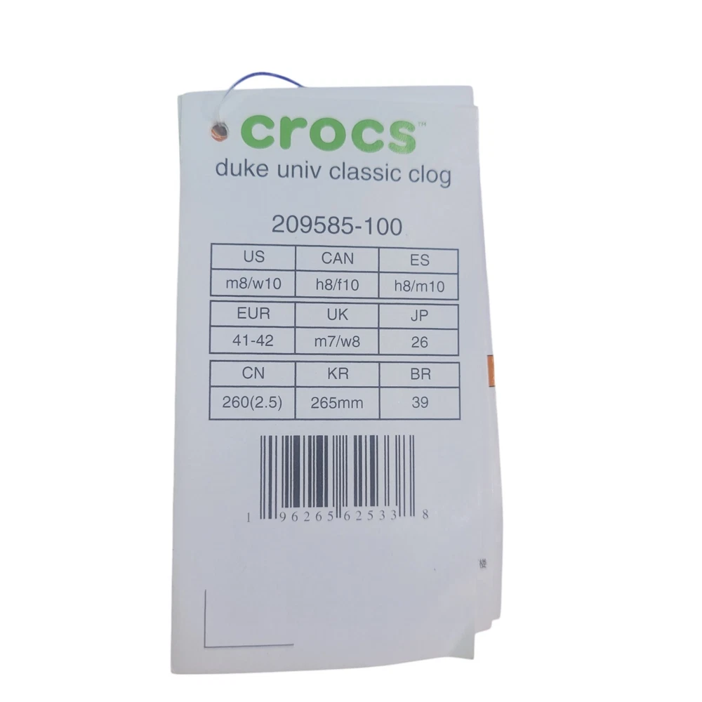 Crocs Duke University Classic Clogs Size Men's 8 Womens 10 (New In Original Bag) This is a pair of Crocs Duke University Classic Clogs in white, designed for both men and women in size Men's 8/Women's 10. These slip-on casual shoes feature a lightweight and breathable EVA upper material, a rubber outsole for comfort and durability, and a standard shoe width. The Crocs brand is known for its comfortable and versatile footwear, making these clogs a stylish and practical choice for everyday wear.