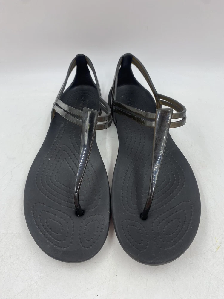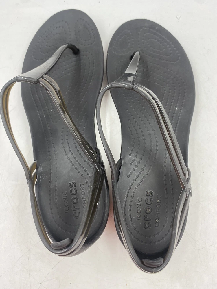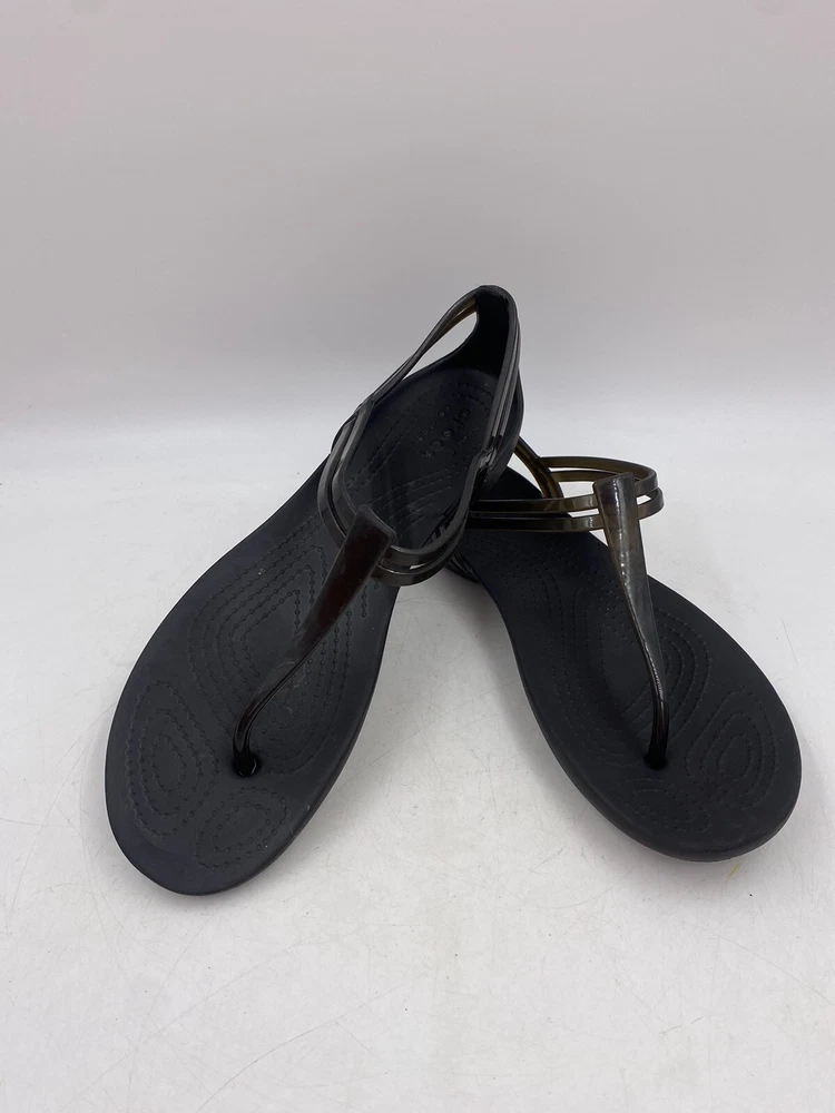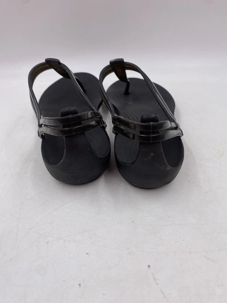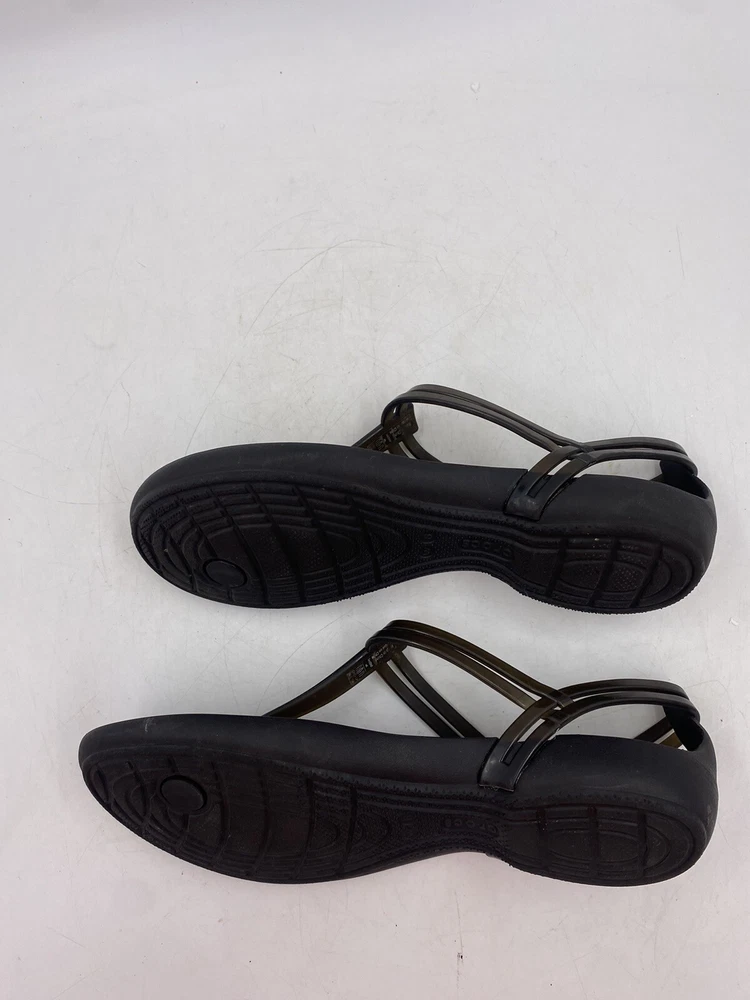 This is a pair of black Crocs Isabella t strap sandals. They are a women's size 6 and are in good overall condition with normal signs of wear. They could have light scuffs or sole wear. You get the actual items pictured so please look at all photos and ask any questions before purchase.