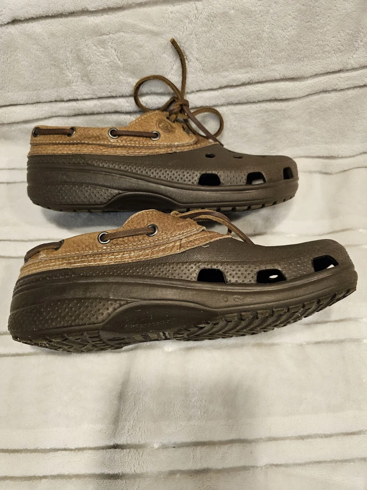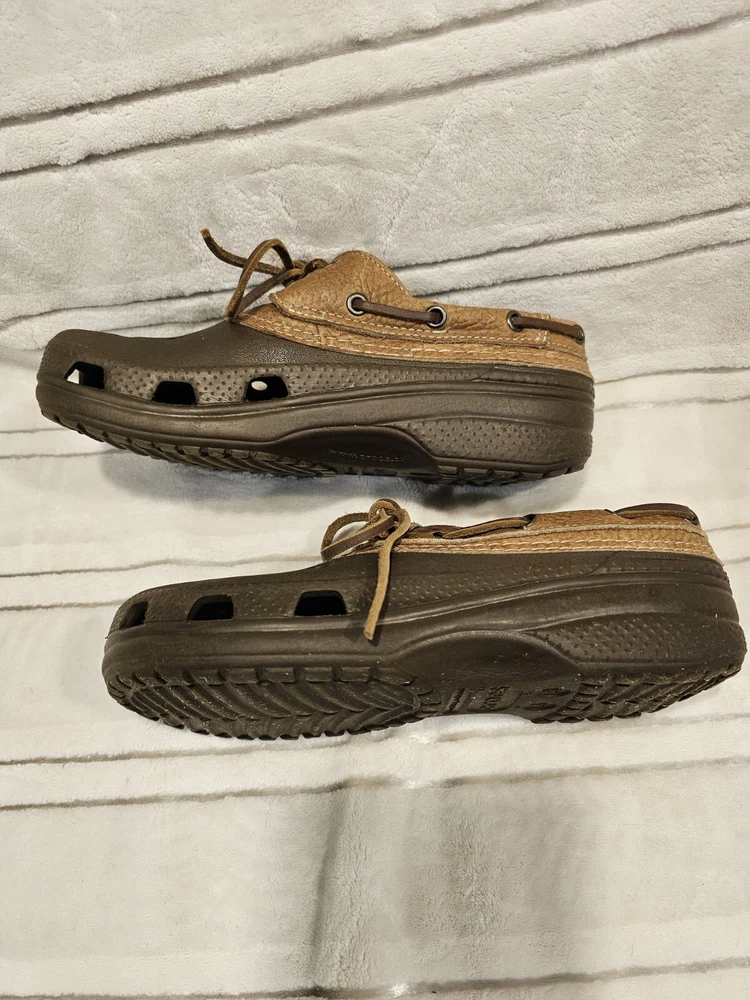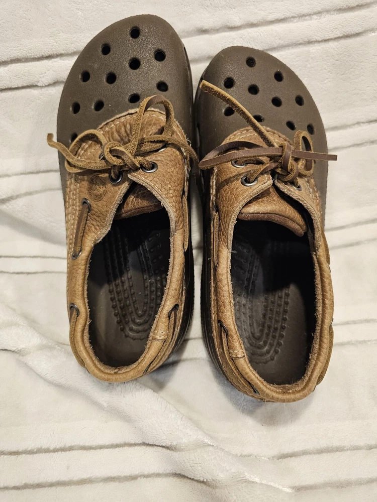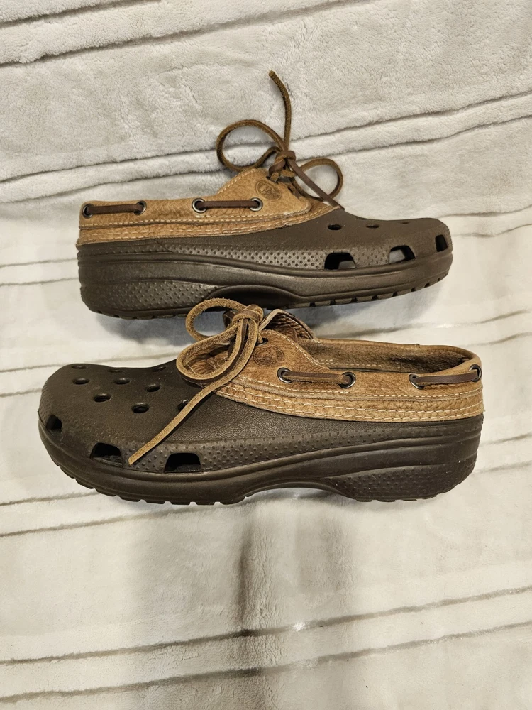Used brown leather and rubber pit crew crocs. Please see pictures for details.