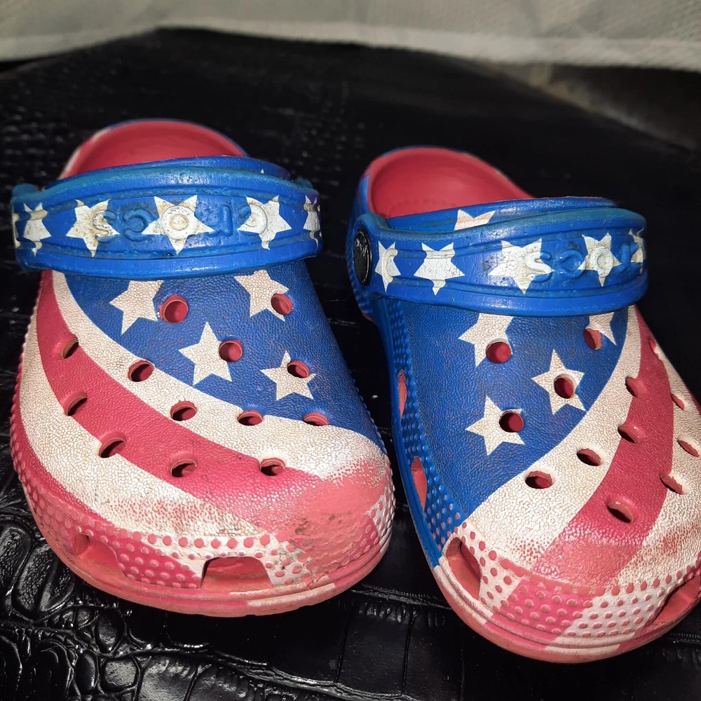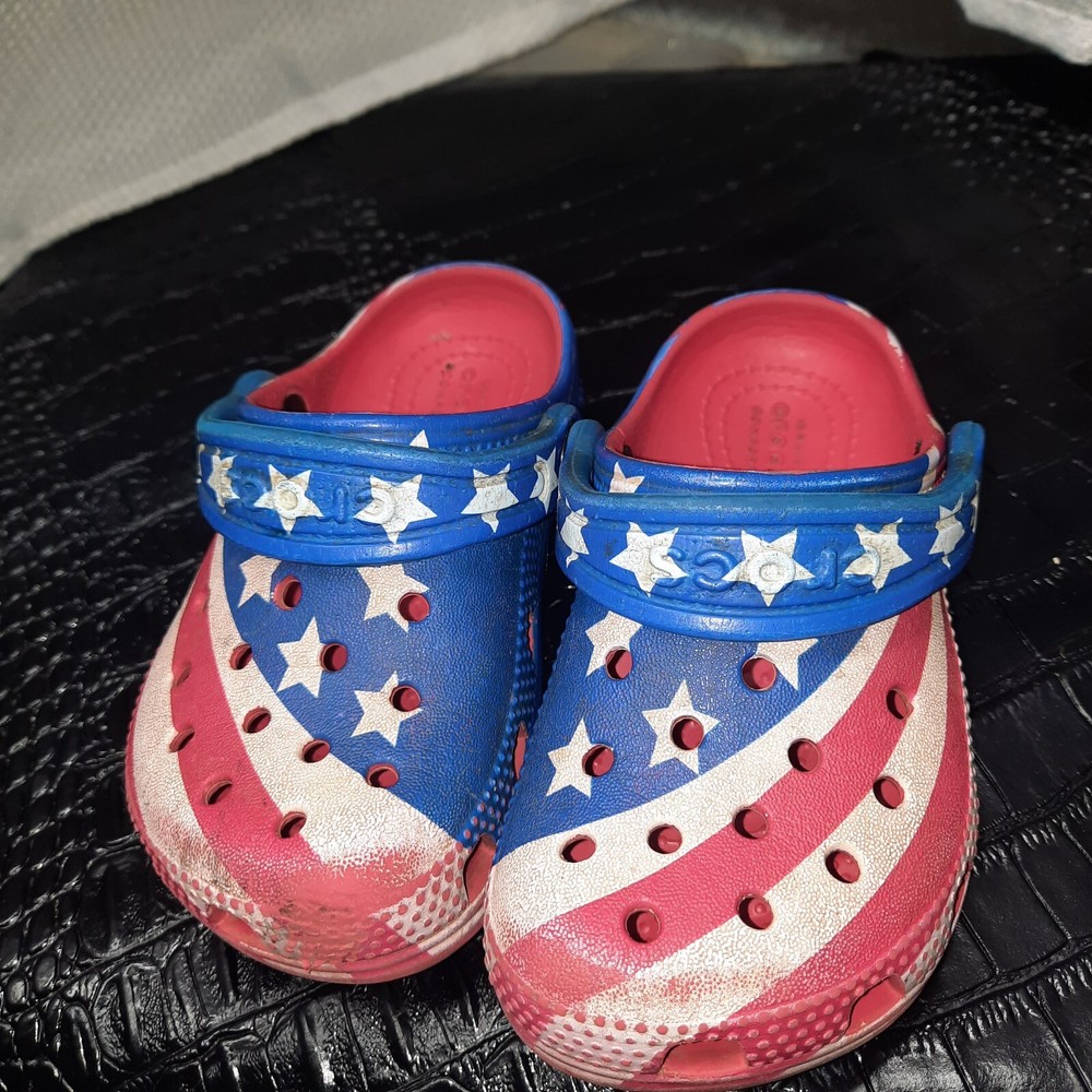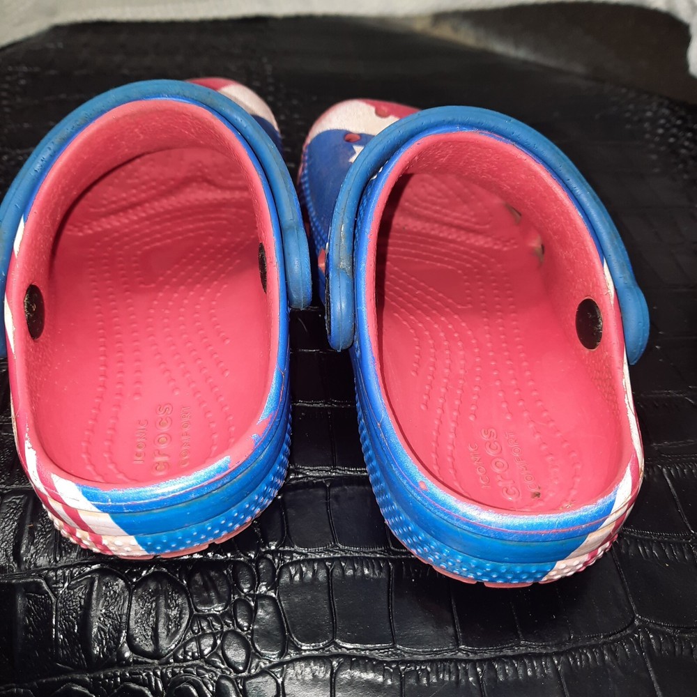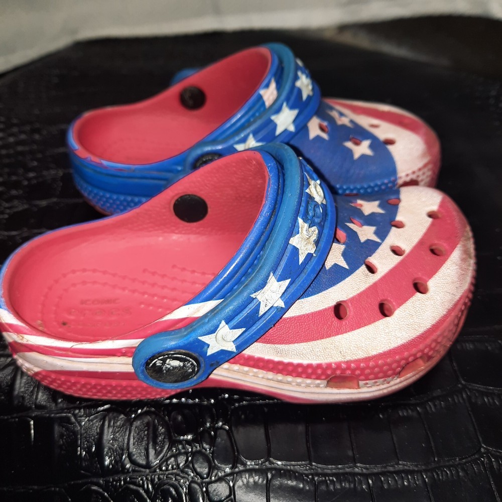 Celebrate the spirit of freedom and patriotism with these Crocs Kids Classic American Flag clogs. The vibrant red, white, and blue color scheme is accented with a bold American flag pattern, making these shoes a perfect choice for any young patriot. The lightweight and comfortable design feature a breathable material that keeps your child's feet cool and comfortable throughout the day. The slip-on design with a round toe shape ensures easy wear and a relaxed fit, while the rubber outsole and upper provide durable wear. These unisex kids' clogs are a perfect addition to any casual wardrobe, and the classic design is sure to be a hit with both parents and kids alike. The Crocs Comfort Slide line is known for its quality and comfort, and these shoes are no exception. Add a touch of American pride to your child's wardrobe with these stylish and comfortable clogs.