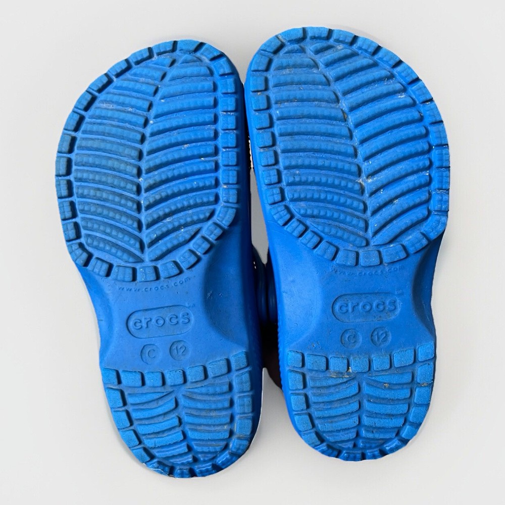 This Crocs Kids' Classic Clog in Blue, size 12, is a slip-on shoe featuring a round toe and a flat heel. Suitable for casual occasions, it is a unisex style perfect for kids in the summer, fall, and spring seasons. The clog has a classic design with a multicolor theme and belongs to the Crocs brand.