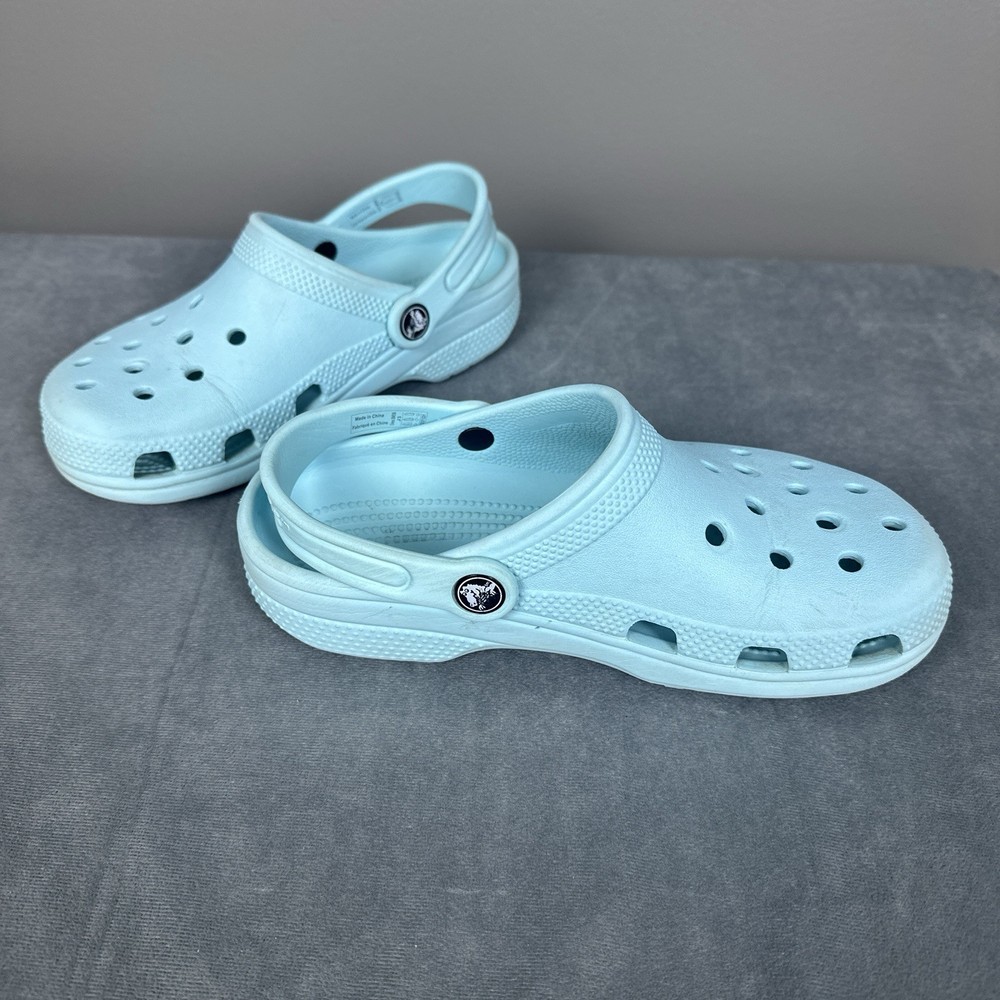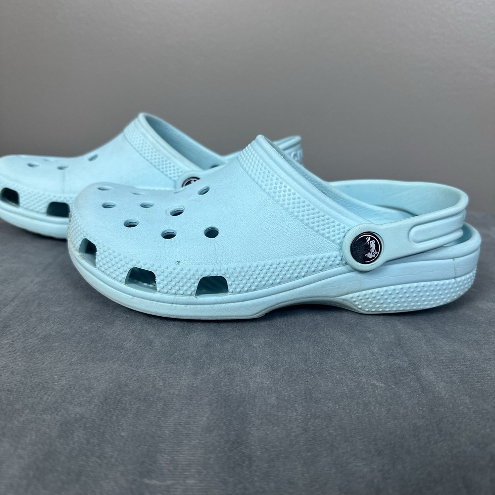 Crocs Kids Classic Clog Size J3 Shoes, light blue/aqua color. Preowned fair to good condition, some discoloration, and some wear on bottom, scuffs on side buttons. Please be sure to see all photos as they are part of the description. Shipping costs are calculated to reflect shipping service rates based on weight and distance traveling. Thank you for looking!