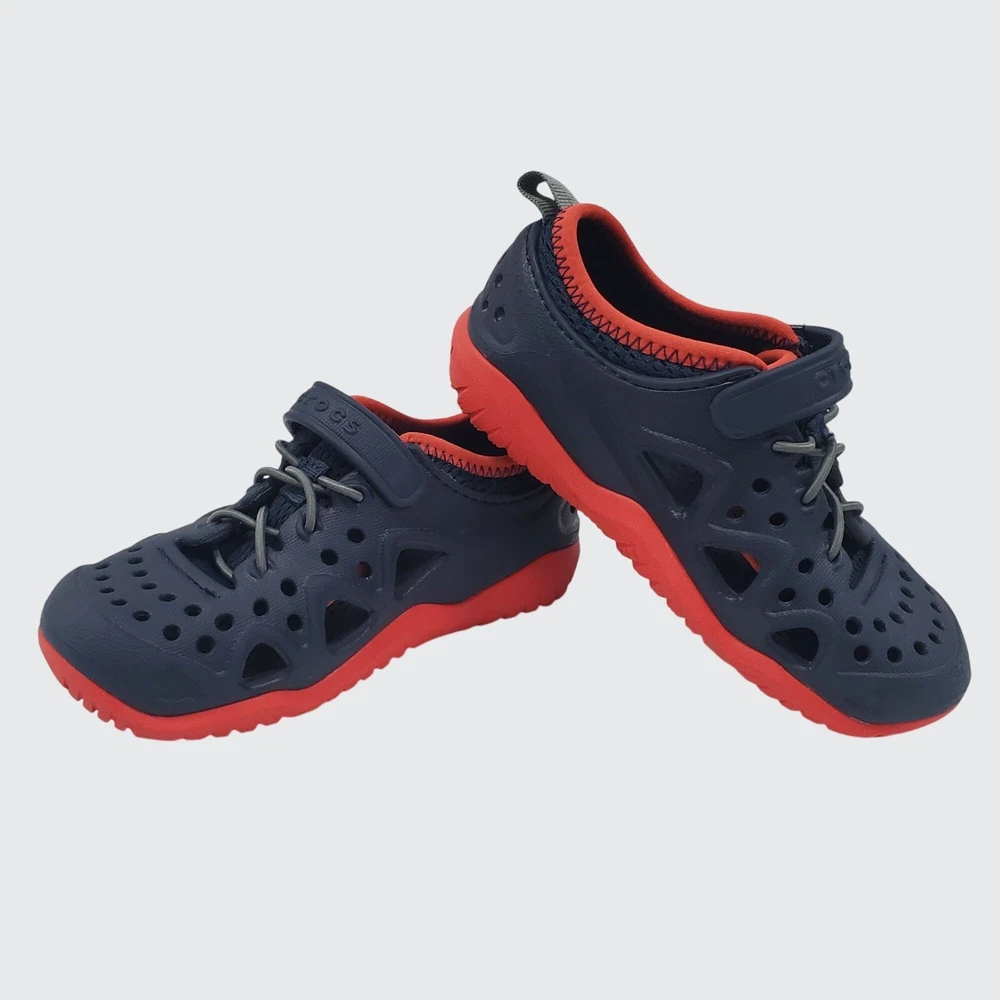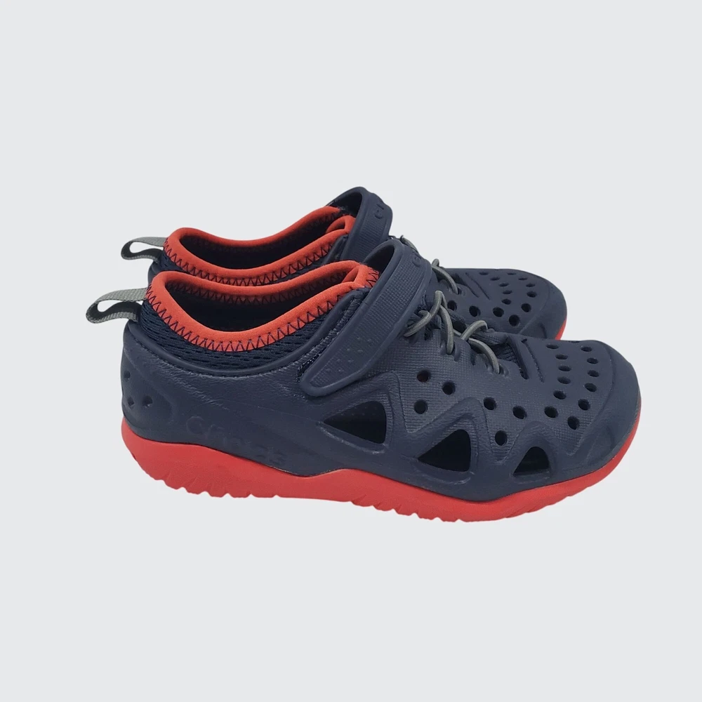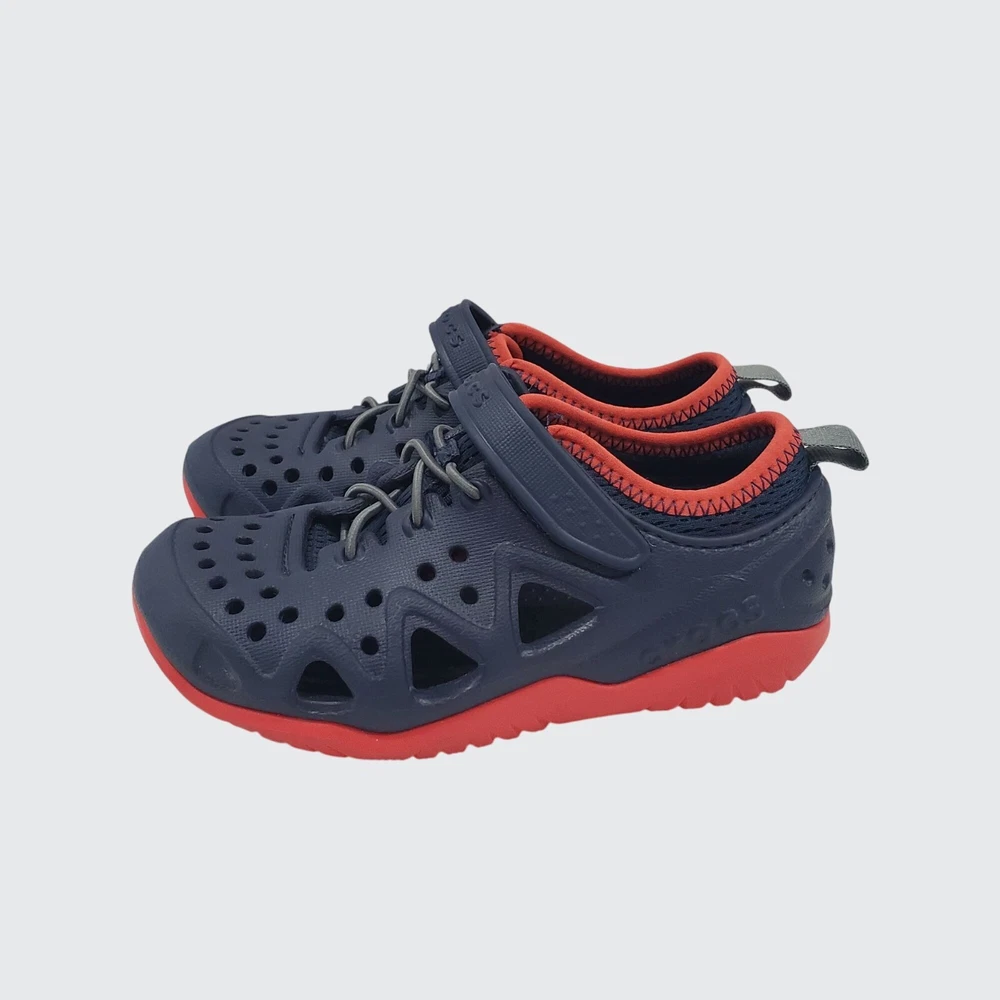 The Crocs Kids Iconic Swiftwater Play Shoes offer comfort and versatility in a stylish navy and red design. Perfect for active kids, these unisex shoes feature a convenient hook and eye closure for easy wear. • Iconic Crocs design • Navy and red colorway • Hook and eye closure • Versatile and comfortable • Perfect for playtime Features: • Water shoes, Outdoor shoe Size: Unisex Kids 11C Condition: Pre-Owned Like New Excellent preowned condition from a pet and smoke free home. All shoes are cleaned and sanitized prior to selling. Please refer to pictures for condition. All offers considered!