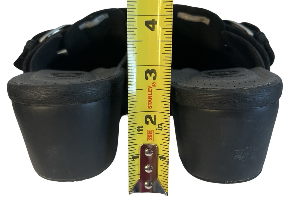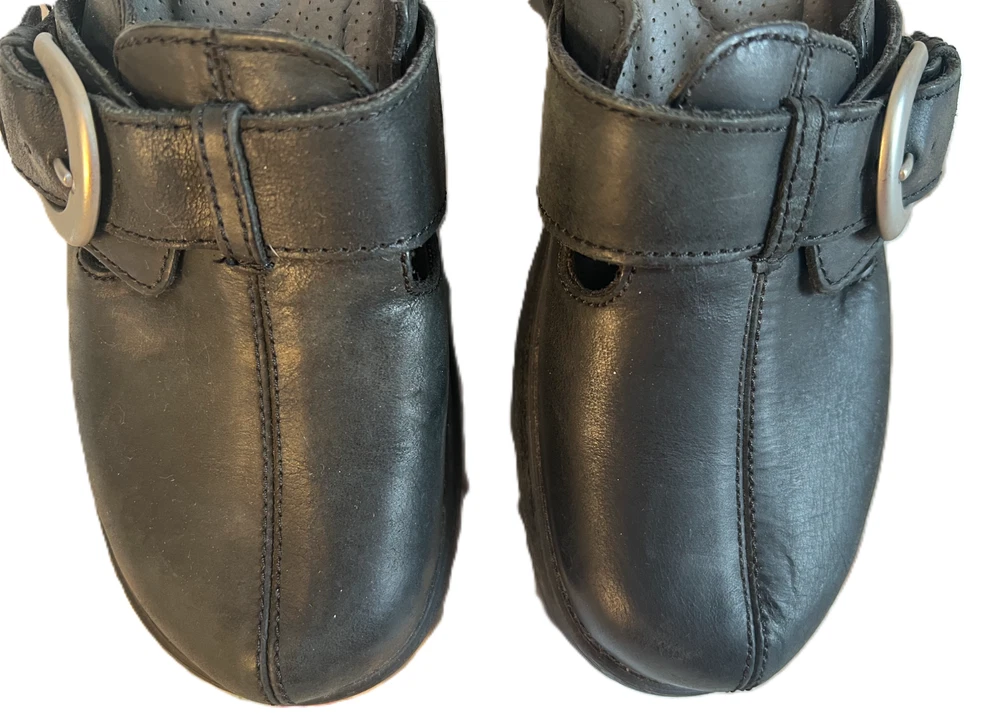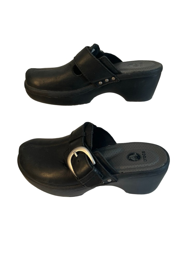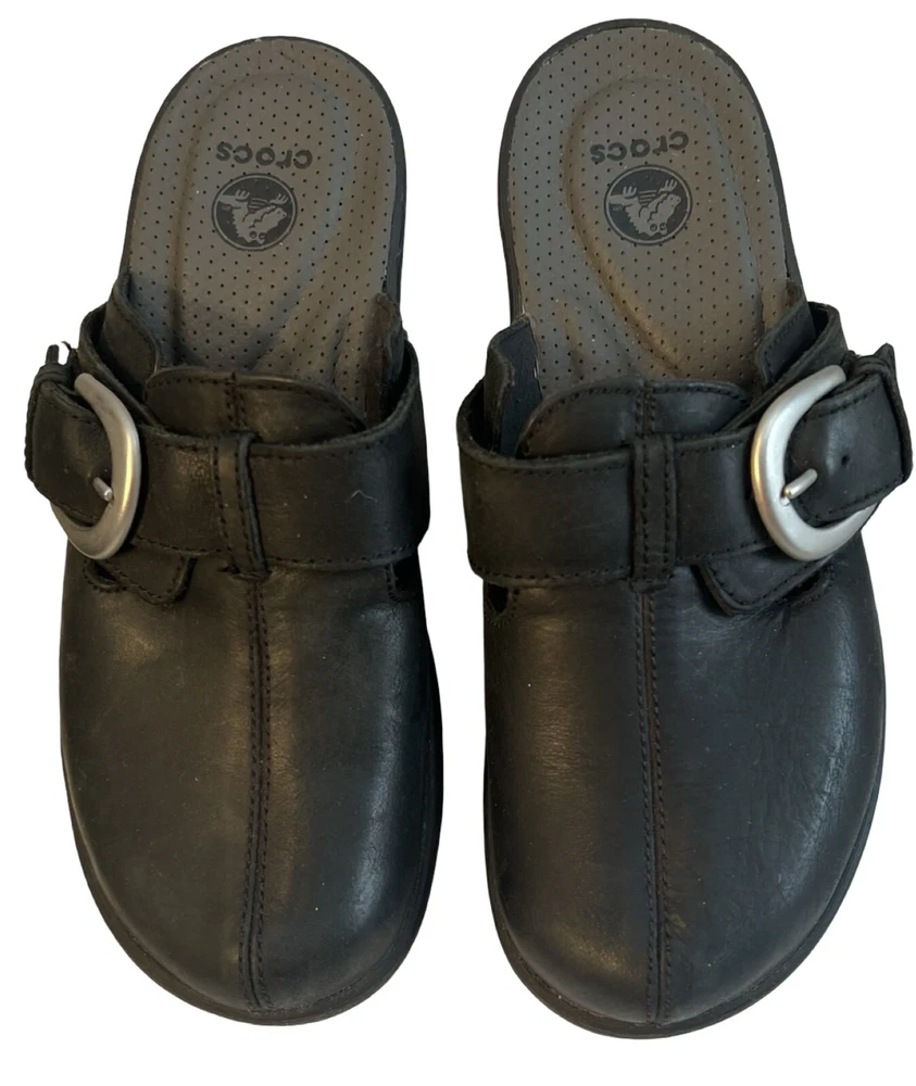 excellent condition | some wear as shown in photos | no marks on the leather These Crocs Leather Clogs in size 6 are stylish and comfortable slip-on shoes for women. They feature a black leather upper with a silver buckle accent. Designed with arch support, and cushioning, they are perfect for travel, workwear, or casual occasions. The clogs have a round toe shape, mid heel height, and are comfortable, making them versatile for all seasons. ** all items stored in smoke-free pet-free home